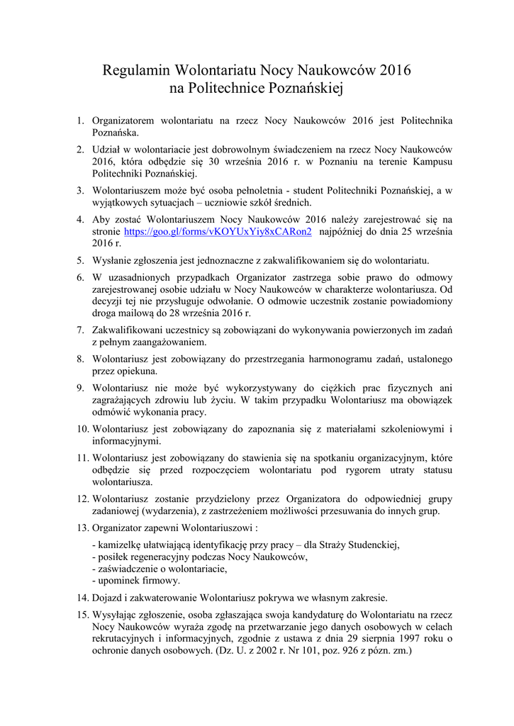 Regulamin Wolontariatu Nocy Naukowców 2016 na Politechnice Poznańskiej 1. Organizatorem wolontariatu na rzecz Nocy Naukowców 2016 jest Politechnika Poznańska. 2. Udział w wolontariacie jest dobrowolnym świadczeniem na rzecz Nocy Naukowców 2016, która odbędzie się 30 września 2016 r. w Poznaniu na terenie Kampusu Politechniki Poznańskiej. 3. Wolontariuszem może być osoba pełnoletnia - student Politechniki Poznańskiej, a w wyjątkowych sytuacjach – uczniowie szkół średnich. 4. Aby zostać Wolontariuszem Nocy Naukowców 2016 należy zarejestrować się na stronie https://goo.gl/forms/vKOYUxYiy8xCARon2 najpóźniej do dnia 25 września 2016 r. 5. Wysłanie zgłoszenia jest jednoznaczne z zakwalifikowaniem się do wolontariatu. 6. W uzasadnionych przypadkach Organizator zastrzega sobie prawo do odmowy zarejestrowanej osobie udziału w Nocy Naukowców w charakterze wolontariusza. Od decyzji tej nie przysługuje odwołanie. O odmowie uczestnik zostanie powiadomiony droga mailową do 28 września 2016 r. 7. Zakwalifikowani uczestnicy są zobowiązani do wykonywania powierzonych im zadań z pełnym zaangażowaniem. 8. Wolontariusz jest zobowiązany do przestrzegania harmonogramu zadań, ustalonego przez opiekuna. 9. Wolontariusz nie może być wykorzystywany do ciężkich prac fizycznych ani zagrażających zdrowiu lub życiu. W takim przypadku Wolontariusz ma obowiązek odmówić wykonania pracy. 10. Wolontariusz jest zobowiązany do zapoznania się z materiałami szkoleniowymi i informacyjnymi. 11. Wolontariusz jest zobowiązany do stawienia się na spotkaniu organizacyjnym, które odbędzie się przed rozpoczęciem wolontariatu pod rygorem utraty statusu wolontariusza. 12. Wolontariusz zostanie przydzielony przez Organizatora do odpowiedniej grupy zadaniowej (wydarzenia), z zastrzeżeniem możliwości przesuwania do innych grup. 13. Organizator zapewni Wolontariuszowi : - kamizelkę ułatwiającą identyfikację przy pracy – dla Straży Studenckiej, - posiłek regeneracyjny podczas Nocy Naukowców, - zaświadczenie o wolontariacie, - upominek firmowy. 14. Dojazd i zakwaterowanie Wolontariusz pokrywa we własnym zakresie. 15. Wysyłając zgłoszenie, osoba zgłaszająca swoja kandydaturę do Wolontariatu na rzecz Nocy Naukowców wyraża zgodę na przetwarzanie jego danych osobowych w celach rekrutacyjnych i informacyjnych, zgodnie z ustawa z dnia 29 sierpnia 1997 roku o ochronie danych osobowych. (Dz. U. z 2002 r. Nr 101, poz. 926 z pózn. zm.)