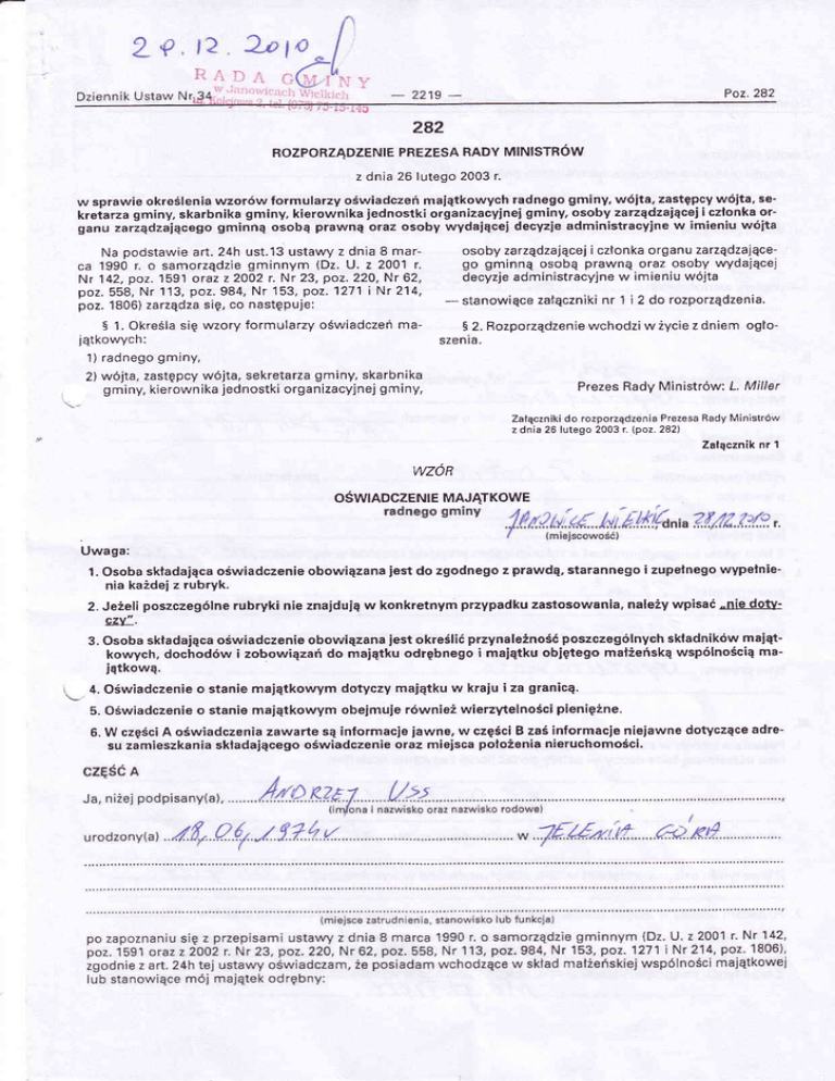 19 - Poz,282 2'82 RozPoRzĄDzEN|EPBEZESARADY MlNlsTEÓW z dnia 26 lutego 2003 r. w sprawie okreś|eniawzorów formuIarzy oświadczeń maiątkowych radnego gminy, wójta, zastępcy wójta, se. kreiarza gminy, skarbnika gminy, kierownika jednostki organizacyjnei gminy, osoby zarzqdzaiqcej i cz|onka organu zarządzaiqcego gminną osobą prawną oraz osoby wydajqcej decyzje administracyjne w imieniu wóita Na podstawie art. 24h ust.13 ustawy z dnia 8 marc a 1 9 9 0 r . o s a m o r z q d z i e g m i n n y m ( D z . U ' z 2 O O 1r . N r 1 4 2 , p o z . 1 5 9 1 o r a z z 2 O O 2r ' N r 2 3 , p o z ' 2 2 o , N r 6 2 , p o z , 5 5 8 , N r 1 ' 1 3 p, o 2 . 9 8 4 ,N r 1 5 3 , p o z . 1 2 7 1 i N r 2 1 4 , poz. 1806) zarządza się, co następuje: osoby zarządzającejicztonka organu zarządzaiącego gminną osobą prawną oraz osoby wydającej d e c y z j e a d m i n i s t r a c y j n ew i m i e n i u w ó j t a _ stanowiącezatącznikinr 1 i 2 do rozporzqdzenia. mawchodziw życiez dniem ogto5 1. określasię wzory formu|arzyoświadczeń 5 2' Flozporządzenie jqtkowych: szen|a' l ) r a d n e g og m i n y , 2) wÓjta,zastępcywójta, sekretarzagminy,skarbnika Prezes Rady Ministrów:L. Miller gminy, gminy,kierownikajednostkiorganizacyjnej \-Zatącznikido rozporzqdzenia Prezesa Rady Ministrów z dnia 26 futego 2003 r. lpoz.2821 Za|ączniknr 1 WZOR oŚWAoczENlE MAJĄTKoWE Uwaga: 1' osoba sktadaiqcaoświadczenieobowiqzanajest do zgodnego z prawdą,starannegoi zupelnegowypelnienia każdeizrubryk. 2. Jeże|iposzczegó|nerubryki nie znajduiąw konkretnymprzypadkuzastosowania,na|eżywpisać .'niedotY. czY". poszczególnychsk|adnikówmająt. przynależność 3. osoba sktadającaoświadczenieobowiązanaiest określić malżeńskąwspólnościąmai maiątku obiętego odrębnego do majątku kowych, dochodów i zobowiązań jątkowq. '.-- 4' oświadczenieo stanie majątkowym dotyczy majqtkuw kraiu iza granicą' 5. oświadczenieo stanie maiątkowym obejmuie również wierzytelnościpieniężne' 5' W częściA oświadczeniazawańe są informacjejawne, w częściB zaśinformacjeniejawnedoĘcząceadre. su,zamieszkaniaskladaiącegooświadczenieoraz mieisca polożenianieruchomości. - D z i e n n i kU s t a w N r 3 4 2220 - Poz.282 t. Z a s o b yp i e n i ę ż n e : -.,;.;;;;;;;,;;;;;;;;;;*;;;;;;; : : i - p a p i e r y w a r t o ś c i o w e :. . . na kwote: il. 3. Gospodarstworolne: 4 , I n n en i e r u c h o m o ś c i : ilt. 1. Posiadamudzialyw spótkachhandIowychz udzialemgminnychosób prawnychlub przedsiębiorcÓw, w których uczestniczą tąkieosoby - na|eżypodać|iczbęi emitentaudzialów: '.....ż.'.....'.........:.':......'..... " " . l " " " " ; " " ' 2. Posiadamudzialyw innychspółkachhandlowych_ należypodać|iczbęi emitentaudziatów: Z tego tytułuosiągnąlem(ętam)w roku ubiegtymdochód w wysokości: - Dziennik Ustaw Nr 34 2 2 2 1- Poz.28?- !v. 1 . P o s i a d a m a k c j e w s p ó t k a c h h a n d l o w y c h z u d z i a t e m g m i n n y c h o s ó b p r a w n y c h I u b p r z e d s i ę b i o r c ó w ,w k t o r y c h u c z e s t n i c z ąt a k i e o s o b y - n a l e ż y p o d a ć | i c z b ęi e m i t e n t a a k c j i : a k c j e t e s t a n o w i q p a k i e t w i ę k s z y n i z 1 o % "a k c j i w s p ó l c e : j Ę ' . . ! i ' ' . . . . . l . l r Z t e g o t y t u ł uo s i ą g n ą t e m ( ę t a mw) r o k u u b i e 2. Posiadam akcje w innych spótkach handtowych - n a | e ż yp o d a ć t i c z b ę i e m i t e n t a a k c j i :' . . ' . . . ' . . , """""'i":"" Z t e g o t y t u t u o s i q g n ą l e m ( ę t a m ) w r o k u u b i e g t y 4 d o c h ó d w w y s o k o ś c i :. ' . . . . . . . . . . , . . . ' V. (nabyłmój malżonek'z wyiączeniemmieniaprzyna|eżnego Naby|em(am) do jego majątkuodrębnego) od Skarbu Państwa,innej państwowejosoby prawnej.jednosteksamorząduterytoriaInego,ich związkówluu oa komunalnejosoby prawnejnastępujące mienie,które pod|egatozbyciuw drodzeprzetargu- na|eży podaćopis mie- vt. 1, 7tego tytutuosiągnąiem(ętam)w roku ubiegtymprzychódi dochÓd w wYsokości: .......'., 2' ZarządzamdzialalnoŚciągospodarcząlub jestemprzedstawicie|em (napelnomocnikiemtakiejdziatalności l e z yp o d a ćf o r m ęp r a w n ąi p r z e d m i o d t z i a l a I n o ś c.i.).:. . . ' . . ' . . . . . . - osobiście vll. (nazwa, W spóikachhand|owych siedzibaspólki): .ru . (o/sła' k/e,7/lŁ.,/o. [5z,?,/al,l,',cI DziennikUstaw Nr 34 - 2222 - Poz.282 Innedochodyosiąganez tytu|uzatrudnienia|ub innejdziatalności zarobkowejIub zajęć,z podaniemkwot uzy- €,K= tx. Zobowiązaniapieniężneo wartościpowyżej1o.oooztotych,w tym zaciągnięte kredyty _ńsokości): i pożyczkioraz warunki, na jakichzostaly udzie|one(wobec kogo, wzwiązku z ja'kimzaaizeniem,'wjltiej DziennikUstaw Nr 34 - 2223 - Poz.282 czĘŚcB iż na podstawieart. 233 5 1 Kodeksu karnegoza podanie niePowyższeoświadczeniesktadam świadomy(a), pozbawienia grozi wo|ności. kara prawdy lub zatajenieprawdy