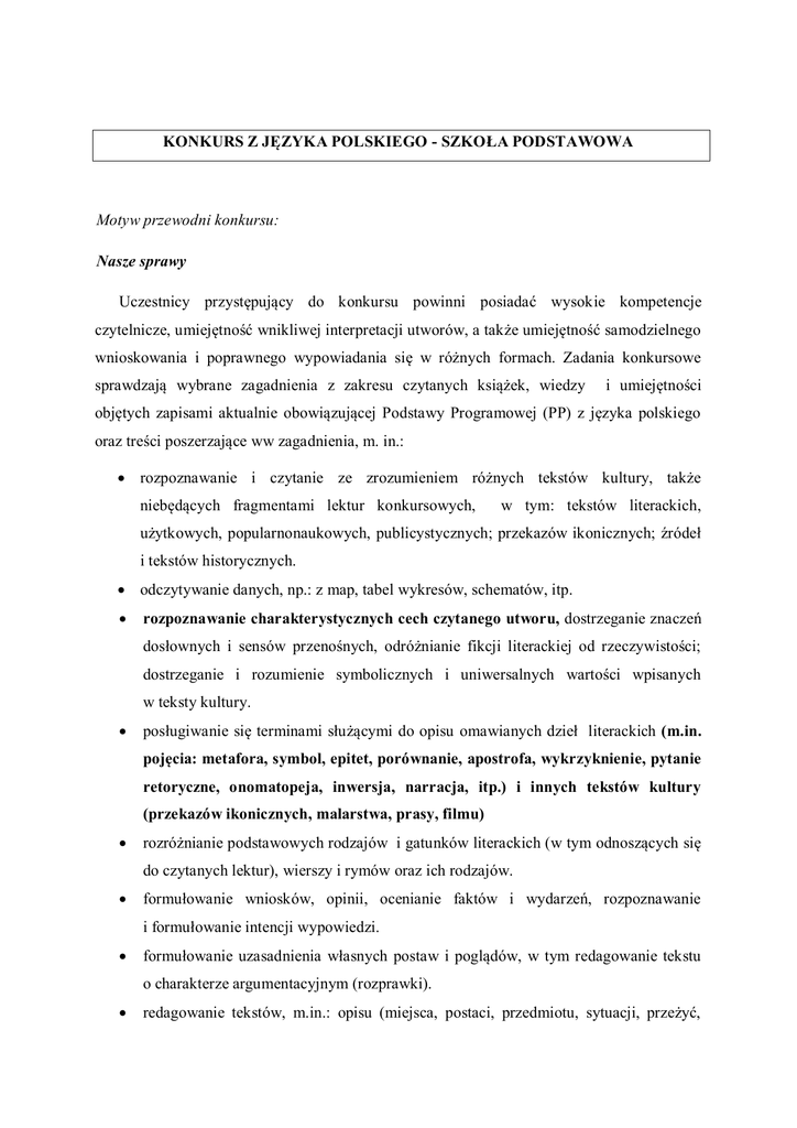 KONKURS Z JĘZYKA POLSKIEGO - SZKOŁA PODSTAWOWA Motyw przewodni konkursu: Nasze sprawy Uczestnicy przystępujący do konkursu powinni posiadać wysokie kompetencje czytelnicze, umiejętność wnikliwej interpretacji utworów, a także umiejętność samodzielnego wnioskowania i poprawnego wypowiadania się w różnych formach. Zadania konkursowe sprawdzają wybrane zagadnienia z zakresu czytanych książek, wiedzy i umiejętności objętych zapisami aktualnie obowiązującej Podstawy Programowej (PP) z języka polskiego oraz treści poszerzające ww zagadnienia, m. in.: rozpoznawanie i czytanie ze zrozumieniem różnych tekstów kultury, także niebędących fragmentami lektur konkursowych, w tym: tekstów literackich, użytkowych, popularnonaukowych, publicystycznych; przekazów ikonicznych; źródeł i tekstów historycznych. odczytywanie danych, np.: z map, tabel wykresów, schematów, itp. rozpoznawanie charakterystycznych cech czytanego utworu, dostrzeganie znaczeń dosłownych i sensów przenośnych, odróżnianie fikcji literackiej od rzeczywistości; dostrzeganie i rozumienie symbolicznych i uniwersalnych wartości wpisanych w teksty kultury. posługiwanie się terminami służącymi do opisu omawianych dzieł literackich (m.in. pojęcia: metafora, symbol, epitet, porównanie, apostrofa, wykrzyknienie, pytanie retoryczne, onomatopeja, inwersja, narracja, itp.) i innych tekstów kultury (przekazów ikonicznych, malarstwa, prasy, filmu) rozróżnianie podstawowych rodzajów i gatunków literackich (w tym odnoszących się do czytanych lektur), wierszy i rymów oraz ich rodzajów. formułowanie wniosków, opinii, ocenianie faktów i wydarzeń, rozpoznawanie i formułowanie intencji wypowiedzi. formułowanie uzasadnienia własnych postaw i poglądów, w tym redagowanie tekstu o charakterze argumentacyjnym (rozprawki). redagowanie tekstów, m.in.: opisu (miejsca, postaci, przedmiotu, sytuacji, przeżyć, krajobrazu, itp.), wzbogaconego kompozycyjnie opowiadania, listu (w tym oficjalnego), mowy, charakterystyki, sprawozdania, recenzji, reklamy, ogłoszenia, zawiadomienia, zaproszenia, dialogu, różnych form notatek (np. encyklopedycznej, informacji prasowej), instrukcji, przepisu, regulaminu, kodeksu, kartki pocztowej, tekstów adresatywnych typu dedykacja (podziękowanie, gratulacje, itp.), biogramu, wywiadu, fragmentu pamiętnika, dziennika, planu (twórczego i odtwórczego) oraz innych przewidzianych w PP. redagowanie twórczych tekstów, np. opowiadania, z obrazowym ujmowaniem epizodów, postaci, scenek, z uwzględnieniem dialogu, opisu, elementów charakterystyki postaci, opowiadanie w roli. formułowanie innych wypowiedzi w formie pisemnej w zależności od adresata, roli, celu, inspirowanych rysunkiem, cytatem, itp. dokonywanie celowych operacji na tekście, np. streszczanie, przekształcanie stylistyczne, przekształcanie mowy niezależnej na zależną. stosowanie środków językowych wzbogacających styl wypowiedzi, rozpoznanie ich i nazywanie. rozumienie i przestrzeganie norm gramatycznych, ortograficznych i interpunkcyjnych na poziomie wyrazu, zdania, akapitu. stosowanie i wyjaśnianie znaczeń synonimów, antonimów, homonimów, zjawiska stylizacji językowej, polisemii. Znajomość leksyki i frazeologii związanej z tematyką konkursu. ujmowanie treści w związkach przyczynowo-skutkowych. posługiwanie się kategoriami czasu i przestrzeni w celu porządkowania wydarzeń: sytuowanie ich w przestrzeni, umieszczanie dat w przedziałach czasowych, nazywanie epok historyczno - literackich, porządkowanie wydarzeń w kolejności chronologicznej z wykorzystaniem w tym celu mapy, tabeli, wykresu. znajomość pojęć, wydarzeń i postaci stanowiących kontekst, np. biograficzny, plastyczny, historyczny dla obowiązujących na danym etapie lektur konkursowych. wskazywanie źródeł informacji, posługiwanie się nimi, porządkowanie i selekcjonowanie ich. integrowanie wiedzy uzyskanej z analizowanych źródeł; wyciąganie wniosków z ich porównywania. wykazanie się funkcjonalną i teoretyczną wiedzą w zakresie podstawowych zagadnień i pojęć z zakresu gramatyki języka polskiego np. wszystkie części mowy, części zdania, rodzaje wypowiedzeń, rodzaje zdań złożonych współrzędnie i podrzędnie oraz zgodnie z zapisami aktualnie obowiązującej PP (czyt. PP: Świadomość językowa uczniów). Uwaga! Uczestnicy etapu szkolnego i rejonowego powinni znać teksty literackie wskazane w spisie lektur dla odpowiedniej części konkursu. W etapie wojewódzkim obowiązuje znajomość wszystkich lektur. Lektury ETAP I: F. Hudson Burnett, Tajemniczy ogród L. Maud Montgomery, Ania z Zielonego Wzgórza M. Witcher, Dziewczynka z szóstego księżyca J. Olech, Dynastia Miziołków M. Musierowicz, Kwiat kalafiora T. Jansson, Opowiadania z Doliny Muminków K. Makuszyński, Szatan z siódmej klasy K. Paterson, Most do Therabithii, I. Jurgielewiczowa, Ten obcy, Inna ETAP II ETAP III