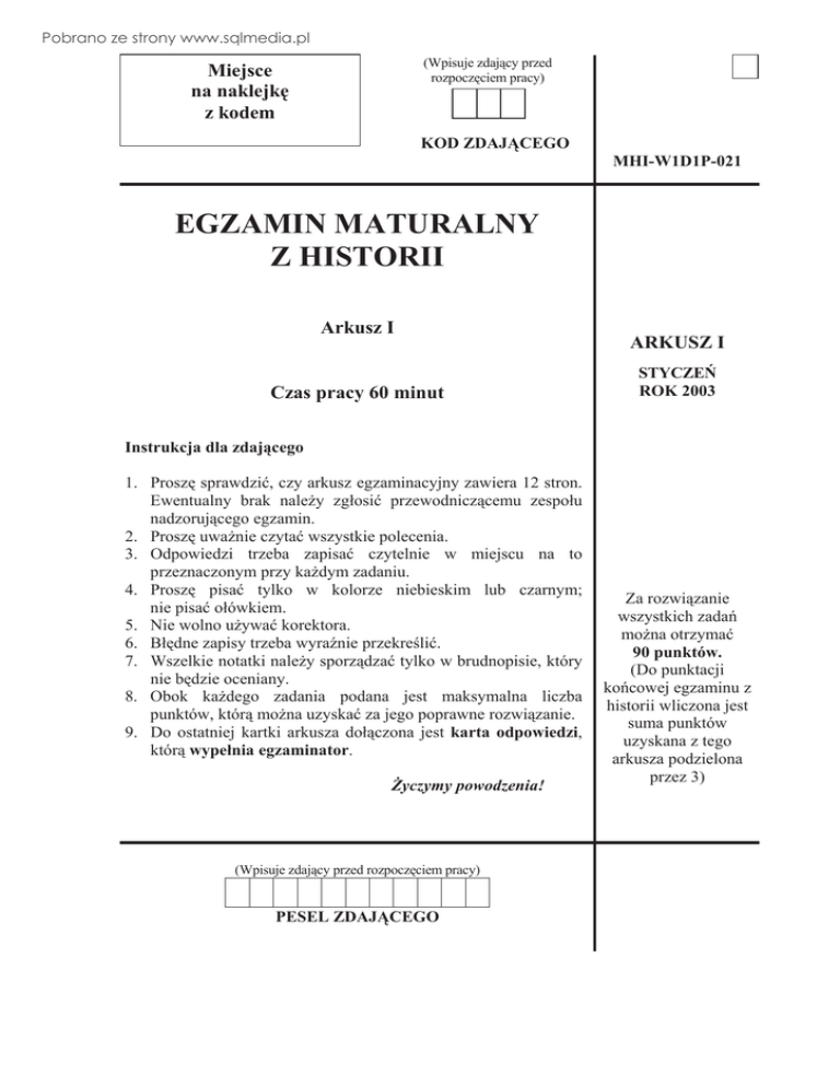 Pobrano ze strony www.sqlmedia.pl (Wpisuje zdający przed rozpoczĊciem pracy) Miejsce na naklejkĊ z kodem KOD ZDAJĄCEGO MHI-W1D1P-021 EGZAMIN MATURALNY Z HISTORII Arkusz I Czas pracy 60 minut ARKUSZ I STYCZEē ROK 2003 Instrukcja dla zdającego 1. ProszĊ sprawdziü, czy arkusz egzaminacyjny zawiera 12 stron. Ewentualny brak naleĪy zgáosiü przewodniczącemu zespoáu nadzorującego egzamin. 2. ProszĊ uwaĪnie czytaü wszystkie polecenia. 3. Odpowiedzi trzeba zapisaü czytelnie w miejscu na to przeznaczonym przy kaĪdym zadaniu. 4. ProszĊ pisaü tylko w kolorze niebieskim lub czarnym; nie pisaü oáówkiem. 5. Nie wolno uĪywaü korektora. 6. BáĊdne zapisy trzeba wyraĨnie przekreĞliü. 7. Wszelkie notatki naleĪy sporządzaü tylko w brudnopisie, który nie bĊdzie oceniany. 8. Obok kaĪdego zadania podana jest maksymalna liczba punktów, którą moĪna uzyskaü za jego poprawne rozwiązanie. 9. Do ostatniej kartki arkusza doáączona jest karta odpowiedzi, którą wypeánia egzaminator. ĩyczymy powodzenia! (Wpisuje zdający przed rozpoczĊciem pracy) PESEL ZDAJĄCEGO Za rozwiązanie wszystkich zadaĔ moĪna otrzymaü 90 punktów. (Do punktacji koĔcowej egzaminu z historii wliczona jest suma punktów uzyskana z tego arkusza podzielona przez 3) Pobrano ze strony www.sqlmedia.pl 2 Egzamin maturalny z historii Arkusz I Zadanie 1. (2 pkt) Nazwij rodzaje pisma przedstawione na ilustracjach. Zadanie 2. (4 pkt) Do kaĪdego z podanych osiągniĊü dopisz nazwĊ paĔstwa, któremu zawdziĊczamy wskazane osiągniĊcie. a) cyfry arabskie .................................................. b) porcelana .................................................. c) podziaá doby na 24 godziny .................................................. d) pismo alfabetyczne .................................................. Zadanie 3. (3 pkt) Do podanych objaĞnieĔ przyporządkuj pojĊcia. ustrój, w którym peániĊ wáadzy mają kapáani wiara w wielu bogów zbiór norm prawnych a) index b) kodeks c) politeizm d) teokracja e) oligarchia Zadanie 4. (1 pkt) Nazwij formĊ ustrojową opisaną w poniĪszym Ĩródle. Byá on pierwszym, który nosiá wyszukane, záotem tkane, jedwabne szaty i znajdowaá upodobanie w obuwiu purpurowym, wysadzanym drogimi kamieniami [...] JeĞli to juĪ jest dowodem zarozumiaáoĞci, pychy i chĊci wynoszenia siĊ ponad innych rzymskich obywateli, to jest to drobnostka w porównaniu do tego, Īe pierwszy od czasów Kaliguli i Domicjana poleciá tytuáowaü siĊ publicznie panem i bogiem i przy powitaniu czeĞü boską sobie oddawaü. [...] ............................................................................................................................................. Pobrano ze strony www.sqlmedia.pl Egzamin maturalny z historii Arkusz I 3 Zadanie 5. (4 pkt) Dopisz daty do poniĪszych wydarzeĔ. – koronacja cesarska Karola Wielkiego .................................. – bitwa pod Hastings .................................. – koronacja cesarska Ottona I .................................. – synod w Clermont .................................. Zadanie 6. (1 pkt) PodkreĞl, kto byá autorem „ĩywota Karola Wielkiego”. Thietmar, Gall Anonim, Einhard, Nestor Zadanie 7. (6 pkt) Korzystając z wiedzy pozaĨródáowej, przeanalizuj wykres i wyjaĞnij, dlaczego nastąpiáo nasilenie akcji lokacyjnej na ziemiach polskich ok. roku: 1260 – ..................................................................................................................................................... ................................................................................................................................................................. 1300 – ..................................................................................................................................................... ................................................................................................................................................................. 1370 – ..................................................................................................................................................... ................................................................................................................................................................. Pobrano ze strony www.sqlmedia.pl Egzamin maturalny z historii Arkusz I 4 Zadanie 8. (2 pkt) Nazwij style architektoniczne, przedstawione na ilustracjach. Zadanie 9. (3 pkt) PodkreĞl 3 nazwy roĞlin sprowadzonych do Europy z Ameryki w XVI wieku. kukurydza, kawa, ryĪ, ziemniaki, herbata, pieprz, pomidory, pszenica, saáata Zadanie 10. (3 pkt) PodkreĞl nazwy 3 paĔstw, które w wojnie trzydziestoletniej walczyáy po stronie protestantów. Austria, Czechy, Rzeczpospolita, Francja, Szwecja, Bawaria Zadanie 11. (6 pkt) Uzupeánij tabelĊ. Bitwa Rok Dowódca (imiĊ i nazwisko) Kircholm ......................... ..................................................... ...................................... ......................... Stanisáaw ĩóákiewski Cecora ......................... ..................................................... Pobrano ze strony www.sqlmedia.pl Egzamin maturalny z historii Arkusz I 5 Zadanie 12. (6 pkt) WyjaĞnij pojĊcia: a) interrex ............................................................................................................................................... ................................................................................................................................................................. b) konwokacja ........................................................................................................................................ ................................................................................................................................................................. c) elekcja viritim ...............