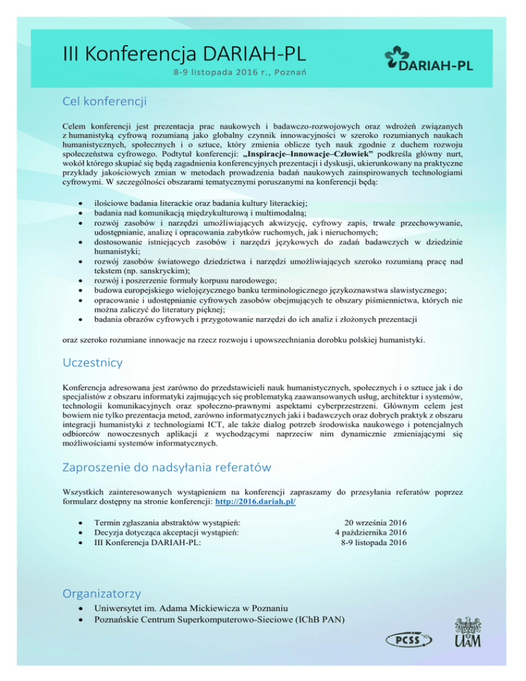 III Konferencja DARIAH-PL 8-9 listopada 2016 r., Poznań Cel konferencji Celem konferencji jest prezentacja prac naukowych i badawczo-rozwojowych oraz wdrożeń związanych z humanistyką cyfrową rozumianą jako globalny czynnik innowacyjności w szeroko rozumianych naukach humanistycznych, społecznych i o sztuce, który zmienia oblicze tych nauk zgodnie z duchem rozwoju społeczeństwa cyfrowego. Podtytuł konferencji: „Inspiracje–Innowacje–Człowiek” podkreśla główny nurt, wokół którego skupiać się będą zagadnienia konferencyjnych prezentacji i dyskusji, ukierunkowany na praktyczne przykłady jakościowych zmian w metodach prowadzenia badań naukowych zainspirowanych technologiami cyfrowymi. W szczególności obszarami tematycznymi poruszanymi na konferencji będą: ilościowe badania literackie oraz badania kultury literackiej; badania nad komunikacją międzykulturową i multimodalną; rozwój zasobów i narzędzi umożliwiających akwizycję, cyfrowy zapis, trwałe przechowywanie, udostępnianie, analizę i opracowania zabytków ruchomych, jak i nieruchomych; dostosowanie istniejących zasobów i narzędzi językowych do zadań badawczych w dziedzinie humanistyki; rozwój zasobów światowego dziedzictwa i narzędzi umożliwiających szeroko rozumianą pracę nad tekstem (np. sanskryckim); rozwój i poszerzenie formuły korpusu narodowego; budowa europejskiego wielojęzycznego banku terminologicznego językoznawstwa slawistycznego; opracowanie i udostępnianie cyfrowych zasobów obejmujących te obszary piśmiennictwa, których nie można zaliczyć do literatury pięknej; badania obrazów cyfrowych i przygotowanie narzędzi do ich analiz i złożonych prezentacji oraz szeroko rozumiane innowacje na rzecz rozwoju i upowszechniania dorobku polskiej humanistyki. Uczestnicy Konferencja adresowana jest zarówno do przedstawicieli nauk humanistycznych, społecznych i o sztuce jak i do specjalistów z obszaru informatyki zajmujących się problematyką zaawansowanych usług, architektur i systemów, technologii komunikacyjnych oraz społeczno-prawnymi aspektami cyberprzestrzeni. Głównym celem jest bowiem nie tylko prezentacja metod, zarówno informatycznych jaki i badawczych oraz dobrych praktyk z obszaru integracji humanistyki z technologiami ICT, ale także dialog potrzeb środowiska naukowego i potencjalnych odbiorców nowoczesnych aplikacji z wychodzącymi naprzeciw nim dynamicznie zmieniającymi się możliwościami systemów informatycznych. Zaproszenie do nadsyłania referatów Wszystkich zainteresowanych wystąpieniem na konferencji zapraszamy do przesyłania referatów poprzez formularz dostępny na stronie konferencji: http://2016.dariah.pl/ Termin zgłaszania abstraktów wystąpień: Decyzja dotycząca akceptacji wystąpień: III Konferencja DARIAH-PL: 20 września 2016 4 października 2016 8-9 listopada 2016 Organizatorzy Uniwersytet im. Adama Mickiewicza w Poznaniu Poznańskie Centrum Superkomputerowo-Sieciowe (IChB PAN)