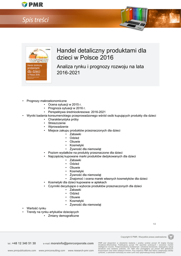 Handel detaliczny produktami dla dzieci w Polsce 2016 Analiza rynku i prognozy rozwoju na lata 2016-2021 • • • • Prognozy makroekonomiczne • Ocena sytuacji w 2015 r. • Prognoza sytuacji w 2016 r. • Perspektywa średniookresowa: 2016-2021 Wyniki badania konsumenckiego przeprowadzonego wśród osób kupujących produkty dla dzieci • Charakterystyka próby • Streszczenie • Wprowadzenie • Miejsce zakupu produktów przeznaczonych dla dzieci • Zabawki • Odzież • Obuwie • Kosmetyki • Żywność dla niemowląt • Poziom wydatków na produkty przeznaczone dla dzieci • Najczęściej kupowane marki produktów dedykowanych dla dzieci • Zabawki • Odzież • Obuwie • Kosmetyki • Żywność dla niemowląt • Znajomoć i ocena marek własnych kosmetyków dla dzieci • Kosmetyki dla dzieci kupowane w aptekach • Czynniki decydujące o wyborze produktów przeznaczonych dla dzieci • Zabawki • Odzież • Obuwie • Kosmetyki • Żywność dla niemowląt Wartość rynku Trendy na rynku artykułów dziecięcych • Zmiany demograficzne 1/2 Copyright © PMR. Wszystkie prawa zastrzeżone. tel.: +48 12 340 51 30 www.pmrpublications.com e-mail: [email protected] www.pmrconsulting.com www.research-pmr.com PMR jest ekspertem w dziedzinie badania i analizy rynków ponad 25 krajów Europy Środkowo-Wschodniej. Publikujemy ponad 150 raportów rynkowych i serwisów market intelligence rocznie. Przeprowadzamy konferencje i szkolenia biznesowe, realizujemy usługi doradcze oraz badania rynkowe. Od 1995 roku pomogliśmy już ponad 500 globalnym korporacjom oraz wielu lokalnym firmom. Przy wsparciu PMR nasi klienci zwiększają udziały rynkowe, z sukcesem wchodzą na nowe rynki oraz optymalizują koszty działalności. • • • • • Nowe marki na rynku • Ekspansja polskich marek na rynki zagraniczne • Franczyza jako strategia rozwoju graczy z branży • Rozwój sprzedaży internetowej • Sklepy wielkopowierzchniowe aktywnie rozwijają sprzedaż produktów dla dzieci • Centra handlowe w Polsce rozszerzają swoją ofertę dla rodziców z dziećmi • Rośnie popularność tzw. „smart toys” • Wzrost sprzedaży licencjonowanych zabawek • Gracze z innych branż dostrzegają potencjał produktów dla dzieci Segmentacja rynku • Odzież i obuwie dla dzieci • Zabawki • Kosmetyki dla dzieci • Wybrane kategorie w segmencie kosmetyków dla dzieci • Żywność dla dzieci i niemowląt • Wybrane kategorie segmentu żywnoci dla niemowląt Kanały dystrybucji • Sklepy wielkopowierzchniowe • Hipermarkety • Supermarkety • Dyskonty • Sklepy niezależne • Sklepy sieciowe z artykułami wyłącznie dziecięcymi • Sklepy sieciowe odzieżowe z działami dla dzieci • Drogerie • Internet Wiodący gracze Profile wybranych graczy • Smyk • 5.10.15. • Coccodrillo • Bartek • Wójcik • Quadri Foglio • Toys R Us • Tup Tup • Toy Planet • Tape a l’oeil Spis treści pochodzi z raportu PMR: Handel detaliczny produktami dla dzieci w Polsce 2016. Analiza rynku i prognozy rozwoju na lata 2016-2021 2/2 Copyright © PMR. Wszystkie prawa zastrzeżone. tel.: +48 12 340 51 30 www.pmrpublications.com e-mail: [email protected] www.pmrconsulting.com www.research-pmr.com PMR jest ekspertem w dziedzinie badania i analizy rynków ponad 25 krajów Europy Środkowo-Wschodniej. Publikujemy ponad 150 raportów rynkowych i serwisów market intelligence rocznie. Przeprowadzamy konferencje i szkolenia biznesowe, realizujemy usługi doradcze oraz badania rynkowe. Od 1995 roku pomogliśmy już ponad 500 globalnym korporacjom oraz wielu lokalnym firmom. Przy wsparciu PMR nasi klienci zwiększają udziały rynkowe, z sukcesem wchodzą na nowe rynki oraz optymalizują koszty działalności.