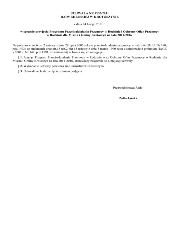 UCHWAŁA NR V/35/2011 RADY MIEJSKIEJ W KROTOSZYNIE z dnia 24 lutego 2011 r. w sprawie przyjęcia Programu Przeciwdziałania Przemocy w Rodzinie i Ochrony Ofiar Przemocy w Rodzinie dla Miasta i Gminy Krotoszyn na lata 2011-2016 Na podstawie art.6 ust.2 ustawy z dnia 29 lipca 2005 roku o przeciwdziałaniu przemocy w rodzinie (Dz.U. Nr 180, poz.1493; ze zmianami) oraz art.18 ust.2 pkt 15 ustawy z dnia 8 marca 1990 roku o samorządzie gminnym (Dz.U. z 2001 r. Nr 142, poz.1591; ze zmianami) uchwala się, co następuje: § 1. Przyjąć Program Przeciwdziałania Przemocy w Rodzinie oraz Ochrony Ofiar Przemocy w Rodzinie dla Miasta i Gminy Krotoszyn na lata 2011-2016, stanowiący załącznik do niniejszej uchwały. § 2. Wykonanie uchwały powierza się Burmistrzowi Krotoszyna. § 3. Uchwała wchodzi w życie z dniem podjęcia. Przewodnicząca Rady Zofia Jamka Uzasadnienie Ustawa o przeciwdziałaniu przemocy w rodzinie wskazała zadania własne gmin, do których w szczególności należy opracowanie gminnego systemu przeciwdziałania przemocy w rodzinie, w tym: 1) opracowanie i realizację gminnego programu przeciwdziałania przemocy w rodzinie oraz ochrony ofiar przemocy w rodzinie; 2) prowadzenie poradnictwa i interwencji w zakresie przeciwdziałania przemocy w rodzinie w szczególności poprzez działania edukacyjne służące wzmocnieniu opiekuńczych i wychowawczych kompetencji rodziców w rodzinach zagrożonych przemocą w rodzinie; 3) zapewnienie osobom dotkniętym przemocą w rodzinie miejsc w ośrodkach wsparcia; 4) tworzenie zespołów interdyscyplinarnych. Przedstawiony Państwu projekt Programu Przeciwdziałania Przemocy w Rodzinie i Ochrony Ofiar Przemocy w Rodzinie dla Miasta i Gminy Krotoszyn na lata 2011-216 stanowić będzie podstawowy dokument, na podstawie którego realizowane będą zadania własne gminy z wyżej cytowanej ustawy. Burmistrz mgr inż. Julian Jokś Załącznik do Uchwały Nr V/35/2011 Rady Miejskiej w Krotoszynie z dnia 24 lutego 2011 r. Program Przeciwdziałania Przemocy w Rodzinie I Ochrony Ofiar Przemocy w Rodzinie dla Miasta i Gminy Krotoszyn na lata 2011-2016 I. Podstawa Prawna 1) Krajowy Program Przeciwdziałania Przemocy w Rodzinie przyjęty Uchwałą Rady Ministrów Nr 162/2006 z dnia 25 września 2006 r. 2) Ustawa z dnia 29 lipca 2005 roku o przeciwdziałaniu przemocy w rodzinie (Dz. U. z 2005 r. Nr 180 poz. 1493 ze zm.). 3) Ustawa z dnia 26 października 1982 roku o wychowaniu w trzeźwości i przeciwdziałaniu alkoholizmowi (j.t. Dz. U. z 2007 r. Nr 70, poz. 473; ze zm.). 4) Ustawa z dnia 12 marca 2004 roku o pomocy społecznej (Dz. U. z 2009 r. Nr 175 poz. 1362; ze zm.). 5) Powiatowy Program Przeciwdziałania Przemocy w Rodzinie przyjęty Uchwałą Nr LIX 269/10 Rady Powiatu Krotoszyńskiego z dnia 29 października 2010 r. 6) Uchwała Nr VII/43/2007 Rady Miejskiej w Krotoszynie z dnia 28 marca 2007 roku w sprawie przyjęcia Strategii Integracji i Rozwiązywania Problemów Społecznych Miasta i Gminy Krotoszyn na lata 2007 – 2013. 7) Uchwała Nr XLVI/339/2010 Rady Miejskiej w Krotoszynie z dnia 28 stycznia 2010 roku w sprawie przyjęcia Gminnego Programu Profilaktyki i Rozwiązywania Problemów Alkoholowych i Narkomanii dla Miasta i Gminy Krotoszyn na rok 2010 8) Dokumenty Unii Europejskiej: a) Karta Praw Podstawowych Unii Europejskiej z 2000 r. b) Rezolucja Parlamentu Europejskiego w sprawie obecnej sytuacji oraz przyszłych działań w zakresie zwalczania przemocy wobec kobiet (2004-2020). c) Opinia Europejskiego Komitetu Ekonomiczno-Społecznego w sprawie przemocy domowej wobec kobiet. 9) Prawo polskie wobec przemocy w rodzinie: a) prawo karne: art. 156, 157, 160 § 2, art. 190, art. 191, art. 197, art. 199, art. 200, art. 207, art. 209, art. 210, art. 211, art. 216 § 1, art. 217, art. 278 § 4, art. 279, art. 284 kodeksu karnego. b) prawo rodzinne i opiekuńcze: art. 52, art. 56, art. 61-65, art. 57, art. 58 § 2 i 3, art. 84 i art. 133 kodeksu rodzinnego i opiekuńczego. II WSTĘP Literatura socjologiczna wprowadza wiele definicji rodziny. Wszystkie one faktycznie sprowadzają się do określenia rodziny jako małej grupy społecznej, grupy niezastąpionej, stanowiącej zalążek szerszej społeczności. Rodzina jest podstawowym elementem struktury społecznej. Stanowi niepowtarzalne środowisko kształtujące osobowość, poglądy, styl życia, system norm i wartości. Ważną rolę w rodzinie odgrywają wzajemne relacje pomiędzy członkami rodziny, oparte na miłości i zrozumieniu. W przypadku dezorganizacji rodzina nie jest w stanie realizować podstawowych zadań. Relacje wewnątrzrodzinne ulegają zaburzeniu, łamane są reguły, a zachowania poszczególnych członków rodziny stają się bardziej niezgodne z normami prawnymi i moralnymi oraz oczekiwaniami społecznymi. Przemoc jest zjawiskiem występującym powszechnie w naszym społeczeństwie i dotyka rodzin o różnym statusie społecznym. Doznawana w rodzinie rodzi konsekwencje niezmiernie głębokie i szkodliwe, dając o sobie znać w postaci zaburzeń emocjonalnych w bliższej lub dalszej perspektywie czasowej. Przemoc w rodzinie, zwana także potocznie przemocą domową, to jednorazowe albo powtarzające się umyślne działanie lub zaniechanie działań koniecznych do ochrony zdrowia i życia, naruszające prawa lub dobra osobiste osób najbliższych (małżonek, wstępny, zstępny, rodzeństwo, powinowaty w tej samej linii lub stopniu, osoba pozostająca w stosunku przysposobienia oraz jej małżonek, osoba pozostająca we wspólnym pożyciu), a także innych osób wspólnie zamieszkujących lub gospodarujących, narażające te osoby w szczególności na niebezpieczeństwo utraty życia, zdrowia, naruszające ich godność, nietykalność cielesną, wolność, w tym seksualną, powodujące szkody na ich zdrowiu fizycznym lub psychicznym, a także wywołujące cierpienia i krzywdy moralne u osób dotkniętych przemocą (art. 2 Ustawy z dnia 29 lipca 2005 r. o przeciwdziałani