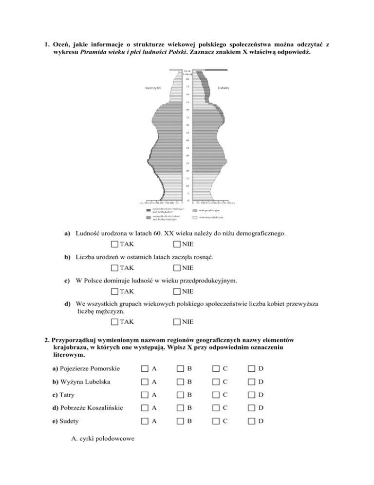 1. Oceń, jakie informacje o strukturze wiekowej polskiego społeczeństwa można odczytać z wykresu Piramida wieku i płci ludności Polski. Zaznacz znakiem X właściwą odpowiedź. a) Ludność urodzona w latach 60. XX wieku należy do niżu demograficznego. TAK NIE b) Liczba urodzeń w ostatnich latach zaczęła rosnąć. TAK NIE c) W Polsce dominuje ludność w wieku przedprodukcyjnym. TAK NIE d) We wszystkich grupach wiekowych polskiego społeczeństwie liczba kobiet przewyższa liczbę mężczyzn. TAK NIE 2. Przyporządkuj wymienionym nazwom regionów geograficznych nazwy elementów krajobrazu, w których one występują. Wpisz X przy odpowiednim oznaczeniu literowym. a) Pojezierze Pomorskie A B C D b) Wyżyna Lubelska A B C D c) Tatry A B C D d) Pobrzeże Koszalińskie A B C D e) Sudety A B C D A. cyrki polodowcowe B. jeziora przybrzeżne C. jeziora rynnowe D. wąwozy lessowe 3. Uzupełnij poniższe zdania wpisując odpowiedzi A–E, w taki sposób, aby zawierały one prawdziwe informacje o Morzu Bałtyckim. Morze Bałtyckie jest zaliczane do mórz chłodnych, ponieważ… . W wodach Morza Bałtyckiego występuje zjawisko eutrofizacji, ponieważ…. A. jego średnia głębokość wynosi około 52 metry. B. powstało w wyniku wytapiania się lądolodu skandynawskiego. C. rzeki dostarczają do niego dużą ilość zanieczyszczeń. D. z Morzem Północnym łączą je wąskie cieśniny. E. leży pomiędzy 54ºN a 66ºN. Tabela do zadań 4 i 5. Poniższa tabela zawiera nazwy wybranych elementów środowiska fizycznogeograficznego państw sąsiadujących z Polską. Elementy środowiska fizycznogeograficznego Nazwa kraju (cyfra) Wełtawa Sudety Śnieżka Wag Niżne Tatry Gerlach Dniepr Karpaty Howerla Ob Ural Elbrus Ren Harz Zugspitze 4. Uzupełnij puste rubryki tabeli, wpisując do właściwych kolumn nazwy elementów środowiska fizycznogeograficznego wybrane spośród A–E. Góry – A Wyżyny – B Jeziora – C Rzeki – D Szczyty – E 5. Wpisz w puste wiersze tabeli nazwy państw sąsiadujących z Polską, w których znajdują się wymienione elementy środowiska fizycznogeograficznego. Nazwy krajów wybierz spośród 1– 7. Białoruś – 1 Rosja – 5 Czechy – 2 Litwa – 3 Słowacja – 6 Niemcy – 4 Ukraina – 7 6. Poniżej zamieszczono krótką charakterystykę Rosji. Wstaw znak X obok opisów dotyczących europejskiej części tego kraju. Rosja jest położona w 11 strefach czasowych i rozciąga się od Morza Beringa do Morza Bałtyckiego. Klimat Rosji jest bardzo zróżnicowany: od podzwrotnikowego śródziemnomorskiego nad Morzem Czarnym do okołobiegunowego polarnego na północy. Do najdłuższych rzek Rosji należą Ob z Irtyszem, Jenisej, Lena i Wołga. Dominującą religią w Rosji jest prawosławie, ale mieszkają tam również muzułmanie i buddyści. Przemysł Rosji koncentruje się w kilku okręgach przemysłowych, m.in. Kuźnieckim i Petersburskim. 7. Zaznacz cechy charakteryzujące środowisko przyrodnicze Antarktydy. A. Na pograniczu lądu i oceanu żyją pingwiny i foki. B. Jej umowną granicę stanowi równoleżnik 66º33’N. C. Temperatury maksymalne występują w grudniu i styczniu. D. Na pograniczu lądu i oceanu żyją niedźwiedzie polarne i foki. E. Na stacji Wostok zanotowano najniższą na Ziemi temperaturę powietrza. F. Występują tam bogate złoża surowców mineralnych, np. węgla kamiennego, rud miedzi, żelaza, złota, srebra i uranu. G. Temperatury maksymalne występują w lipcu i sierpniu. Mapa do zadań 8 i 9. Na mapie konturowej oznaczono kraje Europy Środkowo-Wschodniej. 8. Zaznacz właściwe dokończenie zdania. Kraj utworzony po 1989 roku to A. Albania. B. Bułgaria. D. Węgry. C. Czechy. 9. Na mapie cyframi 1–3 oznaczono trzy kraje. Zaznacz zestaw, w którym podano prawidłowe nazwy państw. A. 1 – Słowacja, 2 – Macedonia, 3 – Chorwacja B. 1 – Słowenia, 2 – Mołdawia, 3 – Serbia C. 1 – Czarnogóra, 2 – Ukraina 3 – Bośnia i Hercegowina D. 1 – Austria, 2 – Grecja, 3 – Kosowo 2 1 3 4 10.Miasta wojewódzkie oznaczone numerami od 1 do 4 to A. 1-Wrocław, 2-Białystok, 3-Poznań, 4-Kielce. B. 1-Poznań, 2-Olsztyn, 3-Łódź, 4-Katowice. C. 1-Bydgoszcz, 2-Olsztyn, 3-Kielce, 4-Opole. D. 1-Poznań, 2-Białystok, 3-Łódź, 4-Wrocław. 11. Na mapie zacieniowano obszary odpowiadające województwom A. podkarpackiemu i śląskiemu. B. opolskiemu i małopolskiemu. C. dolnośląskiemu i małopolskiemu. D. dolnośląskiemu i podkarpackiemu. 12. Dokończ zdanie tak, aby było prawdziwe. Ze Słowacją graniczą między innymi województwa: A. Małopolskie i podkarpackie B. Opolskie i świętokrzyskie C. Lubelskie i dolnośląskie D. Śląskie i Lubuskie 13. W dniach równonocy wiosennej i jesiennej, gdy Słońce nad równikiem góruje w zenicie, oświetla ono A. bardziej półkulę północną. B. bardziej półkulę południową. C. równomiernie obie półkule. D. tylko obszary okołorównikowe. 14. W ciągu godziny Ziemia obraca się o 15°. Ile czasu zajmuje Ziemi obrót o 110°? A. 1 godzinę 10 minut B. 7 godzin 30 minut C. 4 godziny 40 minut D. 7 godzin 20 minut Informacje do zadania 15. W tabeli podano współrzędne geograficzne wybranych przylądków. Przylądek Horn (Ziemia Ognista) Morris Jesup (Grenlandia) Dondra (Cejlon) Południowo-Wschodni (Tasmania) Współrzędne geograficzne 55°59'S, 67°12'W 83°38'N, 33°52'W 5°55'N, 80°35'E 43°39'S, 146°50'E 15. Zjawisko nocy polarnej można zaobserwować na A. przylądku Horn. B. przylądku Dondra. C. przylądku Morris Jesup. D. Przylądku Południowo-Wschodnim. 16. W ramce wymieniono przykłady działalności człowieka i jej przyrodnicze uwarunkowania. Uzupełnij tabelę, przyporządkowując właściwe określenia podanym krajom. tajga, uprawy polderowe, gejzery, winnice, elektrownie geotermalne, obszary depresyjne, klimat śródziemnomorski, pozyskiwanie drewna świerkowego Lp. Nazwa kraju 1. Holandia 2. Islandia 3. Włochy Działalność człowieka P