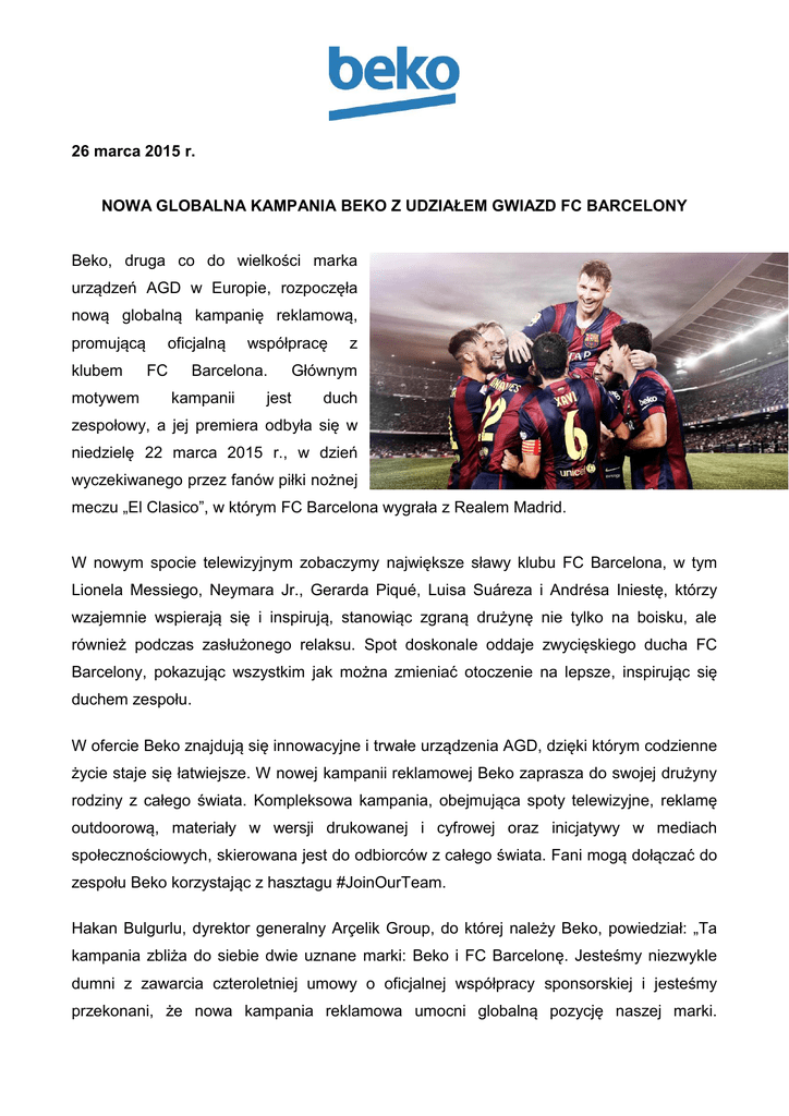 26 marca 2015 r. NOWA GLOBALNA KAMPANIA BEKO Z UDZIAŁEM GWIAZD FC BARCELONY Beko, druga co do wielkości marka urządzeń AGD w Europie, rozpoczęła nową globalną kampanię reklamową, promującą klubem motywem oficjalną FC współpracę Barcelona. kampanii z Głównym jest duch zespołowy, a jej premiera odbyła się w niedzielę 22 marca 2015 r., w dzień wyczekiwanego przez fanów piłki nożnej meczu „El Clasico”, w którym FC Barcelona wygrała z Realem Madrid. W nowym spocie telewizyjnym zobaczymy największe sławy klubu FC Barcelona, w tym Lionela Messiego, Neymara Jr., Gerarda Piqué, Luisa Suáreza i Andrésa Iniestę, którzy wzajemnie wspierają się i inspirują, stanowiąc zgraną drużynę nie tylko na boisku, ale również podczas zasłużonego relaksu. Spot doskonale oddaje zwycięskiego ducha FC Barcelony, pokazując wszystkim jak można zmieniać otoczenie na lepsze, inspirując się duchem zespołu. W ofercie Beko znajdują się innowacyjne i trwałe urządzenia AGD, dzięki którym codzienne życie staje się łatwiejsze. W nowej kampanii reklamowej Beko zaprasza do swojej drużyny rodziny z całego świata. Kompleksowa kampania, obejmująca spoty telewizyjne, reklamę outdoorową, materiały w wersji drukowanej i cyfrowej oraz inicjatywy w mediach społecznościowych, skierowana jest do odbiorców z całego świata. Fani mogą dołączać do zespołu Beko korzystając z hasztagu #JoinOurTeam. Hakan Bulgurlu, dyrektor generalny Arçelik Group, do której należy Beko, powiedział: „Ta kampania zbliża do siebie dwie uznane marki: Beko i FC Barcelonę. Jesteśmy niezwykle dumni z zawarcia czteroletniej umowy o oficjalnej współpracy sponsorskiej i jesteśmy przekonani, że nowa kampania reklamowa umocni globalną pozycję naszej marki. Podziwianie gry światowej klasy piłkarzy przypomina nam wszystkim jak wiele można osiągnąć dzięki duchowi drużynowemu.” Tülin Karabük, dyrektor ds. marketingu globalnego, dodał: „Beko oferuje urządzenia, które za sprawą inteligentnych, innowacyjnych rozwiązań każdego dnia ułatwiają rodzinom wykonywanie obowiązków domowych, zmieniając codzienność na lepsze. Mamy nadzieję, że nasza nowa kampania podkreśli jak wiele można osiągnąć, czerpiąc inspirację z ducha współpracy - nie tylko na boisku, ale i we własnym domu.” Michał Grzeliński, dyrektor ds. marketingu na Polskę, Czechy i Słowację podkreśla, że nowa kampania jest skierowana do wszystkich odbiorców: „Wierzymy, że ta kampania przełamuje konwencję i jest skierowana zarówno do kibiców Barcelony, jak również do wszystkich tych, którzy grają w drużynie, zwanej „rodziną”, wspólnie pokonując codzienne wyzwania i wspólnie świętując zwycięstwo”. Obecnie możemy oglądać międzynarodową wersję spotu, jednak przygotowywana jest adaptacja na rynek polski. Wersję angielską spotu można obejrzeć: http://youtu.be/fxK0efJafso O firmie Beko Beko to globalna marka z segmentu urządzeń AGD należąca do Arçelik Group. W ofercie Beko znajdują się linie małego i dużego sprzętu AGD. W Europie Beko jest drugą pod względem wielkości marką AGD, a jednocześnie na przestrzeni ostatnich 7 lat była najszybciej rozwijającą się marką na całym europejskim rynku. Beko posiada pozycję lidera rynku w Wielkiej Brytanii. Jest również marką numer jeden w kategorii wolnostojących urządzeń AGD w Polsce i we Francji. Beko docenia wagę indywidualnego wkładu, jaki każdy człowiek wnosi w budowę lepszego świata. Dla Beko największym źródłem inspiracji są ludzie, a zwłaszcza Świadome Pokolenie. Czerpiemy pomysły ze zmieniających się potrzeb i stylu życia konsumentów, starając się zaoferować im w każdym z nowych produktów jak najkorzystniejsze rozwiązania. Wsłuchując się w oczekiwania milionów konsumentów z ponad 100 krajów marka Beko opracowała inteligentne rozwiązania, które odpowiadają na zróżnicowane potrzeby ludzi reprezentujących różne kultury i style życia. Beko nigdy nie przestaje myśleć o innowacjach i nowatorskich sposobach przezwyciężania wyzwań. Z radością wita nowe doświadczenia, w których dostrzega możliwości dalszego rozwoju. Beko z szacunkiem odnosi się do środowiska naturalnego i jego kluczowego znaczenia dla społeczeństwa. Dzięki energooszczędnym i przyjaznym dla środowiska produktom łączącym najwyższej klasy technologię i stylowe wzornictwo Beko stale umacnia swoją pozycję na światowych rynkach.