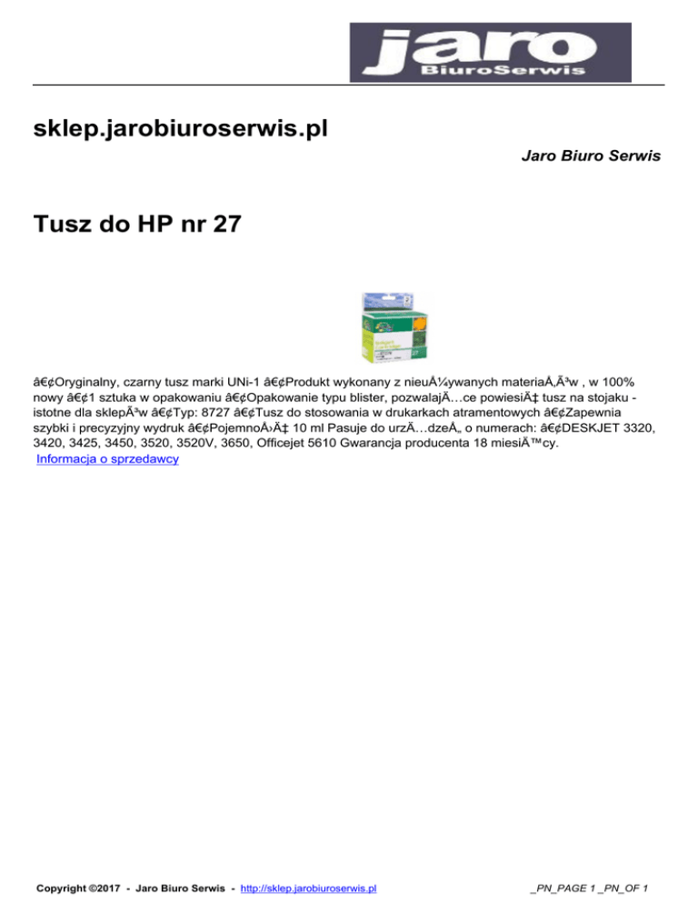 sklep.jarobiuroserwis.pl Jaro Biuro Serwis Tusz do HP nr 27 •Oryginalny, czarny tusz marki UNi-1 •Produkt wykonany z nieużywanych materiałów , w 100% nowy •1 sztuka w opakowaniu •Opakowanie typu blister, pozwalajÄ…ce powiesić tusz na stojaku istotne dla sklepów •Typ: 8727 •Tusz do stosowania w drukarkach atramentowych •Zapewnia szybki i precyzyjny wydruk •Pojemność 10 ml Pasuje do urzÄ…dzeÅ„ o numerach: •DESKJET 3320, 3420, 3425, 3450, 3520, 3520V, 3650, Officejet 5610 Gwarancja producenta 18 miesiÄ™cy. Informacja o sprzedawcy Copyright ©2017 - Jaro Biuro Serwis - http://sklep.jarobiuroserwis.pl _PN_PAGE 1 _PN_OF 1