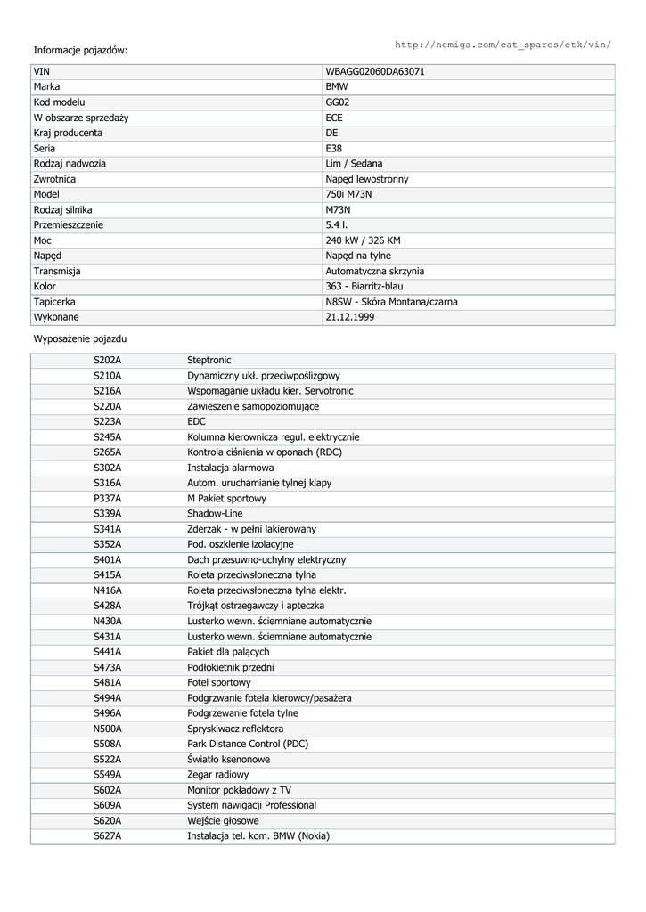 http://nemiga.com/cat_spares/etk/vin/ Informacje pojazdów: VIN WBAGG02060DA63071 Marka BMW Kod modelu GG02 W obszarze sprzedaży ECE Kraj producenta DE Seria E38 Rodzaj nadwozia Lim / Sedana Zwrotnica Napęd lewostronny Model 750i M73N Rodzaj silnika M73N Przemieszczenie 5.4 l. Moc 240 kW / 326 KM Napęd Napęd na tylne Transmisja Automatyczna skrzynia Kolor 363 - Biarritz-blau Tapicerka N8SW - Skóra Montana/czarna Wykonane 21.12.1999 Wyposażenie pojazdu S202A Steptronic S210A Dynamiczny ukł. przeciwpoślizgowy S216A Wspomaganie układu kier. Servotronic S220A Zawieszenie samopoziomujące S223A EDC S245A Kolumna kierownicza regul. elektrycznie S265A Kontrola ciśnienia w oponach (RDC) S302A Instalacja alarmowa S316A Autom. uruchamianie tylnej klapy P337A M Pakiet sportowy S339A Shadow-Line S341A Zderzak - w pełni lakierowany S352A Pod. oszklenie izolacyjne S401A Dach przesuwno-uchylny elektryczny S415A Roleta przeciwsłoneczna tylna N416A Roleta przeciwsłoneczna tylna elektr. S428A Trójkąt ostrzegawczy i apteczka N430A Lusterko wewn. ściemniane automatycznie S431A Lusterko wewn. ściemniane automatycznie S441A Pakiet dla palących S473A Podłokietnik przedni S481A Fotel sportowy S494A Podgrzwanie fotela kierowcy/pasażera S496A Podgrzewanie fotela tylne N500A Spryskiwacz reflektora S508A Park Distance Control (PDC) S522A Światło ksenonowe S549A Zegar radiowy S602A Monitor pokładowy z TV S609A System nawigacji Professional S620A Wejście głosowe S627A Instalacja tel. kom. BMW (Nokia) N672A Zmieniarka CD N677A System głośników HiFi S694A Instalacja zmieniarki BMW na 6 CD S710A M Kier. sport. wielofunk. S775A Podsufitka antracyt S780A Obr. BMW, st. le. M spr. rów. S785A Lampy kierunkowskazów białe L812A Wersja krajowa Wielka Brytania S850A Dummy-SALAPA S853A Wersja językowa, angielski S863A Spis dealerów, Europa S877A Brak obsługi krzyżowej S880A Literatura pokładowa, angielski Dokument przygotowany przez portal Automotive Nemiga.com. Informacje na temat VIN bezpłatnie!