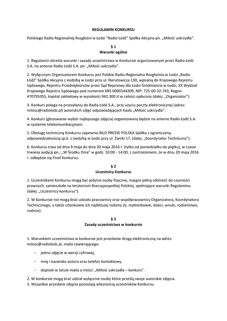 REGULAMIN KONKURSU Polskiego Radia Regionalnej Rozgłośni w Łodzi "Radio Łódź” Spółka Akcyjna pn. „Miłość uskrzydla”. §1 Warunki ogólne 1. Regulamin określa warunki i zasady uczestnictwa w Konkursie organizowanym przez Radio Łódź S.A. na antenie Radio Łódź S.A. pn. „Miłość uskrzydla”. 2. Wyłącznym Organizatorem Konkursu jest Polskie Radio-Regionalna Rozgłośnia w Łodzi „Radio Łódź” Spółka Akcyjna z siedzibą w Łodzi przy ul. Narutowicza 130, wpisaną do Krajowego Rejestru Sądowego, Rejestru Przedsiębiorców przez Sąd Rejonowy dla Łodzi-Śródmieścia w Łodzi; XX Wydział Krajowego Rejestru Sądowego pod numerem KRS 0000144209, NIP: 725-00-32-743, Regon: 470791055, kapitał zakładowy w wysokości 942.300 zł w całości opłacony (dalej: „Organizator”). 3. Konkurs polega na przesyłaniu do Radia Łódź S.A., przy użyciu poczty elektronicznej (adres: [email protected]) autorskich zdjęć odpowiadających hasłu „Miłość uskrzydla”. 4. Konkurs (głosowanie-wybór najlepszego zdjęcia) organizowany będzie na antenie Radio Łódź S.A. w systemie telekomunikacyjnym. 5. Obsługę techniczną Konkursu zapewnia BILD PRESSE POLSKA Spółka z ograniczoną odpowiedzialnością sp.k. z siedzibą w Łodzi przy ul. Żwirki 17, (dalej: „Koordynator Techniczny”). 6. Konkursu trwa od dnia 9 maja do dnia 20 maja 2016 r. (tylko od poniedziałku do piątku), w czasie trwania audycji pn.: „W Środku Dnia” w godz. 10:00 - 14:00, z zastrzeżeniem, że w dniu 20 maja 2016 r. odbędzie się Finał Konkursu. §2 Uczestnicy Konkursu 1. Uczestnikami Konkursu mogą być jedynie osoby fizyczne, mające pełną zdolność do czynności prawnych, zamieszkałe na terytorium Rzeczypospolitej Polskiej, spełniające warunki Regulaminu (dalej: „Uczestnicy konkursu”). 2. W Konkursie nie mogą brać udziału pracownicy oraz współpracownicy Organizatora, Koordynatora Technicznego, a także członkowie ich najbliższej rodziny (tj. małżonkowie, dzieci, wnuki, rodzeństwo, rodzice). §3 Zasady uczestnictwa w konkursie 1. Warunkiem uczestnictwa w konkursie jest przesłanie drogą elektroniczną na adres: [email protected], maila zawierającego: jedno zdjęcie w wersji cyfrowej, imię i nazwisko autora oraz telefon kontaktowy, dopisek w tytule maila o treści: „Miłość uskrzydla – konkurs”. 2. W konkursie mogą brać udział wyłącznie osoby które prześlą swoje autorskie zdjęcia. 3. Wszystkie przesłane zdjęcia pozostają własnością uczestników Konkursu. 4. Poprzez przystąpienie do konkursu, tj. przesłanie zdjęcia uczestnik wyraża zgodę na udział w konkursie; termin przesyłania zdjęć rozpoczyna się dnia 09.05.2016 r. o godz. 10.00 a kończy dnia 16.05.2016 r. o godz. 10.00. 5. Poprzez przystąpienie do konkursu, tj. przesłanie zdjęcia uczestnik wyraża zgodę na nieograniczoną w czasie publikację zdjęcia na łamach portalu radiolodz.pl, a także na modyfikacje fotografii na potrzeby publikacji na stronie internetowej; fotografia podpisana będzie imieniem i nazwiskiem autora zdjęcia; z tytułu wykorzystania fotografii zgodnie z powyższym uczestnik nie będzie rościł sobie praw majątkowych wobec Organizatora. §4 Przebieg Konkursu 1. Nagrody w konkursie otrzyma dwoje uczestników, których fotografie otrzymają najwięcej głosów w kolejności następującej po sobie (o zajętym miejscu pierwszym, drugim lub trzecim decyduje odpowiednio kolejność nadesłania smsów). 2. Najlepsze zdjęcia z Konkursu wybiorą internauci oraz słuchacze Radia Łódź przy użyciu systemu komunikacji elektronicznej SMS. 3. Obsługę techniczną Konkursu zapewnia BILD PRESSE POLSKA Spółka z ograniczoną odpowiedzialnością sp.k. z siedzibą w Łodzi przy ul. Żwirki 17, (dalej: "Koordynator Techniczny"). 4. Głosowanie w konkursie trwa od dnia 16.05.2016 r. od godz. 10:00 do 20.05.2016 r. do godz. 12:00. 5. Głosowanie następuje wyłącznie za pomocą telefonu komórkowego poprzez wysłanie na numer: 71160 krótkiej informacji tekstowej (dalej: "SMS") o następującej treści: serce., a po kropce numer wybranego zdjęcia. Wielkość liter stanowiących treść zgłoszenia nie ma znaczenia dla ważności zgłoszenia. 6. Zgłoszenie dokonane za pomocą innego urządzenia niż telefon komórkowy lub nie zawierające treści określonej w ust. 4 jest nieważne. 7. Głosy na zdjęcia są przyjmowane i rejestrowane przy użyciu urządzeń wyposażonych w automatyczny system zgłoszeń określający czas odbioru zgłoszenia SMS. 8. Po przyjęciu i zarejestrowaniu głosu każdy uczestnik głosowania otrzyma zwrotną wiadomość SMS z potwierdzeniem oddania głosu na wybrane zdjęcie. W przypadku przesłania zgłoszenia nie spełniającego warunków określonych w ust. 4 lub 5 osoba dokonująca zgłoszenia zostanie o tym powiadomiona za pomocą SMS. 9. W trakcie głosowania na łamach portalu radiolodz.pl w artykule pt.: "Głosowanie na najlepsze zdjęcie w konkursie „Miłość uskrzydla” możliwa będzie weryfikacja ilości oddanych głosów na konkretne zdjęcia zgłoszone w konkursie. Na dwie godziny przed zakończeniem głosowania tj. w dn. 20.05.2016 r. o godz. 10:00, możliwość weryfikacji ilości oddanych głosów zostanie usunięta ze strony www, by zachować element zaskoczenia przed ogłoszeniem wyników konkursu. 10. Ostateczne wyniki zostaną ogłoszone w dniu 20.05.2016 r. w programie Radia Łódź „W środku dnia” (który trwa od godz. 10:00 do godz. 14:00). Wyniki zostaną opublikowane także na łamach portalu radiolodz.pl. § 6. Zwycięzcy i nagrody 1. Zwycięzcami Konkursu będą dwie osoby, których zdjęcia otrzymają największą liczbę głosów oddanych za pomocą SMS. 2. W przypadku gdy dwa zdjęcia o najwyższej liczbie oddanych głosów uzyskają jednakową liczbę głosów, Zwycięzca zostanie wyłoniony w dogrywce. Radio Łódź, w programie "W środku dnia" poinformuje o dogrywce i wskaże, które 
