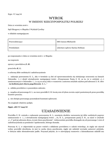 Sygn. I C 244/16 WYROK W IMIENIU RZECZYPOSPOLITEJ POLSKIEJ Dnia 21 września 2016 r. Sąd Okręgowy w Słupsku I Wydział Cywilny w składzie następującym: Przewodniczący: SSO Janusz Blicharski Protokolant: sekretarz sądowy Karina Hofman po rozpoznaniu w dniu 21 września 2016 r. w Słupsku na rozprawie sprawy z powództwa Z. H. przeciwko K. L. o ochronę dóbr osobistych i zadośćuczynienie 1. nakazuje pozwanemu K. L., aby w terminie 14 dni od uprawomocnienia się niniejszego orzeczenia na łamach Dziennika (...) złożył oświadczenie następującej treści: „Przepraszam Panią Z. H. za to, że w artykule „(...) zamieszczonym w Dzienniku (...) z 23.10.2015 roku w rozmowie z autorem artykułu użyłem pod adresem Z. H. słów - ta kobieta jest chora psychicznie. K. L..” 2. oddala powództwo w pozostałym zakresie; 3. zasądza od pozwanego K. L. na rzecz powódki Z. H. kwotę 200 zł tyłem zwrotu części poniesionych przez powódkę kosztów procesu; 4. nie obciąża pozwanego pozostałymi kosztami sądowymi. Na oryginale właściwy podpis. Sygn. akt I C 244/16 UZASADNIENIE Powódka Z. H. wniosła o nakazanie pozwanemu K. L. usunięcia skutków naruszenia jej dóbr osobistych poprzez umieszczenie w (...) oświadczenia następującej treści: „ Ja, K. L., przepraszam panią Z. H., za użyte w artykule „(...)” pod jej adresem słowa, że jest chora psychicznie”. Jednocześnie powódka domagała się od pozwanego 7.000 zł zadośćuczynienia za poniżenie i upokorzenie, którego doznała. Pozwany K. L. w odpowiedzi na pozew wniósł o oddalenie powództwa w całości twierdząc, że nigdy nie używał wobec powódki określenia, że jest to osoba chora psychicznie, nigdy nie udzielał wywiadu autorowi artykułu, w którym takie sformułowanie padło. Przyznał jedynie, że w niewiążącej rozmowie z dziennikarzem udzielił mu informacji o prowadzonych pomiędzy stronami postępowaniach karnych i cywilnych. Twierdził również, iż zażądał niepublikowania żadnej jego wypowiedzi. W toku rozprawy pozwany nie wykluczył, że w rozmowie z dziennikarzem padły pod adresem powódki słowa o chorobie psychicznej, jednak nie były to słowa wypowiedziane złośliwie, a tylko w nerwach wywołanych zachowaniem powódki i licznymi wywoływanymi przez nią sporami sądowymi lub zawiadomieniami do organów ścigania. Sąd ustalił następujący stan faktyczny: W 2014 r. pozwany K. L. nabył nieruchomość w P. od bratanicy powódki M. L.. Powódka twierdząc, iż pozwany wykorzystał niepełnosprawność jej bratanicy, podjęła działania zmierzające do unieważnienia aktu sprzedaży nieruchomości. fakt bezsporny pomiędzy stronami Sprawa o stwierdzenie nieważności umowy jest w toku, jednocześnie pomiędzy stronami toczyły się 3 sprawy karne. W jednej ze spraw strony zawarły ugodę, w myśl której powódka miała przeprosić pozwanego, jednak nie uczyniła tego i pozwany wyegzekwował wyrok za pośrednictwem komornika, w kolejnej sprawie karnej pozwany został uniewinniony, zaś w trzeciej powódka wycofała skargę. Brat powódki S. H. wytoczył pozwanemu postępowanie o naruszenie posiadania, wystąpił również o stwierdzenie zasiedzenia nieruchomości. dowód: zeznania pozwanego – niekwestionowane przez powódkę. W październiku 2015 r. dziennikarz (...), stanowiącego weekendowy dodatek (...), powziął informację o toczących się pomiędzy stronami sporach i postanowił przygotować artykuł na ten temat. W tym celu D. R. przeprowadził rozmowę z powódką, która opisała cały spór w sposób widziany przez nią, a następnie przeprowadził rozmowę telefoniczną z pozwanym K. L.. W trakcie rozmowy z pozwanym tenże oprócz zaprzeczenia twierdzeniom powódki użył na temat powódki określenia „ta kobieta jest chora psychicznie”. Artykuł nie wskazuje nazwiska pozwanego, jednakże w miejscu zamieszkania stron dla wszystkich czytelników oczywistym było, kto jest autorem wypowiedzi o "chorobie psychicznej" powódki. Powódka ani pozwany nie żądali od autora artykułu autoryzacji tekstu. dowód: zeznania D. R. – k. 77 akt sprawy oraz artykuł „(...)” zamieszczony w (...) z 23.10.2015 r. – k. 5 akt sprawy. Sąd zważył, co następuje: Roszczenie swoje powódka opiera o treść art. 23 i 24 kc oraz art. 448 kc. Przesłankami odpowiedzialności za naruszenie dóbr osobistych są bezprawność działania sprawcy oraz naruszenie dobra osobistego pokrzywdzonego. Niewątpliwie podanie do publicznej wiadomości informacji lub zarzutu, że dana osoba cierpi na dolegliwości psychiczne lub jest chora psychicznie, stanowi naruszenie jednego z podstawowych dóbr człowieka, jakim jest ochrona sfery życia psychicznego, prywatności i prawa zachowania w tajemnicy informacji o stanie zdrowia. Podanie informacji o chorobie psychicznej innej osoby – niezależnie od tego, czy jest to informacja prawdziwa, czy nieprawdziwa – zawsze narusza dobro osobiste osoby, której informacja dotyczy a bezprawność działania sprawcy wyłączać może wyłącznie jeden z przypadków przewidzianych art. 24 k.c., a są nimi: a) działanie w ramach obowiązującego porządku prawnego; b) wykonywanie prawa podmiotowego; c) zgoda pokrzywdzonego; d) działanie w obronie uzasadnionego interesu. W ocenie Sądu żadna z powyższych przesłanek wyłączających bezprawność w niniejszej sprawie nie zachodzi i nie została przez pozwanego udowodniona, co oznacza, że pozwany ponosi co do zasady odpowiedzialność za naruszenie dobra osobistego Z. H.. Zasadniczym sposobem usunięcia naruszenia przez pozwanego jest zobowiązanie go do przeproszenia za użyte pod adresem powódki słowa na łamach tej samej gazety, w której opublikowany został artykuł „(...)”. Przeproszenie powódki w terminie 14 dni od uprawomocnienia się orzeczenia zdaniem Sądu winno jej dać pełną satysfakcję i naprawić krzywdy, jakie poniosła w wyniku publikacji z 23 października 2015 r. Be
