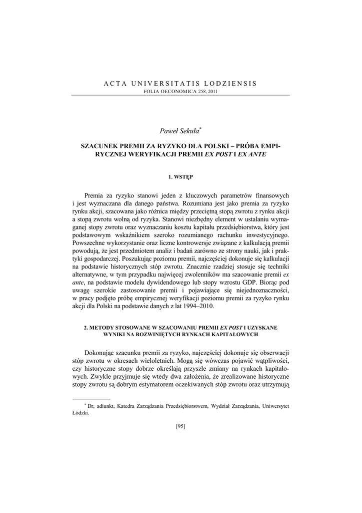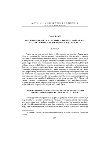 ACTA UNIVERSITATIS LODZIENSIS FOLIA OECONOMICA 258, 2011 Paweł Sekuła∗ SZACUNEK PREMII ZA RYZYKO DLA POLSKI – PRÓBA EMPIRYCZNEJ WERYFIKACJI PREMII EX POST I EX ANTE 1. WSTĘP Premia za ryzyko stanowi jeden z kluczowych parametrów finansowych i jest wyznaczana dla danego państwa. Rozumiana jest jako premia za ryzyko rynku akcji, szacowana jako róŜnica między przeciętną stopą zwrotu z rynku akcji a stopą zwrotu wolną od ryzyka. Stanowi niezbędny element w ustalaniu wymaganej stopy zwrotu oraz wyznaczaniu kosztu kapitału przedsiębiorstwa, który jest podstawowym wskaźnikiem szeroko rozumianego rachunku inwestycyjnego. Powszechne wykorzystanie oraz liczne kontrowersje związane z kalkulacją premii powodują, Ŝe jest przedmiotem analiz i badań zarówno ze strony nauki, jak i praktyki gospodarczej. Poszukując poziomu premii, najczęściej dokonuje się kalkulacji na podstawie historycznych stóp zwrotu. Znacznie rzadziej stosuje się techniki alternatywne, w tym przypadku najwięcej zwolenników ma szacowanie premii ex ante, na podstawie modelu dywidendowego lub stopy wzrostu GDP. Biorąc pod uwagę szerokie zastosowanie premii i pojawiające się niejednoznaczności, w pracy podjęto próbę empirycznej weryfikacji poziomu premii za ryzyko rynku akcji dla Polski na podstawie danych z lat 1994–2010. 2. METODY STOSOWANE W SZACOWANIU PREMII EX POST I UZYSKANE WYNIKI NA ROZWINIĘTYCH RYNKACH KAPITAŁOWYCH Dokonując szacunku premii za ryzyko, najczęściej dokonuje się obserwacji stóp zwrotu w okresach wieloletnich. Mogą się wówczas pojawić wątpliwości, czy historyczne stopy dobrze określają przyszłe zmiany na rynkach kapitałowych. Zwykle przyjmuje się wtedy dwa załoŜenia, Ŝe zrealizowane historyczne stopy zwrotu są dobrym estymatorem oczekiwanych stóp zwrotu oraz utrzymują ∗ Dr, adiunkt, Katedra Zarządzania Przedsiębiorstwem, Wydział Zarządzania, Uniwersytet Łódzki. [95] 96 Paweł Sekuła stabilny poziom w długim okresie. Pozwala to przypuszczać, Ŝe realizowane stopy zwrotu będą przyjmować wartości zbliŜone do średnich, a im większa liczba obserwacji historycznych, tym dokładniejsze oszacowanie oczekiwanych stóp zwrotu. Przyjmując takie argumenty, naleŜy korzystać w szacunkach historycznych stóp zwrotu z długich okresów, poniewaŜ są bardziej wiarygodne niŜ krótkie przedziały czasowe, uwzględniające tylko ostatnie lata notowań. Przedstawione wnioskowanie zaczyna budzić wątpliwości, gdy historyczne stopy zwrotu charakteryzują się duŜą zmiennością. Średnia z obserwacji długoterminowych nie jest wówczas zbyt dobrym estymatorem oczekiwanych stóp zwrotu. Wysoka zmienność stóp zwrotu oznacza wyŜsze ryzyko, a to implikuje równieŜ odpowiednio wysoką wymaganą stopę zwrotu, która jest rekompensatą za ponoszenie dodatkowego ryzyka. UwaŜa się, Ŝe obliczenia przeprowadzane w takich warunkach mają tendencje do przeszacowania premii za ryzyko1. Dowodzi się ponadto, iŜ relacja między stopami zwrotu z akcji i zmiennością tych stóp zwrotu jest dość słaba2. W takim przypadku naleŜy unikać szacunków na podstawie długoletnich obserwacji, lepsze rezultaty moŜe dać próba prognozowania oczekiwanego zwrotu w najbliŜszej przyszłości. Wyznaczając premię za ryzyko ex post, wykorzystywane są dwie podstawowe metody szacunków – oparte na średniej arytmetycznej ( R A ) lub na średniej geometrycznej ( RG ). Problem wyboru odpowiedniej metody kalkulacji nie jest rozwiązany jednoznacznie, wydaje się jednak, Ŝe większość naukowców i analityków opowiada się za stosowaniem średniej arytmetycznej. Oszacowania uzyskiwane przy wykorzystaniu obydwu średnich róŜnią się, czasami dość istotnie. RóŜnica wynika ze zmienności premii w czasie. Na przykład, dla Stanów Zjednoczonych i Wielkiej Brytanii wynosi prawie dwa punkty procentowe3. S. Armitage, opowiadając się za wykorzystaniem średniej arytmetycznej, przytacza następujący argument – dla wielookresowych projektów koszt kapitału jest oczekiwaną stopą zwrotu z aktywów w danym okresie. UwaŜa, Ŝe przyjęcie stałej oczekiwanej rocznej stopy zwrotu w całym okresie badawczym, obliczanej jako średnia arytmetyczna, zapewnia lepszą estymację niŜ średnia geometryczna, która ma tendencję do zaniŜania oszacowań4. Mimo powszechnego zastosowania średniej arytmetycznej swoich zwolenników ma równieŜ obliczanie premii przy wykorzystaniu średniej geometrycznej. Najbardziej znanymi są T. Copeland, T. Koller i J. Murrin5. Zalecają wykorzystanie średniej 1 S. Armitage, The Cost of Capital, Cambridge University Press, Cambridge 2005, s. 88. B. Cornell, The Equity Risk Premium. The Long-Run Future of the Stock Market, John Wiley & Sons, New York 1999, s. 51–52. 3 Za: S. Armitage, The Cost of Capital…, s. 88. 4 TamŜe, s. 89–90. 5 T. Copeland, T. Koller, J. Murrin, Wycena: mierzenie i kształtowanie wartości firm, Wig-Press, Warszawa 1997, s. 252. 2 97 Szacunek premii za ryzyko dla Polski… geometrycznej stóp zwrotu, poniewaŜ średnia arytmetyczna jest obciąŜona okresem pomiaru. Podkreślają, Ŝe średnia geometryczna stanowi lepszy szacunek, gdyŜ jest składaną stopą, dyskontującą wartość końcową do początkowej. Proponują ponadto wykorzystywanie do obliczeń długiego okresu, celem eliminowania krótkoterminowych anomalii. DłuŜszy okres badawczy daje lepsze szacunki, poniewaŜ premia za ryzyko rynku akcji kształtuje się w sposób losowy, trudny do przewidzenia. Zwolennicy średniej geometrycznej przytaczają jeszcze jeden argument – wysokość średniej arytmetycznej zaleŜy od wybranego okresu. Przykładowo, średnia arytmetyczna miesięcznych stóp zwrotu będzie wyŜsza od średniej rocznych stóp zwrotu. Średnia geometryczna, która jest pojedynczym szacunkiem dla całego okresu, nie jest natomiast uzaleŜniona od badanego zakresu czasu. Biorąc pod uwagę zarzuty o przeszacowanie lub niedos