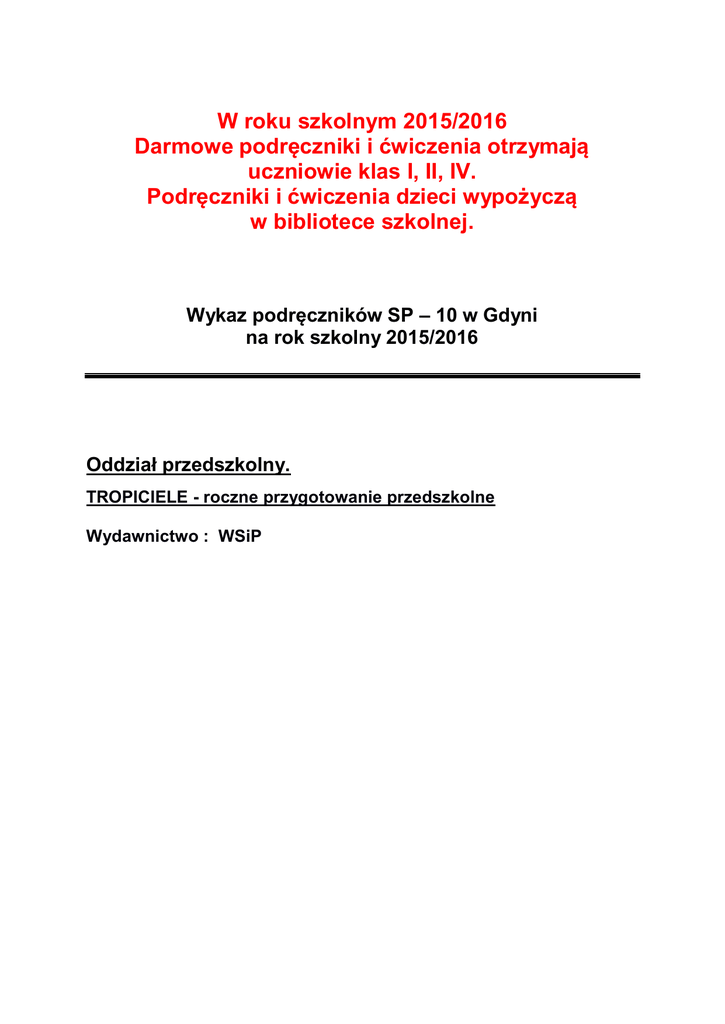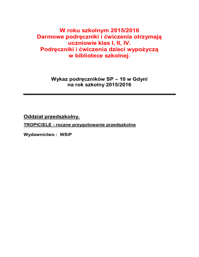 W roku szkolnym 2015/2016 Darmowe podręczniki i ćwiczenia otrzymają uczniowie klas I, II, IV. Podręczniki i ćwiczenia dzieci wypożyczą w bibliotece szkolnej. Wykaz podręczników SP – 10 w Gdyni na rok szkolny 2015/2016 Oddział przedszkolny. TROPICIELE - roczne przygotowanie przedszkolne Wydawnictwo : WSiP Klasa 1 PODRĘCZNIKI RZĄDOWE (DOTOWANE). Maria Lorek, Lidia Wollman Nasz elementarz. Podręcznik do szkoły podstawowej. Część 1 : Jesień Część 2 : Zima Część 3 : Wiosna Część 4 : Lato Wydawnictwo : MEN Ćwiczenia z pomysłem. Część 1,2,3,4. Wydawnictwo : WSiP Język angielski Carol Read, Ana Soberon,– “Bugs World 1” Bugs World 1. Zeszyt ćwiczeń (B) bez pisania. Wydawnictwo : MACMILLAN Klasa 2 PODRĘCZNIKI RZĄDOWE (DOTOWANE). Maria Lorek, Monika Zatorska Nasza szkoła. Podręcznik do szkoły podstawowej. Cz.1 - 4 - edukacja zintegrowana. Agata Ludwa, Maria Lorek Nasza szkoła. Matematyka. Podręcznik do szkoły podstawowej. Cz. 1 - 4. Wydawnictwo : MEN Ćwiczenia z pomysłem. Cz. 1 - 4 Ćwiczenia z pomysłem. Matematyka. Cz. 1 - 4. Wydawnictwo : WSiP Język angielski Carol Read, Ana Soberon– “Bugs World 2” Bugs World 2. Zeszyt ćwiczeń (B) bez pisania. Wydawnictwo : MACMILLAN Klasa 3 Katarzyna Grodzka, Ewa Wierzchowska, Beata Sokołowska Gra w kolory kl. 3, wydawnictwo : JUKA Nr dopuszczenia: 87/3/2011 Składowe pakietu Gra w kolory, klasa 3 dla ucznia: Podręcznik część 1, 2 Matematyka część 1-4 Ćwiczenia część 1-4 Wyprawka dla ucznia w teczce Płyta wspomagająca zajęcia komputerowe Zbiór zadań Zeszyt do zajęć technicznych Dzienniczek ucznia Śpiewnik Karty 3D i okulary 3D Język angielski Elisandra Papiol, Maria Toth, Magdalena Kondro – “Bugs World 3” i zeszyt ćwiczeń “Bugs World 3 ” Wydawnictwo : MACMILLAN Klasa 4 PODRĘCZNIKI RZĄDOWE (DOTOWANE). J. polski Słowa na start! kl.4 cz.1 – kształcenie literackie Słowa na start! kl.4 cz.2 - kształcenie językowe Słowa na start!, kl.4 - zeszyt ćwiczeń Nowa Era J. angielski Team Up 1. Student's Book Team Up 1. Wersja podstawowa - zeszyt ćwiczeń Oxford University Press Matematyka Matematyka z plusem, kl. 4 Matematyka z plusem. Arytmetyka, kl.4, wersja B - zeszyt ćwiczeń Matematyka z plusem. Geometria, kl.4, wersja B - zeszyt ćwiczeń Nowa Era. Przyroda Na tropach przyrody, kl. 4 Nowa Era Plastyka Do dzieła!, kl. 4 Nowa Era Muzyka I gra muzyka, kl. 4 – 6 I gra muzyka, kl. 4 – 6 - zeszyt ćwiczeń Nowa Era Historia i społeczeństwo Wczoraj i dziś, kl. 4 Nowa Era Zajęcia komputerowe Lubię to!, kl. 4 Nowa Era Zajęcia techniczne Jak to działa?, kl. 4 Nowa Era Klasa 5 J. polski M. Derlukiewicz – „Słowa na start ! 5” – podręcznik do kształcenia literackiego i kulturowego dla klasy 5 szkoły podstawowej (do nowej podstawy programowej). A. Wojciechowska, A. Marcinkiewicz – „Słowa na start” – podręcznik do kształcenia językowego dla klasy 5 szkoły podstawowej. Cz. 1 i 2 (do nowej podstawy programowej). Wydawnictwo Nowa Era J. angielski Steve Elsworth, Jim Rose, Małgorzata Tetiurka – “LOOK! 2”podręcznik David Todd – “LOOK! 2” zeszyt ćwiczeń. Wydawnictwo PEARSON LONGMAN Matematyka Podręcznik: M. Dobrowolska, P. Zarzycki., M. Karpiński, M. Jucewicz. Matematyka 5. Wersja „ze ślimakiem” (zgodna z najnowszą podstawą programową). Ćwiczenia: Z. Bolałek, M. Dobrowolska, A. Mysior, S. Wojtan. Liczby całkowite i ułamki (cz. 1 i 2). Wersja „ze ślimakiem” (zgodna z najnowszą podstawą programową). M. Dobrowolska, A. Mysior, P. Zarzycki. Geometria. Wersja „ze ślimakiem” (zgodna z najnowszą podstawą programową). Gdańskie Wydawnictwo Oświatowe – seria „Matematyka z plusem” Przyroda M. Braun, W. Grajkowski, M. Więckowski. Na tropach przyrody. Podręcznik dla klasy 5. (bez ćwiczeń !!!) Wydawnictwo Nowa Era. Muzyka M. Gromek, G. Kilbach. I gra muzyka. 4 – 6. Wydawnictwo Nowa Era Plastyka J. Lukas, K. Onak – Do dzieła! Podręcznik do plastyki dla klas 4 – 6. Wydawnictwo Nowa Era Historia i społeczeństwo G. Wojciechowski. Wczoraj i dziś. Podręcznik do historii i społeczeństwa dla klasy 5 szkoły podstawowej. Wydawnictwo Nowa Era Zajęcia komputerowe G. Koba Zajęcia komputerowe dla szkoły podstawowej. Klasy 4 – 6. Wydawnictwo MIGRA Zajęcia techniczne Lech Łabecki, Marta Łabecka Jak to działa? Podręcznik z ćwiczeniami do zajęć technicznych dla klas 4 – 6. Lech Łabecki, Marta Łabecka Jak to działa? Rysunek techniczny. Zajęcia techniczne dla klas 4 – 6. Wydawnictwo Nowa Era Klasa 6 J. polski M. Derlukiewicz – „Słowa na start ! 6” – podręcznik do kształcenia literackiego i kulturowego z dodatkiem "Lipcowe i sierpniowe wędrówki". A. Wojciechowska, A. Marcinkiewicz – Słowa na start 6. Podręcznik do kształcenia językowego, cz. 1 i 2. Nowa podstawa programowa. Wydawnictwo Nowa Era J. angielski Steve Elsworth, Jim Rose, Małgorzata Tetiurka – “LOOK! 3”podręcznik David Todd – “LOOK! 3” zeszyt ćwiczeń Wydawnictwo PEARSON LONGMAN Matematyka M. Dobrowolska, M. Jucewicz, M. Karpiński, P. Zarzycki. Matematyka 6. – podręcznik. Wersja „ze ślimakiem” (zgodna z najnowszą podstawą programową). K. Zarzycka, P. Zarzycki Matematyka 6 – zbiór zadań. Wersja „ze ślimakiem” (zgodna z najnowszą podstawą programową). Gdańskie Wydawnictwo Oświatowe - seria „Matematyka z plusem” Przyroda M. Braun, W. Grajkowski, M. Więckowski „Na tropach przyrody” - nowa podstawa programowa Podręcznik dla klasy 6. (bez ćwiczeń !!!) Wydawnictwo Nowa Era Historia i społeczeństwo G. Wojciechowski. Wczoraj i dziś. Podręcznik do historii i społeczeństwa dla klasy 6 szkoły podstawowej. Wydawnictwo Nowa Era Muzyka M. Gromek, G. Kilbach. I gra muzyka. 4 – 6. Wydawnictwo Nowa Era Plastyka J. Lukas, K. Onak – Do dzieła! Podręcznik do plastyki dla klas 4 – 6. Wydawnictwo Nowa Era Zajęcia komputerowe G. Koba Zajęcia komputerowe dla szkoły