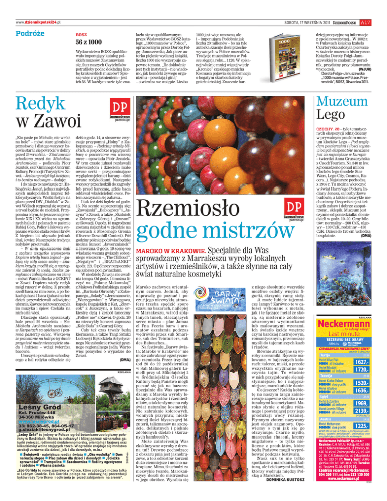 www.dziennikpolski24.pl Podróże SOBOTA, 17 WRZEŚNIA 2011 BOSZ 56 z 1000 Wydawnictwo BOSZ opublikowało imponujący katalog polskich muzeów. Zastanawiam się, ilu z naszych Czytelników potrafiłoby podać dokładną liczbę krakowskich muzeów? Śpieszę więc z wyjaśnieniem – jest ich 56. W każdym razie tyle zna- lazło się w opublikowanym przez Wydawnictwo BOSZ katalogu „1000 muzeów w Polsce”, opracowanym przez Dorotę Folgę–Januszewską. Jak pisze autorka pięknie wydanej książki, liczba 1000 nie wyczerpuje zapewne tematu. „Ile dokładnie jest tych instytucji – nie wiadomo, jak komórki żywego organizmu – powstają i giną” – stwierdza we wstępie. Liczba 1000 jest więc umowna, ale i – imponująca. Podobnie jak liczba 20 milionów – bo na tyle autorka szacuje ilość przechowywanych w Polsce muzealiów. Tradycje muzealnictwa w Polsce sięgają roku... 1120. W spisanej właśnie mniej więcej wtedy „Kronice” czeskiego mnicha Kosmasa pojawia się informacja o bogatym skarbcu katedry gnieźnieńskiej. Znacznie bar- dziej precyzyjne są informacje z epoki nowożytnej... W 1802 r. w Puławach księżna Izabela Czartoryska założyła pierwsze w świecie muzeum historyczne. Książka Doroty Folgi–Januszewskiej to znakomity poradnik, przydatny przy planowaniu wycieczek. (WJUR) Dorota Folga–Januszewska „1000 muzeów w Polsce. Przewodnik”, BOSZ, Olszanica 2011. Redyk w Zawoi Muzeum Lego CZECHY. 20 – tyle tematycz- dziś o godz. 14, a stosowne zwyczaje przypomni „Holny” z Zakopanego. – Rodziny witały bliskich, a gospodarze wypytywali bacę o powierzone mu wiosną owce – opowiada Piotr Jezutek. W tym czasie juhasi rozdawali dziewczętom i dzieciom małe owcze serki – przypominające wyglądem jelenie i barany – dziś zwane redykołkami. Następnie wszyscy przechodzili do zagrody lub przed karczmę, gdzie baca oddawał właścicielom owce. Potem zaczynała się zabawa... I tak też dziś będzie od godz. 15. Na scenie zaprezentują się: „Zawojanki”, „Babiogórcy” i „Juzyna” z Zawoi, a także „Skalniok z Zubrzycy Górnej i „Oravan” ze Słowacji. O godz. 18 nagrodzeni zostaną najszybsi w zjeździe na rowerach z Mosornego Gronia (Diverse Downhill Contest). Pół godziny później podziwiać będzie można kunszt „Jaworznianek” z Jaworzna. O godz. 19 scenę we władanie wezmą gwiazdy sobotniego wieczoru – „The Chilloud”, „Negatyw” i „BRAThANKI” (godz. 22). O północy rozpocznie się zabawa pod gwiazdami. W niedzielę Zawoja nie zwalnia tempa. Od godz. 14 można liczyć na „Polanę Makowską” z Makowa Podhalańskiego, zespół im. „Bartusia Obrochty” z Zakopanego, „Sokoły” z Jerzmanowic, „Warzęgowian” z Warzęgowa, kapelę Bugajskich z Kęt, „Zbyrcok” z Juszczyna, a także orkiestrę dętą i zespół taneczny „Follow me” z Zawoi. O godz. 20 na niezwykły koncert zaprasza „Kałe Bała” z Czarnej Góry. Cały też czas trwały będą kiermasze, a także Targi Sztuki Ludowej i Rękodzieła Artystycznego. Nie zabraknie również pysznego regionalnego jadła. Warto więc pomyśleć o wypadzie do Zawoi. (DMA) REKLAMA %" $ $! $! !!!" #" 28611os „Leśny Gród” to jedyny w Polsce ogród botaniczno-zoologiczny położony w Beskidach. Można tu zobaczyć i bliżej poznać różnorodne gatunki zwierząt, roślinność śródziemnomorską, orientalną i krajową oraz kilkadziesiąt wolno stojących rzeźb. W ogrodzie znajduje się mnóstwo atrakcji zarówno dla dzieci, jak i dla dorosłych, m.in.: Świętowit - największa rzeźba świata „Oko wodnika” Dom na kurzej stopce Plac zabaw dla dzieci i dorosłych „Ścieżka sprawności” Trampolina Szachownica Rośliny egzotyczne i ozdobne Własna pasieka „Eco Corrida to nowe zjawisko w Polsce, które zobaczyć można tylko w Leśnym Grodzie. Eco Corrida polega na edukacyjnej prezentacji byków rasy Toro Bravo i ochrania je przed zabijaniem na arenie”. Rzemiosło godne mistrzów nych ekspozycji odnajdziemy w prywatnym praskim muzeum klocków Lego. – Pod względem powierzchni i ilości wystawionych eksponatów uważane jest za największe w Europie – twierdzi Anna Gruszczyńska z CzechTourism. Na 340 m kw. zgromadzono ponad milion klocków lego (modele Star Wars, Lego City, Cosmos, Racers...). Najstarsze pochodzą z 1958 r. Tu można wkroczyć w świat Harry’ego Pottera, Indiany Jonesa, są i zabytkowe budowle, a także niezwykłe mechanizmy. Oczywiście jest też kącik zabaw i dobrze zaopatrzony... sklepik. Muzeum jest czynne od poniedziałku do niedzieli w godz. 10–20. Ceny biletów: normalny – 200 CzK, ulgowy – 130 CzK, rodzinny – 450 CzK. Dzieci do 120 cm wchodzą bezpłatnie. (DMA) MAROKO W KRAKOWIE. Specjalnie dla Was sprowadzamy z Marrakeszu wyroby lokalnych artystów i rzemieślników, a także słynne na cały świat naturalne kosmetyki Maroko zachwyca orientalnym czarem. Jednak, aby naprawdę go poznać i poczuć jego niezwykłą atmosferę trzeba spędzić sporo czasu na bazarach, najlepiej w Marrakeszu, wśród splątanych tuneli, otaczających serce miasta – plac Jamaa el Fna. Feeria barw i aromatów oszałamia podczas wędrówki przez suk Smarine, suk des Teinturiers, suk des Babouches... Na festiwalu „Barwy świata: Maroko w Krakowie” nie może zabraknąć egzotycznego rzemiosła. Przez trzy dni (od 20 do 22 października) w Sali Malinowej galerii Lamelli przy ul. Mikołajskiej 2 w Śródmiejskim Ośrodku Kultury będą Państwo mogli poczuć się jak na bazarze. Specjalnie dla Was sprowadzamy z Maroka wyroby lokalnych artystów i rzemieślników, a także słynne na cały świat naturalne kosmetyki. Nie zabraknie kolorowych, wonnych przypraw, niezliczonej ilości błyszczącej biżuterii, talizmanów na szczęście, delikatnych i pięknie zdobionych dżelab i skórzanych bamboosh’y. Może zainteresują Was ekskluzywne wyroby z drewna tui? Drewno pochodzące z obszaru pnia jest jasnobrąz