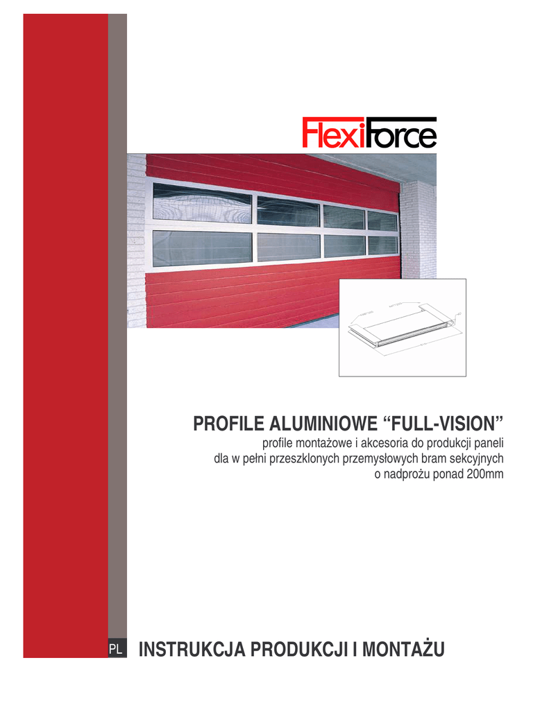 PROFILE ALUMINIOWE “FULL-VISION” profile monta owe i akcesoria do produkcji paneli dla w pełni przeszklonych przemysłowych bram sekcyjnych o nadpro u ponad 200mm PL INSTRUKCJA PRODUKCJI I MONTA U MANUAL UWAGA! OSTRZE ENIA! Monta , u ycie i obsługa elementów zestawu monta owego wymagaj przestrzegania szeregu zasad . Poni ej przedstawione s warunki bezpiecze stwa których przestrzeganie jest niezb dne ! W przypadku w tpliwo ci nale y skontaktowa si z dostawc . ! ! ! ! ! ! Instrukcja przeznaczona jest wył cznie dla przeszkolonych instalatorów i nie mo e by wykorzystywana w celach treningowych lub innych , niezgodnych z przeznaczeniem . Instrukcja opisuje monta wył cznie sekcji w pełni przeszklonych i u ycie dodatkowych cz ci wymaga opisów uzupełniaj cych. Przed przyst pieniem do monta u , nale y uwa nie przeczyta cał instrukcj . Pewne elementy zestawu monta owego mog posiada ostre kraw dzie , i dlatego niezb dne jest u ywanie r kawic ochronnych . Wszystkie dostarczone cz ci zaprojektowane s tak aby stworzy zestaw dla ci le okre lonej bramy . Zastosowanie dodatkowych elementów mo e wpłyn na pogorszenie efektów pracy , stworzy zagro enie oraz zmieni warunki gwarancji udzielanej przez producenta Miejsce monta u powinno by dobrze o wietlone , bez przeszkód i brudu . Inne osoby , a szczególnie dzieci , mog by nara one na niebezpiecze stwo i dlatego nie mog przebywa w pobli u miejsca pracy instalatorów . Warunki gwarancji Ogólne warunki dostawy i płatno ci ustalone przez Metaalunie i opisane jako METAALUNIE CONDITIONS w pełni dotycz wszystkich naszych kontraktów i zobowi za . Inne formy warunków nie s zobowi zuj ce . Kopia warunków dostawy i płatno ci mo e by dostarczona na danie bez dodatkowych opłat . Jest ona tak e dost pna na stronie internetowej www.flexiforce.nl. Flexi-Force dokłada wszelkich stara aby dostawy były zgodne z zamówieniem w 100 % . W praktyce , pomimo stara , nie zawsze jest to mo liwe . Powstałe błedy b d naprawiane najszybciej jak to jest mo liwe , tak aby zminimalizowa odbiorcy wszelkie niedogodno ci z tego tytułu . W takim przypadku nale y bezzwłocznie poinformowa o problemach dotycz cych dostawy ( dokument musi zawiera numer zamówienia oraz numer tygodnia produkcji ) i oczekiwa propozycji ich rozwi zania . FlexiForce pokryje koszty bł dow poniesionych przez osoby trzecie , tylko po wyja nieniu okoliczno ci i przedstawieniu stosownej zgody . Rekompensata finansowa oraz zwrot kosztów podró y dłu szej ni 1 godzina s obiczane na podstawie zwykłych taryf. Instrukcja monta u nie narusza adnych praw autorskich . Zmiany techniczne mog by dokonywane bez uprzedniej pisemnej informacji. Flexi-Force zaprojektował konstrukcj i działanie elementów zestawu w zgodzie z normami Unii Europejskiej . Jednak e nale y sprawdzi czy rozumienie wszystkich norm jest zgodne z tym , jakie jest w danym kraju . Flexi-Force B.V. P.O. Box 37, 3770 AA Barneveld The Netherlands Tel. +31-(0)342-427777 Fax. +31-(0)342-414679 E-mail: [email protected] Internet: www.flexiforce.com HANDLEIDINGEN\ALU manual GB.ma3 2 MANUAL POŁO ENIE PROFILI USZCZELKA GUMOWA, SYMBOL ARE (POJEDYNCZA SZYBA) SYMBOL ARD (PODWÓJNA SZYBA) LISTWA PRZYOKIENNA PVC , SYMBOL APE6000 (POJEDYNCZA SZYBA), SYMBOL APD6000 (PODWÓJNA SZYBA) (od wewn trz bramy) (od zewn trz bramy) PROFIL GÓRNY, SYMBOL A4T7200 (STANDARD) SYMBOL A4R7200 (WZMOCNIONY) SYMBOL A5R7200 (Z ZEWN TRZN LISTW WZMACNIAJ C -L) PROFIL RODKOWY, SYMBOL A2M7200 PROFIL DOLNY, SYMBOL A3B7200 PROFIL BOCZNY,GÓRNY I DOLNY SYMBOL A1E7200 (POJEDYNCZE ZAWIASY BOCZNE) SYMBOL A1D7200 (PODWÓJNE ZAWIASY BOCZNE) USZCZELKA GUMOWA, SYMBOL ARS (W PRZESTRZENI POMI DZY SEKCJAMI) UWAGA : Stosuj c okna plastikowe SAN , nale y pami ta aby do ich czyszczenia u ywa tylko czystej wody. Wycieranie ich na sucho mo e spowodowa powstanie rys !! Profile aluminiowe po zło eniu mog by czyszczone preparatem o nazwie “Eloxal” . HANDLEIDINGEN\ALU manual GB.ma3 3 MANUAL PRODUKCJA I MONTA PRZESZKLONYCH SEKCJI ALUMINIOWYCH 1. CI CIE PROFILI NA PO DAN DŁUGO 2. CI CIE PROFILI NA PO DAN DŁUGO 6,5 3. WYMIARY OTWORU 4. POŁO ENIE I WYMIARY OTWORU 5. WIERCENIE OTWORÓW W POZIOMYM PROFILU GÓRNYM 6. WIERCENIE OTWORÓW W POZIOMYM PROFILU DOLNYM HANDLEIDINGEN\ALU manual GB.ma3 4 MANUAL 7. OBSZAR FREZOWAIA POD GÓRNY UCHWYT ROLKI 8. WYCI CIE FREZEM PROFILA WZMACNIAJ CEGO-L 9. WYCI CIE FREZEM PROFILA WZMACNIAJ CEGO-L 10. FREZOWANIE KRAW DZI Ł CZENIOWEJ PROFILI 11. KSZTAŁT I WYMIARY FREZU 12. WYGL D POWIERZCHNI PROFILA PO FREZOWANIU HANDLEIDINGEN\ALU manual GB.ma3 5 MANUAL 13. PROFIL BOCZNY PO FREZOWANIU 14. WYGŁADZANIE OSTRYCH KRAW DZI 15. PROFIL RODKOWY PO FREZOWANIU 16. WYGŁADZANIE OSTRYCH KRAW DZI WA NE! ZASTOSOWANIE WST PNIE WYFREZOWANYCH PROFILI Z FIRMY FLEXI-FORCE POZWALA UNIKN ZAKUPU KOSZTOWNEGO OPRZYRZ DOWANIA ! HANDLEIDINGEN\ALU manual GB.ma3 6 MANUAL 17. SKR CENIE PROFILI NA GÓRZE SEKCJI 18. SKR CENIE PROFILI NA DOLE SEKCJI 19. WYGL D POŁ CZENIA 20.WYGL D POŁ CZENIA BOCZNEGO SEKCJI 21. KONTROLA WYSOKO CI SEKCJI 22. SKR CENIE PROFILI RODKOWYCH 23. MONTA PROFILI RODKOWYCH (OD WEWN TRZ) 24. KONTROLA WYMIARÓW OTWORU OKIENNEGO (OD WEWN TRZ) (ROZMIAR OKNA = WYMIAR OTWORU MINUS 10 MM) HANDLEIDINGEN\ALU manual GB.ma3 7 MANUAL 25. OSTATECZNE SKR CENIE SEKCJI 26. WYGL D POŁ CZENIA RODKOWEGO SEKCJI 27. WIERCENIE OTWORÓW POD UCHWYTY GÓRNE ROLKI WEDŁUG SZABLONU 28. UKŁAD OTWORÓW POD ZAWIASY I UCHWYTY ROLEK 29. WIERCENIE OTWORÓW POD ZAWIASY RODKOWE WEDŁUG SZBLONU 30. UKŁAD OTWORÓW POD ZAWIASY RODKOWE HANDLEIDINGEN\ALU manual GB.ma3 8 MANUAL 31. WYGL D SEKCJI WRAZ Z NAKLEJK INFORMACYJN 32. PO ZAKO CZENIU MONTA U PROFILI MO NA ROZPOCZ WSTAWIANIE OKIEN 33. CI CIE LISTEW PRZYOKIENNYCH DO PO DANEJ DŁUGO CI RÓWNEJ SZEROKO CI OTWORU 34. JEDNOCZESNE CI CIE KILKU LISTEW PRZYOKIENNYCH 35. WKŁADANIE SZYBY ( ROZMIAR SZYBY = ROZMIAR OTWORU – 10 MM ) 36. MOCOWANIE GÓRNEJ I DOLNEJ LISTWY PRZYOKIENNEJ HANDLEIDINGEN\ALU manual GB.ma3 9 MANUAL 37. MOCOWANIE BOCZNYCH LIS