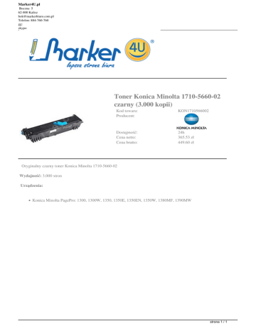 Marker4U.pl Boczna 5 62-800 Kalisz [email protected] Telefon: 884-760-760 gg: skype: Toner Konica Minolta 1710-5660-02 czarny (3.000 kopii) Kod towaru: Producent: KON1710566002 Dostępność: Cena netto: Cena brutto: 24h 365.53 zł 449.60 zł Oryginalny czarny toner Konica Minolta 1710-5660-02 Wydajność: 3.000 stron Urządzenia: Konica Minolta PagePro: 1300, 1300W, 1350, 1350E, 1350EN, 1350W, 1380MF, 1390MW strona 1 / 1 Powered by TCPDF (www.tcpdf.org)