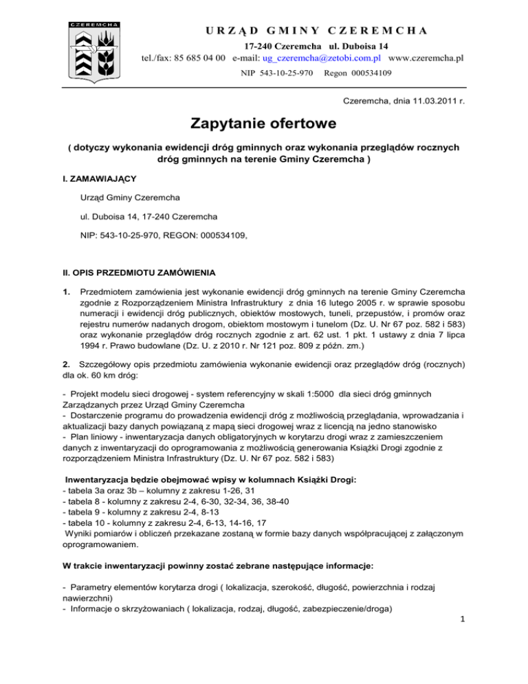 URZĄD GMINY CZEREMCHA 17-240 Czeremcha ul. Duboisa 14 tel./fax: 85 685 04 00 e-mail: [email protected] www.czeremcha.pl NIP 543-10-25-970 Regon 000534109 Czeremcha, dnia 11.03.2011 r. Zapytanie ofertowe ( dotyczy wykonania ewidencji dróg gminnych oraz wykonania przeglądów rocznych dróg gminnych na terenie Gminy Czeremcha ) I. ZAMAWIAJĄCY Urząd Gminy Czeremcha ul. Duboisa 14, 17-240 Czeremcha NIP: 543-10-25-970, REGON: 000534109, II. OPIS PRZEDMIOTU ZAMÓWIENIA 1. Przedmiotem zamówienia jest wykonanie ewidencji dróg gminnych na terenie Gminy Czeremcha zgodnie z Rozporządzeniem Ministra Infrastruktury z dnia 16 lutego 2005 r. w sprawie sposobu numeracji i ewidencji dróg publicznych, obiektów mostowych, tuneli, przepustów, i promów oraz rejestru numerów nadanych drogom, obiektom mostowym i tunelom (Dz. U. Nr 67 poz. 582 i 583) oraz wykonanie przeglądów dróg rocznych zgodnie z art. 62 ust. 1 pkt. 1 ustawy z dnia 7 lipca 1994 r. Prawo budowlane (Dz. U. z 2010 r. Nr 121 poz. 809 z późn. zm.) 2. Szczegółowy opis przedmiotu zamówienia wykonanie ewidencji oraz przeglądów dróg (rocznych) dla ok. 60 km dróg: - Projekt modelu sieci drogowej - system referencyjny w skali 1:5000 dla sieci dróg gminnych Zarządzanych przez Urząd Gminy Czeremcha - Dostarczenie programu do prowadzenia ewidencji dróg z moŜliwością przeglądania, wprowadzania i aktualizacji bazy danych powiązaną z mapą sieci drogowej wraz z licencją na jedno stanowisko - Plan liniowy - inwentaryzacja danych obligatoryjnych w korytarzu drogi wraz z zamieszczeniem danych z inwentaryzacji do oprogramowania z moŜliwością generowania KsiąŜki Drogi zgodnie z rozporządzeniem Ministra Infrastruktury (Dz. U. Nr 67 poz. 582 i 583) Inwentaryzacja będzie obejmować wpisy w kolumnach KsiąŜki Drogi: - tabela 3a oraz 3b – kolumny z zakresu 1-26, 31 - tabela 8 - kolumny z zakresu 2-4, 6-30, 32-34, 36, 38-40 - tabela 9 - kolumny z zakresu 2-4, 8-13 - tabela 10 - kolumny z zakresu 2-4, 6-13, 14-16, 17 Wyniki pomiarów i obliczeń przekazane zostaną w formie bazy danych współpracującej z załączonym oprogramowaniem. W trakcie inwentaryzacji powinny zostać zebrane następujące informacje: - Parametry elementów korytarza drogi ( lokalizacja, szerokość, długość, powierzchnia i rodzaj nawierzchni) - Informacje o skrzyŜowaniach ( lokalizacja, rodzaj, długość, zabezpieczenie/droga) 1 - Informacje o obiektach mostowych ( lokalizacja, rodzaj obiektu ) - Informacje o skrajniach ( lokalizacja, rodzaj obiektu, szerokość, wysokość ) Inwentaryzacja zagospodarowania dróg - Informacje o zjazdach ( lokalizacja, rodzaj, nawierzchnia, szerokość ) - Informacje o obiektach przydroŜnych ( lokalizacja, rodzaj obiektu ) Inwentaryzacja wyposaŜenia dróg - Informacje o oznakowaniu poziomym Informacje o oznakowaniu pionowym Informacje o barierach i ekranach Informacje o oświetleniu Informacje o sygnalizacji Wszystkie dane zebrane podczas inwentaryzacji powinny być wprowadzone do bazy danych. 3. W celu realizacji zamówienia Zamawiający, przekaŜe Wykonawcy materiały w postaci pliku graficznego. 4. Zamawiający nie dopuszcza moŜliwości składania ofert częściowych. 5. Zamawiający nie podwykonawcom. 6. Zamawiający nie dopuszcza moŜliwości składania ofert wariantowych. dopuszcza moŜliwości powierzenia części lub całości zamówienia III. TERMIN WYKONANIA ZAMÓWIENIA Termin wykonania przedmiotu zamówienia: do 19.05.2011 r. IV. OPIS SPOSBU PRZYGOTOWANIA OFERTY Oferent powinien stworzyć ofertę na formularzu załączonym do niniejszego zapytania. Oferta powinna być: - opatrzona pieczątką firmową, - posiadać datę sporządzenia, - zawierać adres lub siedzibę oferenta, numer telefonu, numer NIP, - podpisana czytelnie przez wykonawcę. 2 V. MIEJSCE ORAZ TERMIN SKŁADANIA OFERT 1. Oferta powinna być przesłana dostarczona na adres: Urząd Gminy Czeremcha, 17-240 Czeremcha, ul. Duboisa 14 pok. Nr 16 do dnia 22 marca 2011r. wraz z załączoną kserokopią wypisu z rejestru przedsiębiorców lub zaświadczenia z ewidencji działalności gospodarczej, wystawione w dacie nie wcześniejszej niŜ sześć miesięcy przed datą złoŜenia oferty. 2. Ocena ofert zostanie dokonana w dniu 23 marca 2011 r., a wyniki i wybór najkorzystniejszej oferty zostanie ogłoszony w siedzibie Zamawiającego oraz na stronie internetowej pod adresem www.czeremcha.pl 3. Oferty złoŜone po terminie nie będą rozpatrywane 4. Oferent moŜe przed upływem terminu składania ofert zmienić lub wycofać swoją ofertę. 5. W toku badania i oceny ofert Zamawiający moŜe Ŝądać od oferentów wyjaśnień dotyczących treści złoŜonych ofert. 6. Zapytanie ofertowe zamieszczono na stronie: www.czeremcha.pl VI. OCENA OFERT Zamawiający dokona oceny waŜnych ofert na podstawie następujących kryteriów: 1 - Cena 100% VII. INFORMACJE DOTYCZĄCE WYBORU NAJKORZYSTNIEJSZEJ OFERTY O wyborze najkorzystniejszej oferty Zamawiający zawiadomi oferentów za pośrednictwem strony internetowej znajdującej się pod adresem www.czeremcha.pl VIII. DODATKOWE INFORMACJE Dodatkowych informacji udziela Tomasz RoŜuk pod numerem telefonu 85 685 04 00 oraz adresem email: [email protected] IX. ZAŁĄCZNIKI 1. Załącznik nr 1 - Wzór formularza ofertowego, 2. Załącznik nr 2 – oświadczenie, 3. Wzór umowy. Wójt Gminy Czeremcha mgr Jerzy Szykuła 3