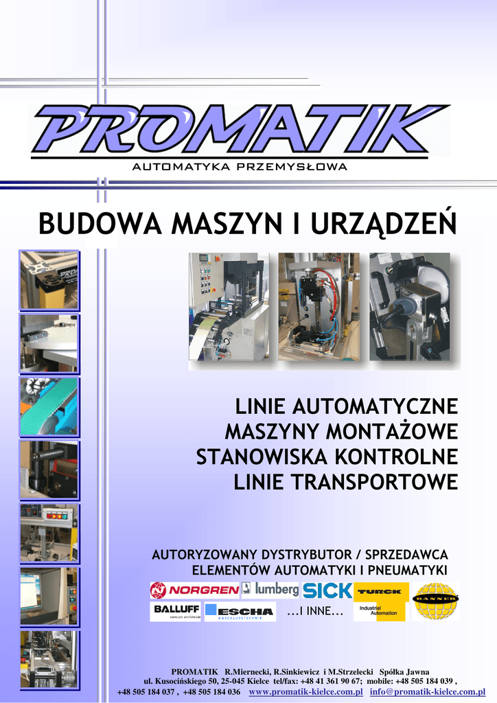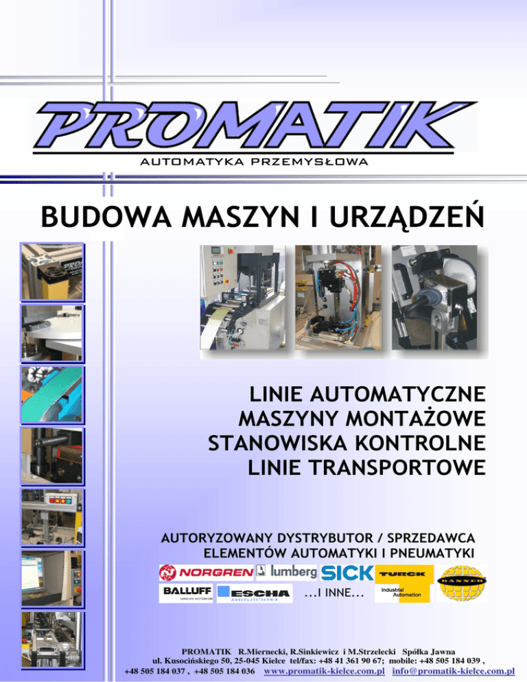 AUTOMATYKA PRZEMYSŁOWA BUDOWA MASZYN I URZĄDZEŃ LINIE AUTOMATYCZNE MASZYNY MONTAśOWE STANOWISKA KONTROLNE LINIE TRANSPORTOWE AUTORYZOWANY DYSTRYBUTOR / SPRZEDAWCA ELEMENTÓW AUTOMATYKI I PNEUMATYKI ...I INNE... PROMATIK R.Miernecki, R.Sinkiewicz i M.Strzelecki Spółka Jawna ul. Kusocińskiego 50, 25-045 Kielce tel/fax: +48 41 361 90 67; mobile: +48 505 184 039 , +48 505 184 037 , +48 505 184 036 www.promatik-kielce.com.pl [email protected] Zespo∏y przygotowania powietrza Przeglàd produktów ...................................................402 Olympian Plus -przeglàd elementów sk∏adowych ....405 Olympian Plus: Gotowe zestawy ...................................................406 Filtry standardowe................................................408 Filtry dok∏adne ‘Puraire®’ .....................................410 Filtry z w´glem aktywnym ‘Ultraire®’ ..................412 Zespo∏y filtrów ultradok∏adnych ...........................414 Reduktory z filtrem ...............................................416 Reduktory .............................................................418 Smarownice..........................................................420 Zawory nadmiarowe.............................................422 Zawory wolnego nape∏niania i spustu ................424 Akcesoria ..............................................................426 Excelon - przeglàd elementów sk∏adowych .............429 Excelon Gotowe zestawy ...................................................430 Filtry standardowe................................................432 Filtry dok∏adne ‘Puraire®’ ....................................434 Filtry z w´glem aktywnym ‘Ultraire®’ ...................436 Reduktory z filtrem ...............................................438 Reduktory .............................................................440 Smarownice..........................................................442 Zawory nadmiarowe.............................................444 Zawory wolnego nape∏niania i startu...................446 Osuszacz membranowy ......................................448 Inteligentne zespo∏y przygotowania powietrza ...450 Akcesoria ..............................................................453 Elementy z przy∏àczem gwintowanym: Gotowe zestawy ...................................................456 Filtry standardowe................................................458 Filtry dok∏adne ‘Puraire®’ .....................................460 Reduktory z filtrem ...............................................462 Reduktory .............................................................464 Reduktory sterowane pilotem ..............................466 Smarownice..........................................................468 Zawory nadmiarowe.............................................470 Elementy specjalne: Reduktory precyzyjne ..........................................474 Reduktory precyzyjne R27 ...................................476 Reduktory ‘Micro Trol’..........................................478 Elementy ze stali nierdzewnej ................480 do 485 Manometry ..........................................................486 Inne produkty .......................................................487 401 Zespo∏y przygotowania powietrza G1/8 14,7 G1/4 38 G3/8 98 G1/2 120 Excelon 430 430 430 Olympian 406 406 406 406 Excelon 430 430 430 430 Przy∏àcze Maksymalny przep∏yw (dm3/sek) 406 Olympian Gotowe zestawy Reduktory z filtrem i smarownicà Filtry ze smarownicà Z gwintem Filtry 406 406 406 406 430 430 430 430 Filtry z w´glem aktywnym ‘Ultraire®’ Filtry podciÊnienia Smarownice 416 416 416 416 Excelon 438 438 438 438 Olympian 408 408 408 408 Excelon 432 432 432 432 Z gwintem 458 458 406 406 406 406 416 416 416 408 408 408 458 458 410 410 410 410 410 Excelon 434 434 434 434 460 460 Olympian 412 412 412 412 Excelon 436 436 436 436 488 488 488 Excelon Z gwintem 488 488 420 Olympian 420 420 420 420 Excelon 442 442 442 442 468 468 468 468 418 Olympian 418 418 418 418 Excelon 440 440 440 440 464 464 Z gwintem 464 464 478 478 478 458 458 460 460 412 Olympian 474 402 406 462 Olympian Z gwintem 406 G2 10008 456 Olympian Z gwintem Reduktory 456 G11/2 230/1000 456 Excelon Z gwintem ‘Puraire®’ Filtry dok∏adne 456 G11/4 230 G1 230 406 Olympian Z gwintem Reduktory z filtrem G3/4 230 488 488 420 420 468 418 418 464 474 474 478 478 474 478 474 Przy∏àcze Maksymalny przep∏yw (dm3/sek) G1/8 14,7 G1/4 38 G3/8 98 G1/2 120 G3/4 230 G1 230 G1Ê 230 G1Ë G2 230/1000 1000 1/2 PTF 1/4 PTF 57 8 Reduktory wst´pne Reduktory precyzyjne Zawory nadmiarowe Z gwintem 487 Z gwintem 474 Olympian 422 422 422 422 Excelon 444 444 444 444 Z gwintem Zawory wolnego nape∏niania/ i spustu Elementy ze stali nierdzewnej Reduktory do wody 474 476 470 470 422 470 470 424 Olympian 424 424 424 424 Excelon 446 446 446 446 422 424 424 Z gwintem 480 482 482 484 Z gwintem 487 487 487 487 Odwadniacze Z gwintem Osuszacze membranowe Smart FRL Zawory odcinajàce elektromagnetyczne Zawory odcinajàce 488 Excelon 448 Z gwintem 448 448 Olympian 450 Excelon 450 Excelon 453 453 453 453 Olympian 427 427 427 427 Excelon 453 453 453 453 427 427 427 Przep∏ywy podano dla nast´pujàcych warunków: Filtry i smarownice: P1 = 6,3 bar; spadek ciÊnienia= 0,5 bar. Reduktory i reduktory z filtrem: P1 = 10 bar; P2 = 6,3 bar; spadek ciÊnienia na zestawie 1 bar 403 e-pneumatyka jest ∏atwiejsza Na naszej stronie internetowej znajdziecie Paƒstwo wiele informacji o produkatach jak równie˝ pomoc technicznà on-line • Dobór i konfiguracja produktu on-line • Informacje o cenie i czasie dostawy • Dost´pnoÊç kart katalogowych w formacie pdf. • Pomoc techniczna in˝ynierów Norgrena dost´pna przez 24 godziny on-line • Dost´pnoÊç plików 2D i 3D CAD z mo˝liwoÊcià podglàdu wybranych formatów • BezpoÊredni dost´p do publikacji Norgrena Odwiedz dziÊ stron´ www.norgren.c