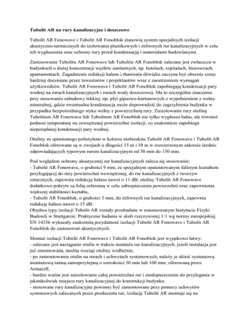 Tubolit AR na rury kanalizacyjne i deszczowe Tubolit AR Fonowave i Tubolit AR Fonoblok stanowią system specjalnych izolacji akustyczno-termicznych do izolowania plastikowych i żeliwnych rur kanalizacyjnych w celu ich wygłuszenia oraz ochrony rury przed kondensacją i materiałami budowlanymi. Zastosowanie Tubolitu AR Fonowave lub Tubolitu AR Fonoblok zalecane jest zwłaszcza w budynkach o dużej koncentracji węzłów sanitarnych, np. hotelach, szpitalach, biurowcach, apartamentach. Zagadnienie redukcji hałasu i tłumienia dźwięku zaczyna być obecnie coraz bardziej doceniane przez inwestorów i projektantów wraz z zaostrzeniem wymagań użytkowników. Tubolit AR Fonowave i Tubolit AR Fonoblok zapobiegają kondensacji pary wodnej na rurach kanalizacyjnych i rurach wody deszczowej. Ma to szczególne znaczenie przy stosowaniu zabudowy lekkiej, np. płyt gipsowo-kartonowych z wypełnieniem z wełny mineralnej, gdzie ewentualna kondensacja może doprowadzić do zagrzybienia budynku w przypadku bezpośredniego styku wełny z powierzchnią rury. Zaizolowanie rury otuliną Tubolitem AR Fonowave lub Tubolitem AR Fonoblok nie tylko wygłusza hałas, ale również podnosi temperaturę na zewnętrznej powierzchni izolacji, co znakomicie zapobiega niepożądanej kondensacji pary wodnej. Otuliny ze spienionego polietylenu w kolorze niebieskim Tubolit AR Fonowave i Tubolit AR Fonoblok oferowane są w zwojach o długości 15 m i 10 m w rozszerzonym zakresie średnic odpowiadających typowym rurom kanalizacyjnym od 50 mm do 150 mm. Pod względem ochrony akustycznej rur kanalizacyjnych zaleca się stosowanie: - Tubolit AR Fonowave, o grubości 9 mm, ze specjalnym opatentowanym falistym kształtem przylegającej do rury powierzchni wewnętrznej, do rur kanalizacyjnych z tworzyw sztucznych, zapewnia redukcję hałasu nawet o 11 dB; otuliny Tubolit AR Fonowave dodatkowo pokryte są folią ochronną w celu zabezpieczenia powierzchni oraz zapewnienia większej stabilności kształtu, - Tubolit AR Fonoblok, o grubości 5 mm, do żeliwnych rur kanalizacyjnych, zapewnia redukcję hałasu nawet o 15 dB. Obydwa typy izolacji Tubolit AR zostały przebadane w renomowanym Instytucie Fizyki Budowli w Stuttgarcie. Praktyczne badania w skali rzeczywistej 1:1 wg normy europejskiej EN 14336 wykazały znakomitą przydatność izolacji Tubolit AR Fonowave i Tubolit AR Fonoblok do zastosowań akustycznych. Montaż izolacji Tubolit AR Fonowave i Tubolit AR Fonoblok jest wyjątkowo łatwy: - zalecane jest naciąganie otulin w trakcie montażu rur kanalizacyjnych, jeżeli instalacja jest już zmontowana, można rozciąć otuliny wzdłużnie, - po zamontowaniu otulin na rurach i uchwytach systemowych, należy je skleić systemową montażową taśmą samoprzylepną o szerokości 50 mm lub 100 mm, oferowaną przez Armacell, - bardzo ważne jest zaizolowanie całej powierzchni rur i niedopuszczenie do przylegania w jakimkolwiek miejscu rury kanalizacyjnej do konstrukcji budynku. - stosowane rury kanalizacyjne powinny być zamontowane przy pomocy uchwytów systemowych zalecanych przez producenta rur, izolację Tubolit AR montuje się na uchwytach. - w przypadku montażu rur kanalizacyjnych przy pomocy zwykłych uchwytów stalowych, zaleca się montaż uchwytu na izolacji Tubolit AR.