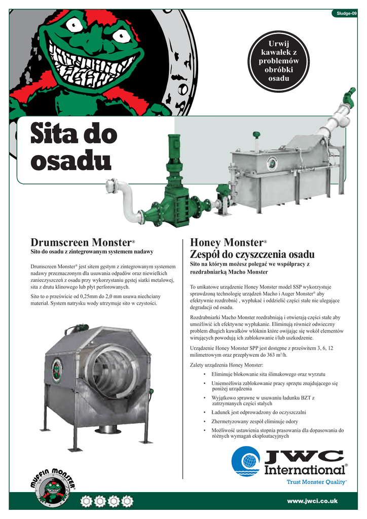 Sludge-09 Urwij kawałek z problemów obróbki osadu Sita do osadu Drumscreen Monster ® Sito do osadu z zintegrowanym systemem nadawy Drumscreen Monster® jest sitem gęstym z zintegrowanym systemem nadawy przeznaczonym dla usuwania odpadów oraz niewielkich zanieczyszczeń z osadu przy wykorzystaniu gęstej siatki metalowej, sita z drutu klinowego lub płyt perforowanych. Sito to o prześwicie od 0,25mm do 2,0 mm usuwa niechciany materiał. System natrysku wody utrzymuje sito w czystości. Honey Monster Zespół do czyszczenia osadu ® Sito na którym możesz polegać we współpracy z rozdrabniarką Macho Monster To unikatowe urządzenie Honey Monster model SSP wykorzystuje sprawdzoną technologię urządzeń Macho i Auger Monster® aby efektywnie rozdrobnić , wypłukać i oddzielić części stałe nie ulegające degradacji od osadu. Rozdrabniarki Macho Monster rozdrabniają i otwierają części stałe aby umożliwić ich efektywne wypłukanie. Eliminują również odwieczny problem długich kawałków włóknin które owijając się wokół elementów wirujących powodują ich zablokowanie i/lub uszkodzenie. Urządzenie Honey Monster SPP jest dostępne z prześwitem 3, 6, 12 milimetrowym oraz przepływem do 363 m3/h. Zalety urządzenia Honey Monster: • Eliminuje blokowanie sita ślimakowego oraz wyrzutu • Uniemożliwia zablokowanie pracy sprzętu znajdującego się poniżej urządzenia • Wyjątkowo sprawne w usuwaniu ładunku BZT z zatrzymanych części stałych • Ładunek jest odprowadzony do oczyszczalni • Zhermetyzowany zespół eliminuje odory • Możliwość ustawienia stopnia prasowania dla dopasowania do różnych wymagań eksploatacyjnych www.jwci.co.uk Honey Monster ® Zespół do czyszczenia osadu Ekskluzywna rozdrabniarka Macho Monster! Funkcjonowanie 1) Osad przepływa przez rozdrabniarkę Macho Monster. 2) Czujnik ultradźwiękowy oraz zawór zamykający regulują przepływ. 2 1 Wyrzut wyłapanych części stałych 3) Zbyteczne części stałe są wychwycone na pochylonym sicie ślimakowym i przetransportowane do odcinka prasowania dla dodatkowego odwodnienia. 3 4 4) Oczyszczony osad spływa do dalszej obróbki technologicznej. Oczyszczony osad Materiały konstrukcyjne Orurowanie: Średnice 100mm i 150mm ze stali nierdzewnej 304 Obudowa rozdrabniarki: Żeliwo sferoidalne ( zgodne z BS A536-77) 1368 673 1368 1073 Dyski tnące: Staliwo sferoidalne utwardzone do 60-65 st. w skali Rockwell’a C 1041 1223 Płaszczyzny stykowe uszczelnienia mechanicznego: Węglik wolframu Płukanie natryskowe 7679 Zespół śruby ślimakowej: Obudowa oraz sito stal nierdzewna 304; rotor staliwo o średnicy 480mm 8x o 16mm hole Zbiornik i podpory: Stal nierdzewna 304 Przegub ślimaka Czujnik ultradźwiękowy Macho Monster 150 wlot 3360 Zawór zamykający 1987 916 305 Rura spustowa 279 Unikatowy system obrotu i przechyłu ułatwia kontrolę sita. Parametry Model Prześwit prętów (mm) Napęd ślimaka Napęd rozdrabniarki Max przepływ* SSP3235-XE 3, 6 or12 1.5kW 7.5kW do 363 m3/h* * Przepływ określono dla parametrów czystej wody, wartości na instalacji będą zależały od zawartości części stałych. Drumscreen Monster Otwór zadawy ® Monster Separation System® Panele sita 1 Smarowania automatyczne (opcja) Okapnik zrzutu zanieczyszczeń Funkcjonowanie 1) Osad jest pompowany do otworu zadawy i równomiernie rozpływa się na panelach sita z siatki klinowej. 2) Zanieczyszczenia są usunięte z paneli przez wypłukanie i przetransportowane na wyrzutu. 2 3) Zanieczyszczenia spadają przez okapnik gotowe do wywiezienia na wysypisko. Materiały konstrukcyjne 3 Konstrukcja sita: Stal nierdzewna 304 lub 316 System płukania Panele: Stal nierdzewna 304 lub 316 Panele perforowane: Stal nierdzewna 304 lub 316 lub UHMW Rolki bębna: Rdzenie wykonane z aluminium pokryte polietylenem. Dwie rolki przypadają na każdą dodaną długość o wymiarze 1,2m. Wypływ Wyrzut Rozmiary urządzenia Panale sita: Z siatki klinowej o prześwitach 0,25; 0,5; 1,0; 2,0 mm Średnica bębna: 0,6; 0,9; 1,2; 1,8 m Długość bębna: 0,9; 1,2; 2,4; 3,6; lub 4,8m System płukania: 6 dysz na każdą sekcje o długości 1,2m Woda płucząca, ciśnienie na dyszy: 4 - 7 bar Woda płucząca, niezbędny wydatek: 0,32 - o,44 l/sek. na dyszę Osad jest rozprowadzony równomiernie po niekończącej taśmie z paneli sita wykonanego z siatki klinowej lub siatki drucianej. Wielkości przepływu Rozmiar bębna m Rozmiar sita - przepływ m3/h 0.25mm 0.5mm 1mm 2mm 0.6 x 0.9 21 23 30 40 0.6 x 1.2 29 32 42 55 0.9 x 1.2 47 51 66 88 0.9 x 2.4 93 102 132 176 1.2 x 2.4 116 127 166 219 1.2 x 3.6 174 191 248 329 1.8 x 3.6 279 305 397 527 1.8 x 4.8 372 407 530 702 Uwaga: Dane podane dla paneli z siatki klinowej. Przepływ podano przy założeniu zawartości 5% s.m. w osadzie i 2 obrotach na minutę bębna. Kołnierze na wlocie są dostępne w różnych rozmiarach. Galeria zdjęć Urządzenie Honey Monster zainstalowane w W. Brytanii. Zbliżenie na sito ślimakowe i system płukania. Części nieorganiczne są wyłapane, oczyszczone i usunięte. Autoryzowany dystrybutor w Polsce: Tech-Pomp Sp. z o.o. Al. Sztandarów 1/3; 04-423 Warszawa; www.techpomp.pl; [email protected] tel: +48 22 612 98 24 fax: +48 22 673 44 71 Urządzenia Honey Monster firmy JWCI oferują kilka opcji odwadniania tak aby spełnić postawione wymagania. W dostawie Drumscreen Monster włączona też jest dostawa sterowania. Ponadto JWCI oferuje również system automatycznego smarowania oraz przemienniki częstotliwości. Unit 15, Daneside Business Park River Dane Road Congleton, Cheshire CW12 1UN United Kingdom Phone: +44 1260 277 047 Fax: +44 1260 277 557 [email protected] www.jwci.co.uk ©2009 JWC International. JWC Santa Ana, CA is registered by UL to ISO9001:2000 File #A16182. JWC International Congleton, UK is registered by QAS to ISO9001:2008 File #A13056. U.S. patents apply: 4,919,346; 5,060,872; 5,320,286; 5,333,801; 5,354,004; 5,478,020; 5,505,388; 5,5