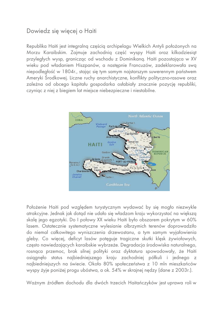 Dowiedz się więcej o Haiti Republika Haiti jest integralną częścią archipelagu Wielkich Antyli położonych na Morzu Karaibskim. Zajmuje zachodnią część wyspy Haiti oraz kilkadziesiąt przyległych wysp, granicząc od wschodu z Dominikaną. Haiti pozostająca w XV wieku pod władaniem Hiszpanów, a następnie Francuzów, zadeklarowała swą niepodległość w 1804r., stając się tym samym najstarszym suwerennym państwem Ameryki Środkowej. Liczne ruchy anarchistyczne, konflikty polityczno-rasowe oraz zależna od obcego kapitału gospodarka osłabiały znacznie pozycję republiki, czyniąc z niej z biegiem lat miejsce niebezpieczne i niestabilne. Położenie Haiti pod względem turystycznym wydawać by się mogło niezwykle atrakcyjne. Jednak jak dotąd nie udało się władzom kraju wykorzystać na większą skalę jego egzotyki. Do I połowy XX wieku Haiti było obszarem pokrytym w 60% lasem. Ostatecznie systematyczne wylesianie olbrzymich terenów doprowadziło do niemal całkowitego wyniszczenia drzewostanu, a tym samym wyjałowienia gleby. Co więcej, deficyt lasów potęguje tragiczne skutki klęsk żywiołowych, często nawiedzających karaibskie wybrzeże. Degradacja środowiska naturalnego, rosnąca przemoc, brak silnej polityki oraz dyktatura spowodowały, że Haiti osiągnęło status najbiedniejszego kraju zachodniej półkuli i jednego z najbiedniejszych na świecie. Około 80% społeczeństwa z 10 mln mieszkańców wyspy żyje poniżej progu ubóstwa, a ok. 54% w skrajnej nędzy (dane z 2003r.). Ważnym źródłem dochodu dla dwóch trzecich Haitańczyków jest uprawa roli w małych rodzinnych gospodarstwach wytwarzających żywność głównie na własne potrzeby. Natomiast produkcja kawy, trzciny cukrowej i mango oraz eksport wyrobów przemysłu odzieżowego są główną siłą napędową kulejącej gospodarki. Społeczeństwo od lat zdane jest na pomoc sił międzynarodowych oraz organizacji humanitarnych, które wspierają lokalny rozwój regionów, walcząc także w sposób doraźny z rosnącą biedą. I choć Haiti nie jest w stanie uporać się w pojedynkę z nagromadzonym ubóstwem, brakiem infrastruktury oraz wysoką inflacją, pomoc z zewnątrz była nie raz zamrażana ze względu na łamanie przez władze praw demokratycznych oraz swobód obywatelskich. Na domiar złego Haitańczycy niemal nieprzerwanie zmagają się ze spustoszeniami, jakie sieją w ich ojczyźnie klęski żywiołowe – powodzie, trzęsienia ziemi, huragany czy tsunami. Niemożliwością staje się efektywne odbudowanie domostw oraz zagospodarowanie upraw, które cyklicznie zostają równane z ziemią. Biuro Narodów Zjednoczonych ds. Koordynacji Pomocy Humanitarnej (OCHA) oświadczyło, iż trzęsienie ziemi, które dotknęło Haiti 12 stycznia 2010r., jest najgorszą katastrofą, z jaką zetknęło się ONZ w historii swojej działalności. Zniszczone zostały struktury lokalne oraz infrastruktura niezbędna do dystrybucji pomocy płynącej z całego świata. Przyszłość kilku milionów obywateli stanęła pod znakiem zapytania, a kilkadziesiąt tysięcy poniosło śmierć na skutek kataklizmu i jego konsekwencji. Nazwa kraju: Republika Haiti Stolica: Stolica: PortPort-auau-Prince Powierzchnia: 27 750 km2 Państwa sąsiadujące: Republika Dominikana Ludność: 10 mln (UN, 2009) Ustrój polityczny: republika parlamentarna Religia: chrześcijanie (katolicy 80 %, protestanci 16%), inne Jednostka monetarna: 1 gourde (HTG) = 0,07 zł (z 17.01.2010) Języki: francuski, haitański Niepodległość: 1 stycznia 1804 r. (od Francji) Liczba osób piśmiennych: 62,1 % Haitańczyków powyżej 15 roku życia (2007) Średnia długość życia: 61 lat (2007) Wskaźnik rozwoju społecznego (HDI): 0,532 -149 miejsce na liście 182 krajów (2009 UNDP) Główne produkty eksportowe: kawa, mango, oleje, odzież
