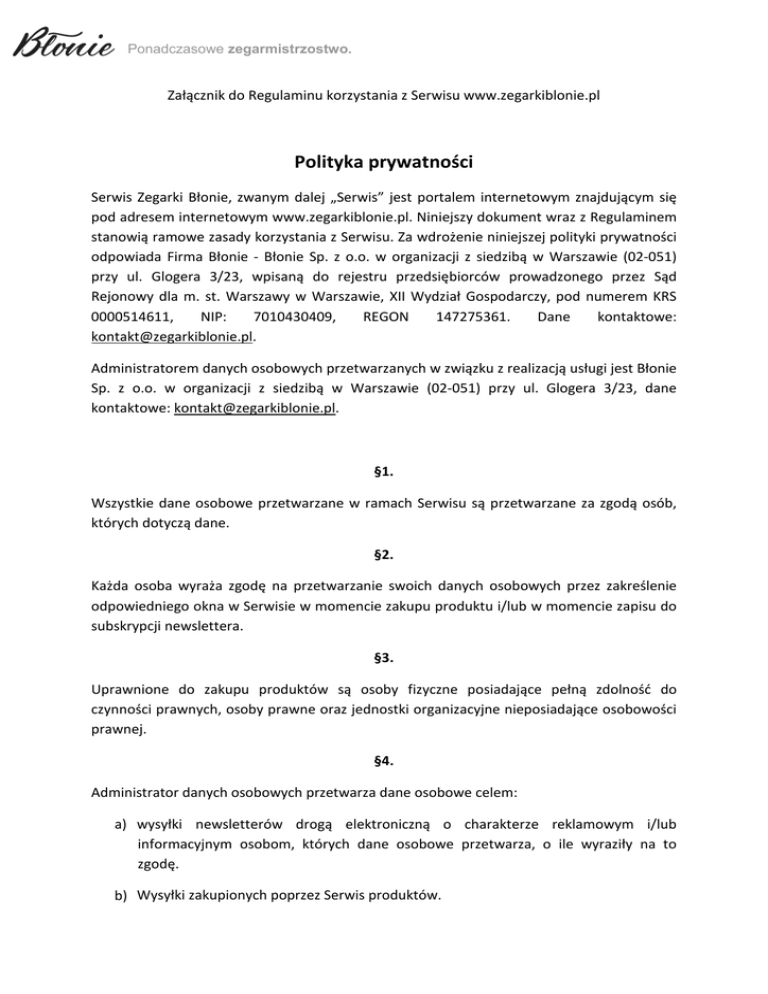 Ponadczasowe zegarmistrzostwo. Załącznik do Regulaminu korzystania z Serwisu www.zegarkiblonie.pl Polityka prywatności Serwis Zegarki Błonie, zwanym dalej „Serwis” jest portalem internetowym znajdującym się pod adresem internetowym www.zegarkiblonie.pl. Niniejszy dokument wraz z Regulaminem stanowią ramowe zasady korzystania z Serwisu. Za wdrożenie niniejszej polityki prywatności odpowiada Firma Błonie - Błonie Sp. z o.o. w organizacji z siedzibą w Warszawie (02-051) przy ul. Glogera 3/23, wpisaną do rejestru przedsiębiorców prowadzonego przez Sąd Rejonowy dla m. st. Warszawy w Warszawie, XII Wydział Gospodarczy, pod numerem KRS 0000514611, NIP: 7010430409, REGON 147275361. Dane kontaktowe: [email protected]. Administratorem danych osobowych przetwarzanych w związku z realizacją usługi jest Błonie Sp. z o.o. w organizacji z siedzibą w Warszawie (02-051) przy ul. Glogera 3/23, dane kontaktowe: [email protected]. §1. Wszystkie dane osobowe przetwarzane w ramach Serwisu są przetwarzane za zgodą osób, których dotyczą dane. §2. Każda osoba wyraża zgodę na przetwarzanie swoich danych osobowych przez zakreślenie odpowiedniego okna w Serwisie w momencie zakupu produktu i/lub w momencie zapisu do subskrypcji newslettera. §3. Uprawnione do zakupu produktów są osoby fizyczne posiadające pełną zdolność do czynności prawnych, osoby prawne oraz jednostki organizacyjne nieposiadające osobowości prawnej. §4. Administrator danych osobowych przetwarza dane osobowe celem: a) wysyłki newsletterów drogą elektroniczną o charakterze reklamowym i/lub informacyjnym osobom, których dane osobowe przetwarza, o ile wyraziły na to zgodę. b) Wysyłki zakupionych poprzez Serwis produktów. Ponadczasowe zegarmistrzostwo. §5. Osoba, której dane osobowe są przetwarzane ma prawo do żądania zaprzestania ich przetwarzania. W tym celu powinna wypisać się z naszej listy poprzez kliknięcie odpowiedniego linku umieszczonego w stopce (na dole) każdej wiadomości email w ramach newslettera. W przypadku braku takiej możliwości, osoba powinna skontaktować się z administratorem danych osobowych wysyłając w tym celu wiadomość e-mail pod adres: [email protected]; §6. Administrator danych osobowych chcąc skontaktować się z osobą, której dane osobowe przetwarza, posłuży się udostępnionym w trakcie dokonywania zakupu adresem e-mail. §7. Przetwarzanie danych osobowych przez administratora danych osobowych oraz przez podmioty, którym powierzono przetwarzanie danych osobowych na podstawie umowy, spełnia wymogi bezpieczeństwa określone w polskim prawie. §8. Zbiory danych osobowych zawierające informacje o osobach, które wyraziły chęć otrzymywania subskrypcji newslettera bądź też dokonały zakupu produktów w Serwisie zostały zarejestrowane w rejestrze prowadzonym przez Generalnego Inspektora Ochrony Danych Osobowych pod nazwami: „Klienci sklepu internetowego www.zegarkiblonie.pl” oraz „Klienci sklepu internetowego www.zegarkiblonie.pl - newsletter”, zostały sporządzone dokumenty: polityka bezpieczeństwa informacji oraz instrukcja zarządzania systemem informatycznym. §9. Administrator danych osobowych stosuje środki techniczne i organizacyjne zapewniające odpowiednią ochronę przetwarzania danych osobowych, w szczególności zabezpiecza dane przed ich udostępnieniem osobom nieupoważnionym, zabraniem przez osobę nieuprawnioną, przetwarzaniem z naruszeniem ustawy oraz zmianą, utratą, uszkodzeniem lub zniszczeniem. System informatyczny, w którym dane osobowe użytkowników Serwisu są przetwarzane, odpowiada wysokiemu poziomowi bezpieczeństwa przetwarzania danych osobowym, o którym mowa w rozporządzeniu Ministra Spraw Wewnętrznych i Administracji z dnia 29 kwietnia 2004 roku w sprawie dokumentacji przetwarzania danych osobowych oraz warunków technicznych i organizacyjnych, jakim powinny odpowiadać urządzenia i systemu informatyczne służące do przetwarzania danych osobowych (Dz.U. 2004 Nr 100, poz. 1024). Ponadczasowe zegarmistrzostwo. §10. Administrator danych osobowych chcąc zbyć na rzecz podmiotu trzeciego zbiór danych osobowych, którym administruje, musi spełnić wymagania wynikające w tym zakresie z przepisów polskiego prawa. §11. Osoba fizyczna składająca deklarację chęci otrzymywania subskrypcji newslettera Serwisu wyraża zgodę na wykorzystywanie danych w celach przesyłania jej informacji dotyczących działalności Serwisu w tym informacji handlowych w postaci wiadomości e-mail. §12. Osoba dokonująca zakupu w Serwisie wyraża zgodę na udostępnienie jej danych w tym danych osobowych, podmiotom trzecim zaangażowanym w realizację płatności lub dostawy, w zakresie niezbędnym dla właściwej realizacji procesu zakupu. §15. Firma Błonie Sp. z o.o. w organizacji zastrzega sobie możliwość zmiany niniejszej polityki prywatności. Wiążąca polityka prywatności dostępna jest zawsze na stronie internetowej: www.zegarkiblonie.pl/politykaprywatnosci , w formie pozwalającej jej zapisanie na dysku oraz wydruk. Zmiana niniejszej polityki prywatności jest możliwa w trybie dotyczącym zmiany Regulaminu tj. z zachowaniem odpowiednich terminów oraz dochowaniem obowiązku uprzedniego poinformowania zainteresowanych. §16. Korzystanie z Serwisu wiąże się z wykorzystywaniem plików cookies. §17. Pliki cookies (tzw. „ciasteczka”) stanowią dane informatyczne, w szczególności pliki tekstowe, które przechowywane są w urządzeniu końcowym użytkownika usługi i przeznaczone są do korzystania ze stron internetowych Serwisu. Cookies zazwyczaj zawierają nazwę strony internetowej, z której pochodzą, czas przechowywania ich na urządzeniu końcowym oraz unikalny numer. §18. Pliki cookies wykorzystywane są w szczególności w następujących celach: a) tworzenia statystyk, które pomagają zrozumieć, w jaki sposób osoby odwiedzające stronę internetową i korzystają z niej, b) usłu