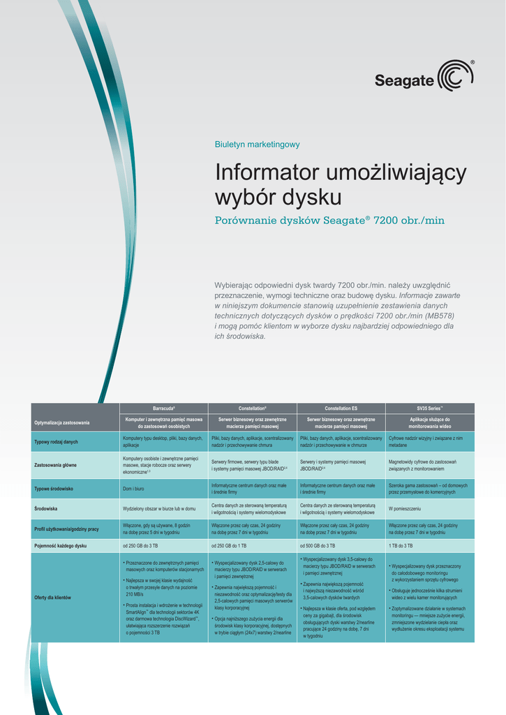 Biuletyn marketingowy Informator umożliwiający wybór dysku Porównanie dysków Seagate® 7200 obr./min Wybierając odpowiedni dysk twardy 7200 obr./min. należy uwzględnić przeznaczenie, wymogi techniczne oraz budowę dysku. Informacje zawarte w niniejszym dokumencie stanowią uzupełnienie zestawienia danych technicznych dotyczących dysków o prędkości 7200 obr./min (MB578) i mogą pomóc klientom w wyborze dysku najbardziej odpowiedniego dla ich środowiska. Barracuda® Constellation® Constellation ES SV35 Series™ Komputer i zewnętrzna pamięć masowa do zastosowań osobistych Serwer biznesowy oraz zewnętrzne macierze pamięci masowej Serwer biznesowy oraz zewnętrzne macierze pamięci masowej Aplikacje służące do monitorowania wideo Typowy rodzaj danych Komputery typu desktop, pliki, bazy danych, aplikacje Pliki, bazy danych, aplikacje, scentralizowany nadzór i przechowywanie chmura Pliki, bazy danych, aplikacje, scentralizowany nadzór i przechowywanie w chmurze Cyfrowe nadzór wizyjny i związane z nim metadane Zastosowania główne Komputery osobiste i zewnętrzne pamięci masowe, stacje robocze oraz serwery ekonomiczne1,3 Serwery firmowe, serwery typu blade i systemy pamięci masowej JBOD/RAID2,4 Serwery i systemy pamięci masowej JBOD/RAID2,4 Magnetowidy cyfrowe do zastosowań związanych z monitorowaniem Typowe środowisko Dom i biuro Informatyczne centrum danych oraz małe i średnie firmy Informatyczne centrum danych oraz małe i średnie firmy Szeroka gama zastosowań – od domowych przez przemysłowe do komercyjnych Środowiska Wydzielony obszar w biurze lub w domu Centra danych ze sterowaną temperaturą i wilgotnością i systemy wielomodyskowe Centra danych ze sterowaną temperaturą i wilgotnością i systemy wielomodyskowe W pomieszczeniu Profil użytkowania/godziny pracy Włączone, gdy są używane, 8 godzin na dobę przez 5 dni w tygodniu Włączone przez cały czas, 24 godziny na dobę przez 7 dni w tygodniu Włączone przez cały czas, 24 godziny na dobę przez 7 dni w tygodniu Włączone przez cały czas, 24 godziny na dobę przez 7 dni w tygodniu Pojemność każdego dysku od 250 GB do 3 TB od 250 GB do 1 TB od 500 GB do 3 TB 1 TB do 3 TB Optymalizacja zastosowania • rzeznaczone do zewnętrznych pamięci P masowych oraz komputerów stacjonarnych • Oferty dla klientów • • ajlepsza w swojej klasie wydajność N o trwałym przesyle danych na poziomie 210 MB/s W yspecjalizowany dysk 2,5-calowy do macierzy typu JBOD/RAID w serwerach i pamięci zewnętrznej • rosta instalacja i wdrożenie w technologii P SmartAlign™ dla technologii sektorów 4K oraz darmowa technologia DiscWizard™, ułatwiająca rozszerzenie rozwiązań o pojemności 3 TB Z apewnia największą pojemność i niezawodność oraz optymalizację/testy dla 2,5-calowych pamięci masowych serwerów klasy korporacyjnej • O pcja najniższego zużycia energii dla środowisk klasy korporacyjnej, dostępnych w trybie ciągłym (24x7) warstwy 2/nearline • yspecjalizowany dysk 3,5-calowy do W macierzy typu JBOD/RAID w serwerach i pamięci zewnętrznej największą pojemność i najwyższą niezawodność wśród 3,5-calowych dysków twardych • W yspecjalizowany dysk przeznaczony do całodobowego monitoringu z wykorzystaniem sprzętu cyfrowego • O bsługuje jednocześnie kilka strumieni wideo z wielu kamer monitorujących • Z optymalizowane działanie w systemach monitoringu — mniejsze zużycie energii, zmniejszone wydzielanie ciepła oraz wydłużenie okresu eksploatacji systemu • Zapewnia • ajlepsza w klasie oferta, pod względem N ceny za gigabajt, dla środowisk obsługujących dyski warstwy 2/nearline pracujące 24 godziny na dobę, 7 dni w tygodniu Informator umożliwiający wybór dysku Porównanie dysków Seagate® 7200 obr./min Planowane zastosowanie Barracuda® Komputery klasy średniej • Constellation® Constellation ES Komputer domowy (gry, multimedia, kino domowe) • Zewnętrzna pamięć masowa do zastosowań osobistych (USB, FireWire, eSATA) • Stacje robocze • Podstawowe, tanie serwery typu desktop • • • Zewnętrzna pamięć masowa (JBOD/RAID, DAS, SAN, NAS, VTLA)4 • • Serwery dla małych i średnich firm (SMB) • • Podstawowe, tanie serwery firmowe2 Pamięć masowa RAID/JBOD typu desktop3 SV35 Series™ • Magnetowidy cyfrowe do monitorowania (SDVR)5 • Sieciowe magnetowidy cyfrowe do monitoringu wizyjnego (SNVR)2 • Scentralizowane systemy monitoringu, • • • • • • • • • • • • • 24x7 24x7 24x7 Technologie Interfejs SATA 3,0 Gb/s • Interfejs SATA 3,0 Gb/s Interfejs SAS (6 Gb/s) • Interfejs SAS (3 Gb/s) Niezawodność Typowa liczba godzin pracy 5x8 Średni czas pomiędzy awariami (MTBF) 1,4 mln godzin 1,2 mln godzin 1 mln godzin Niskie Wysokie Wysokie Wysokie • • • Zarządzanie obciążeniem • • Mechanizm odczytu po zapisie w stanie spoczynku (IRAW) • • Szybkie i sprawne pobieranie oprogramowania firmware (QNR) • • Pełna obsługa technologii IOECC/IOEDC zapewniająca lepszą spójność danych6 • • Ulepszone raportowanie błędów • • Pełny dupleks, podwójny port We/Wy6 • • Funkcja zabezpieczania danych Protection Information (PI) • • • • • • • • Cykle pracy Skanowanie offline 6 Wydajność Technologia kolejkowania poleceń (NCQ) • Oprogramowanie firmware do strumieniowego przesyłania wideo Obsługa poleceń przesyłania strumieniowego wideo ATA-7 • Zmniejszone drgania ruchu obrotowego (RV) zwiększają dokładność i dostępność danych w środowiskach wielodyskowych • • Dwa porty umożliwiają przełączenie na zapasowy system i odzyskiwanie danych w pamięciach masowych zainstalowanych w środowiskach udostępnionej pamięci masowej6 • • Obsługa wielu hostów (16 hostów)6 • • Dwa kanały do równoczesnego przesyłania danych6 • • 0, 1, 3, 4, 5, 6, 10 0, 1, 3, 4, 5, 6, 10 • • Obsługa macierzy RAID Odporność na drgania wsk