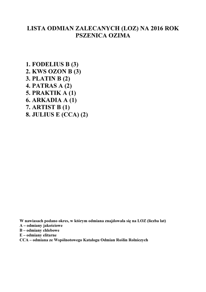 LISTA ODMIAN ZALECANYCH (LOZ) NA 2016 ROK PSZENICA OZIMA 1. FODELIUS B (3) 2. KWS OZON B (3) 3. PLATIN B (2) 4. PATRAS A (2) 5. PRAKTIK A (1) 6. ARKADIA A (1) 7. ARTIST B (1) 8. JULIUS E (CCA) (2) W nawiasach podano okres, w którym odmiana znajdowała się na LOZ (liczba lat) A – odmiany jakościowe B – odmiany chlebowe E – odmiany elitarne CCA – odmiana ze Wspólnotowego Katalogu Odmian Roślin Rolniczych PSZENICA OZIMA – LOZ 2016 FIDELIUS Odmiana chlebowa (grupa B). Mrozoodporność 5,0. Odporność na mączniaka prawdziwego – duża, na rdzę brunatną dość duża, na brunatną plamistość liści i fuzariozę kłosów – średnia, na septoriozę plew i choroby podstawy źdźbła – dość mała, na septoriozę liści – mała. Rośliny dość wysokie, o dość małej odporności na wyleganie. Termin kłoszenia wczesny do bardzo wczesnego, dojrzewania dość wczesny. Masa 1000 ziaren, wyrównanie i gęstość w stanie zsypnym przeciętne. Odporność na porastanie w kłosie średnia, liczba opadania duża do bardzo dużej. Zawartość białka i ilość glutenu dość małe. Wskaźnik sedymentacyjny SDS duży. Wydajność ogólna mąki dość duża. Tolerancja na zakwaszenie gleby przeciętna. Hodowca: Danko HR Choryń. KWS OZON Odmiana chlebowa (grupa B). Plenność dobra. Mrozoodporność 4,0. Odporność na mączniaka prawdziwego – duża, na rdzę brunatną – dość duża, na septoriozę liści, brunatną plamistość liści i choroby podstawy źdźbła – średnia, na septoriozę plew i fuzariozę kłosów – dość mała. Rośliny niskie, o dość dużej odporności na wyleganie. Termin kłoszenia i dojrzewania średni. Masa 1000 ziaren duża, wyrównanie dość dobre, gęstość w stanie zsypnym przeciętna. Odporność na porastanie w kłosie średnia, liczba opadania duża do bardzo dużej. Zawartość białka dość mała, ilość glutenu mała do bardzo małej. Wskaźnik sedymentacyjny SDS duży do bardzo dużego. Wydajność ogólna mąki dość słaba. Tolerancja na zakwaszenie gleby przeciętna. Przedstawiciel hodowcy: KWS Lochow Polska PLATIN Odmiana chlebowa (grupa B). Przyrost plonu na wysokim poziomie agrotechniki powyżej średniej. Mrozoodporność 4,0 Odporność na rdzę brunatną – duża, na brunatną plamistość liści, septoriozę liści i fuzariozę kłosów – dość duża, na choroby podstawy źdźbła i septoriozę plew – średnia, na mączniaka prawdziwego – dość mała. Rośliny dość wysokie, o dość dużej odporności na wyleganie. Termin kłoszenia i dojrzewania średni. Masa 1000 ziaren dość mała, wyrównanie i gęstość w stanie zsypnym średnie. Odporność na porastanie w kłosie przeciętna, liczba opadania duża. Zawartość białka dość mała, ilość glutenu mała do bardzo małej. Wskaźnik sedymentacyjny SDS duży do bardzo dużego. Wydajność ogólna mąki dość duża. Tolerancja na zakwaszenie gleby przeciętna. Przedstawiciel hodowcy: Saaten-Union Polska. PATRAS Odmiana jakościowa (grupa A). Przyrost plonu na wysokim poziomie agrotechniki średni. Mrozoodporność 4,0. Odporność na mączniaka prawdziwego – dość duża, na choroby podstawy źdźbła, rdzę brunatną, brunatną plamistość liści, septoriozę liści, septoriozę plew i fuzariozę kłosów – średnia. Rośliny o przeciętnej wysokości i odporności na wyleganie. Termin kłoszenia średni, dojrzewania dość wczesny. Masa 1000 ziaren bardzo duża, wyrównanie dobre, gęstość w stanie zsypnym średnia. Odporność na porastanie w kłosie przeciętna, liczba opadania duża do bardzo dużej. Zawartość białka i ilość glutenu średnia. Wskaźnik sedymentacyjny SDS duży do bardzo dużego. Wydajność ogólna mąki średnia. Tolerancja na zakwaszenie gleby średnia. Przedstawiciel hodowcy: DSV Polska PRAKTIK Odmiana jakościowa (grupa A). Plenność dobra. Przyrost plonu na wysokim poziomie agrotechniki średni. Zimotrwałość 4,0. Odporność na rdzę brunatną – duża, na choroby podstawy źdźbła, mączniaka prawdziwego, brunatną plamistość liści, septoriozę plew i fuzariozę kłosów – średnia, na septoriozę liści – dość mała. Rośliny niskie, o dość dużej odporności na wyleganie. Termin kłoszenia i dojrzewania średni. Masa 1000 ziaren mała do bardzo małej, wyrównanie dość słabe, gęstość w stanie zsypnym dość duża. Odporność na porastanie w kłosie średnia, liczba opadania duża do bardzo dużej. Zawartość białka średnia, ilość glutenu dość mała. Wskaźnik sedymentacyjny SDS duży do bardzo dużego. Wydajność ogólna mąki dość duża. Tolerancja na zakwaszenie gleby średnia. Przedstawiciel hodowcy: RAGT Semences Polska. ARKADIA Odmiana jakościowa (grupa A). Plenność dobra do bardzo dobrej. Mrozoodporność 6,0. Odporność na rdzę brunatną – dość duża, na septoriozę plew, fuzariozę kłosów i choroby podstawy źdźbła – średnia, na brunatną plamistość liści – dość mała, na mączniaka prawdziwego i septoriozę liści – mała. Rośliny dość wysokie, o dość małej odporności na wyleganie. Termin kłoszenia i dojrzewania dość wczesny. Masa 1000 ziaren dość duża, wyrównanie dobre, gęstość w stanie zsypnym średnia. Odporność na porastanie w kłosie średnia, liczba opadania duża. Zawartość białka i ilość glutenu średnie. Wskaźnik sedymentacyjny SDS duży. Wydajność ogólna mąki średnia. Tolerancja na zakwaszenie gleby przeciętna. Hodowca: DANKO HR ARTIST Odmiana chlebowa (grupa B). Plenność bardzo dobra. Przyrost plonu na wysokim poziomie agrotechniki przeciętny. Zimotrwałość 4,0. Odporność na mączniaka prawdziwego, rdzę brunatną i septoriozę plew – dość duża, na choroby podstawy źdźbła i fuzariozę kłosów – średnia, na brunatną plamistość liści i septoriozy liści – dość mała. Rośliny dość niskie, o dość dużej odporności na wyleganie.Termin kłoszenia i dojrzewania średni. Masa