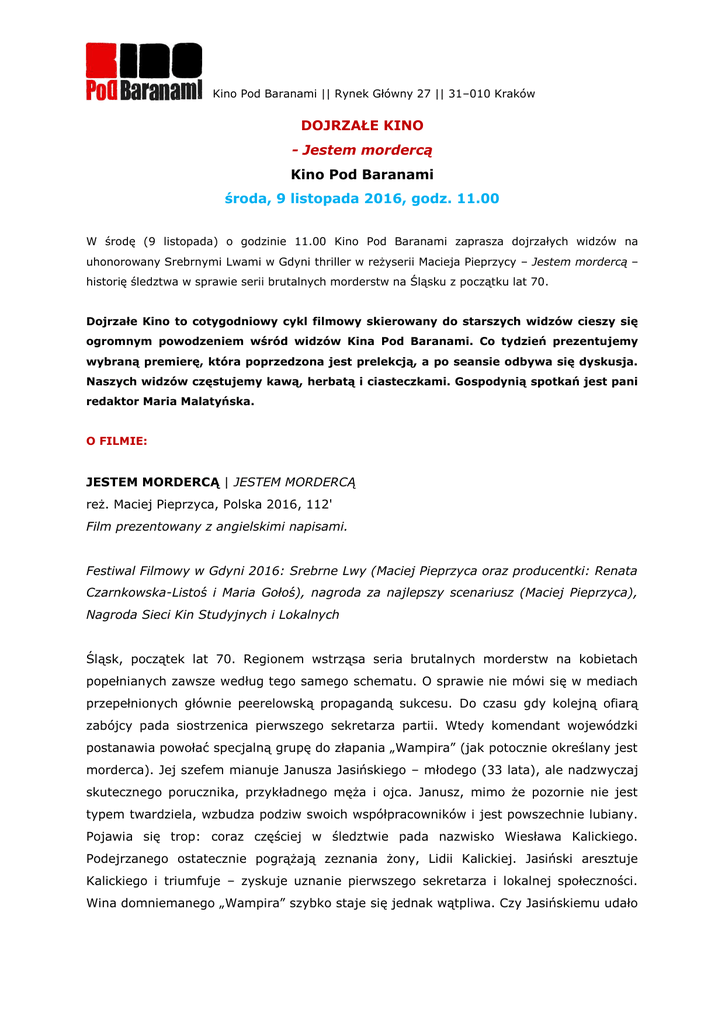 Kino Pod Baranami || Rynek Główny 27 || 31–010 Kraków DOJRZAŁE KINO - Jestem mordercą Kino Pod Baranami środa, 9 listopada 2016, godz. 11.00 W środę (9 listopada) o godzinie 11.00 Kino Pod Baranami zaprasza dojrzałych widzów na uhonorowany Srebrnymi Lwami w Gdyni thriller w reżyserii Macieja Pieprzycy – Jestem mordercą – historię śledztwa w sprawie serii brutalnych morderstw na Śląsku z początku lat 70. Dojrzałe Kino to cotygodniowy cykl filmowy skierowany do starszych widzów cieszy się ogromnym powodzeniem wśród widzów Kina Pod Baranami. Co tydzień prezentujemy wybraną premierę, która poprzedzona jest prelekcją, a po seansie odbywa się dyskusja. Naszych widzów częstujemy kawą, herbatą i ciasteczkami. Gospodynią spotkań jest pani redaktor Maria Malatyńska. O FILMIE: JESTEM MORDERCĄ | JESTEM MORDERCĄ reż. Maciej Pieprzyca, Polska 2016, 112' Film prezentowany z angielskimi napisami. Festiwal Filmowy w Gdyni 2016: Srebrne Lwy (Maciej Pieprzyca oraz producentki: Renata Czarnkowska-Listoś i Maria Gołoś), nagroda za najlepszy scenariusz (Maciej Pieprzyca), Nagroda Sieci Kin Studyjnych i Lokalnych Śląsk, początek lat 70. Regionem wstrząsa seria brutalnych morderstw na kobietach popełnianych zawsze według tego samego schematu. O sprawie nie mówi się w mediach przepełnionych głównie peerelowską propagandą sukcesu. Do czasu gdy kolejną ofiarą zabójcy pada siostrzenica pierwszego sekretarza partii. Wtedy komendant wojewódzki postanawia powołać specjalną grupę do złapania „Wampira” (jak potocznie określany jest morderca). Jej szefem mianuje Janusza Jasińskiego – młodego (33 lata), ale nadzwyczaj skutecznego porucznika, przykładnego męża i ojca. Janusz, mimo że pozornie nie jest typem twardziela, wzbudza podziw swoich współpracowników i jest powszechnie lubiany. Pojawia się trop: coraz częściej w śledztwie pada nazwisko Wiesława Kalickiego. Podejrzanego ostatecznie pogrążają zeznania żony, Lidii Kalickiej. Jasiński aresztuje Kalickiego i triumfuje – zyskuje uznanie pierwszego sekretarza i lokalnej społeczności. Wina domniemanego „Wampira” szybko staje się jednak wątpliwa. Czy Jasińskiemu udało Kino Pod Baranami || Rynek Główny 27 || 31–010 Kraków się złapać prawdziwego zabójcę? Czy w sytuacji, gdy stawką jest ludzkie życie, jest miejsce na błąd? W nowym filmie Macieja Pieprzycy (Chce się żyć, Drzazgi) zobaczymy m.in. Arkadiusza Jakubika, Piotra Adamczyka, Agatę Kuleszę, Magdalenę Popławską, Michała Żurawskiego oraz debiutującego w roli głównej Mirosława Haniszewskiego. Spotkania Dojrzałego Kina odbywają się co środę, w okolicach godziny 11.00. Uczestnicy cyklu prowadzą blog z recenzjami obejrzanych filmów: www.dojrzalekino.pl. Cykl zrealizowano przy wsparciu PISF. BILETY dla seniorów: 12 zł PARTNERZY: