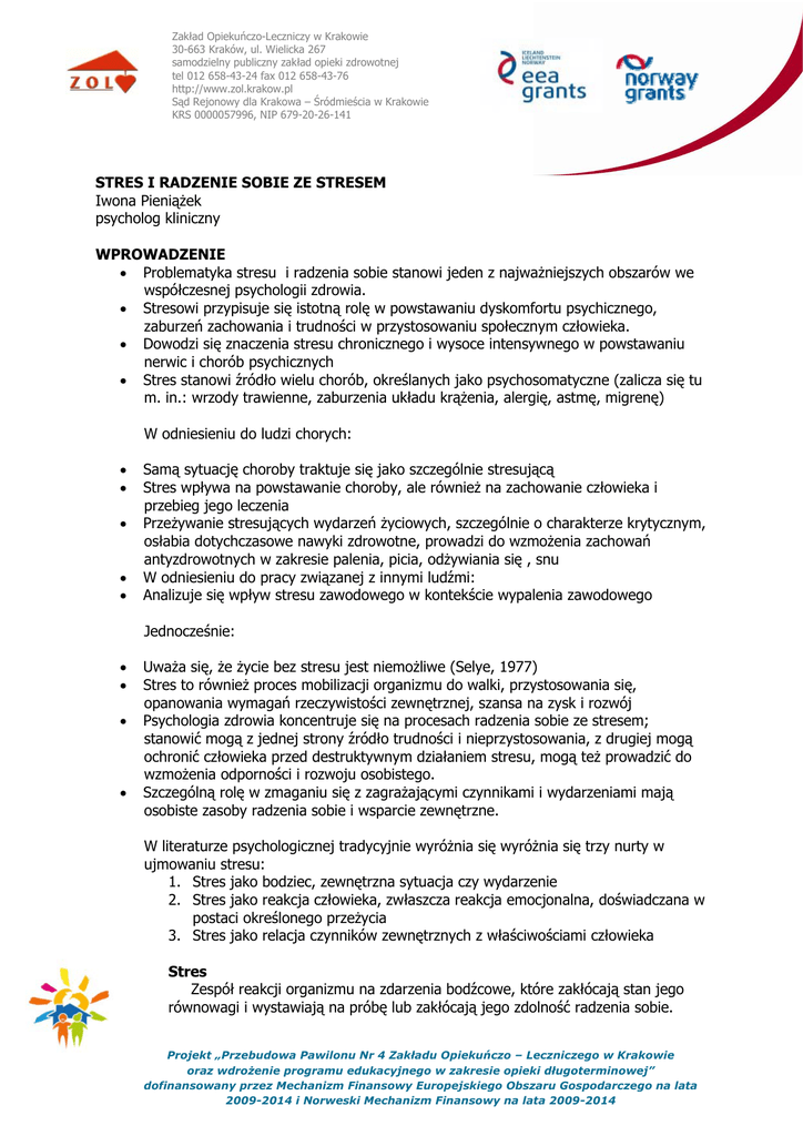 Zakład Opiekuńczo-Leczniczy w Krakowie 30-663 Kraków, ul. Wielicka 267 samodzielny publiczny zakład opieki zdrowotnej tel 012 658-43-24 fax 012 658-43-76 http://www.zol.krakow.pl Sąd Rejonowy dla Krakowa – Śródmieścia w Krakowie KRS 0000057996, NIP 679-20-26-141 STRES I RADZENIE SOBIE ZE STRESEM Iwona Pieniążek psycholog kliniczny WPROWADZENIE • Problematyka stresu i radzenia sobie stanowi jeden z najważniejszych obszarów we współczesnej psychologii zdrowia. • Stresowi przypisuje się istotną rolę w powstawaniu dyskomfortu psychicznego, zaburzeń zachowania i trudności w przystosowaniu społecznym człowieka. • Dowodzi się znaczenia stresu chronicznego i wysoce intensywnego w powstawaniu nerwic i chorób psychicznych • Stres stanowi źródło wielu chorób, określanych jako psychosomatyczne (zalicza się tu m. in.: wrzody trawienne, zaburzenia układu krążenia, alergię, astmę, migrenę) W odniesieniu do ludzi chorych: • • • • • Samą sytuację choroby traktuje się jako szczególnie stresującą Stres wpływa na powstawanie choroby, ale również na zachowanie człowieka i przebieg jego leczenia Przeżywanie stresujących wydarzeń życiowych, szczególnie o charakterze krytycznym, osłabia dotychczasowe nawyki zdrowotne, prowadzi do wzmożenia zachowań antyzdrowotnych w zakresie palenia, picia, odżywiania się , snu W odniesieniu do pracy związanej z innymi ludźmi: Analizuje się wpływ stresu zawodowego w kontekście wypalenia zawodowego Jednocześnie: • • • • Uważa się, że życie bez stresu jest niemożliwe (Selye, 1977) Stres to również proces mobilizacji organizmu do walki, przystosowania się, opanowania wymagań rzeczywistości zewnętrznej, szansa na zysk i rozwój Psychologia zdrowia koncentruje się na procesach radzenia sobie ze stresem; stanowić mogą z jednej strony źródło trudności i nieprzystosowania, z drugiej mogą ochronić człowieka przed destruktywnym działaniem stresu, mogą też prowadzić do wzmożenia odporności i rozwoju osobistego. Szczególną rolę w zmaganiu się z zagrażającymi czynnikami i wydarzeniami mają osobiste zasoby radzenia sobie i wsparcie zewnętrzne. W literaturze psychologicznej tradycyjnie wyróżnia się wyróżnia się trzy nurty w ujmowaniu stresu: 1. Stres jako bodziec, zewnętrzna sytuacja czy wydarzenie 2. Stres jako reakcja człowieka, zwłaszcza reakcja emocjonalna, doświadczana w postaci określonego przeżycia 3. Stres jako relacja czynników zewnętrznych z właściwościami człowieka Stres Zespół reakcji organizmu na zdarzenia bodźcowe, które zakłócają stan jego równowagi i wystawiają na próbę lub zakłócają jego zdolność radzenia sobie. Projekt „Przebudowa Pawilonu Nr 4 Zakładu Opiekuńczo – Leczniczego w Krakowie oraz wdrożenie programu edukacyjnego w zakresie opieki długoterminowej” dofinansowany przez Mechanizm Finansowy Europejskiego Obszaru Gospodarczego na lata 2009-2014 i Norweski Mechanizm Finansowy na lata 2009-2014 Zakład Opiekuńczo-Leczniczy w Krakowie 30-663 Kraków, ul. Wielicka 267 samodzielny publiczny zakład opieki zdrowotnej tel 012 658-43-24 fax 012 658-43-76 http://www.zol.krakow.pl Sąd Rejonowy dla Krakowa – Śródmieścia w Krakowie KRS 0000057996, NIP 679-20-26-141 Stresory Zdarzenia bodźcowe wymagające od organizmu pewnego rodzaju reakcji adaptacyjnej. Reakcja organizmu –jest uzależniona jest od kombinacji reakcji mających udział na różnych poziomach (fizjologicznym, behawioralnym, emocjonalnym, poznawczym) STRESORY- PODZIAŁ I. Zewnętrzne– nadmiar obowiązków, presja czasu, zmiana mieszkania, pracy, awans w pracy, ślub wewnętrzne - nierealistyczne oczekiwania, brak poczucia sprawowania kontroli, kwalifikacji, kompleksy, nieodpowiednie nawyki. II. • • • Ze względu na siłę i zakres: Dramatyczne wydarzenia, o rozmiarach katastrof, obejmujących całe grupy Poważne wyzwania i zagrożenia, dotyczące jednostek Drobne codzienne utrapienia III. Charakterystyka stresorów w wymiarze czasowym: • Jednorazowe (nieprzyjemne spotkanie) • Periodyczne lub cykliczne (wizyty nielubianych krewnych) • Chroniczne (nieudane małżeństwo) • Sekwencyjne (rozwód) Kwestionariusz SRRS Thomasa Holmesa I Richarda Rahe'a (1967) Zdarzenie • • • • • • • • • • Liczba punktów określająca obciążenie Śmierć współmałżonka 100 Rozwód 73 Ślub 50 Utrata pracy 47 Pogodzenie się ze współmałżonkiem 45 Reorganizacja przedsiębiorstwa 39 Zmiana pracy 36 Zmiana godzin lub warunków pracy 20 Urlop 13 Święta 12 RODZAJE STRESU • STRES OSTRY - przejściowe stany pobudzenia, mające zwykle jasno określony początek i koniec • STRES CHRONICZNY – stan trwającego w pobudzenia, rozciągniętego w czasie, w trakcie którego żądania otoczenia są postrzegane jako przekraczające dostępne zasoby, niezbędne do radzenia sobie z nimi. Projekt „Przebudowa Pawilonu Nr 4 Zakładu Opiekuńczo – Leczniczego w Krakowie oraz wdrożenie programu edukacyjnego w zakresie opieki długoterminowej” dofinansowany przez Mechanizm Finansowy Europejskiego Obszaru Gospodarczego na lata 2009-2014 i Norweski Mechanizm Finansowy na lata 2009-2014 Zakład Opiekuńczo-Leczniczy w Krakowie 30-663 Kraków, ul. Wielicka 267 samodzielny publiczny zakład opieki zdrowotnej tel 012 658-43-24 fax 012 658-43-76 http://www.zol.krakow.pl Sąd Rejonowy dla Krakowa – Śródmieścia w Krakowie KRS 0000057996, NIP 679-20-26-141 BIOLOGICZNE UJĘCIE STRESU I FIZJOLOGICZNE REAKCJE NA STRES Reakcje alarmowe na poważne zagrożenia Lata 20. XX w. Walter Cannon- pierwszy opis reakcji na stres : ,, reakcja walcz lub uciekaj” PODWZGÓRZE- CENTRUM REAKCJI NA STRES • • KONTROLUJE AUTONOMICZNY UKŁAD NEROWY AKTYWUJE PRZYSADKĘ MÓZGOWĄ AUTONOMICZNY UKŁAD NEROWY 1. Reguluje aktywność narządów -w warunkach stresu:- szybszy i głębszy oddech, wzrost pulsu, zwężenie naczyń krwionośnych, wzrost ciśnienia kr