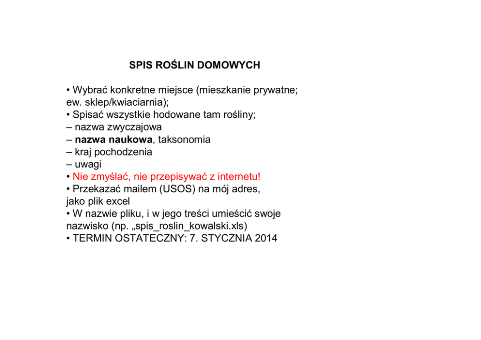 SPIS ROŚLIN DOMOWYCH • Wybrać konkretne miejsce (mieszkanie prywatne; ew. sklep/kwiaciarnia); • Spisać wszystkie hodowane tam rośliny; – nazwa zwyczajowa – nazwa naukowa, taksonomia – kraj pochodzenia – uwagi • Nie zmyślać, nie przepisywać z internetu! • Przekazać mailem (USOS) na mój adres, jako plik excel • W nazwie pliku, i w jego treści umieścić swoje nazwisko (np. „spis_roslin_kowalski.xls) • TERMIN OSTATECZNY: 7. STYCZNIA 2014