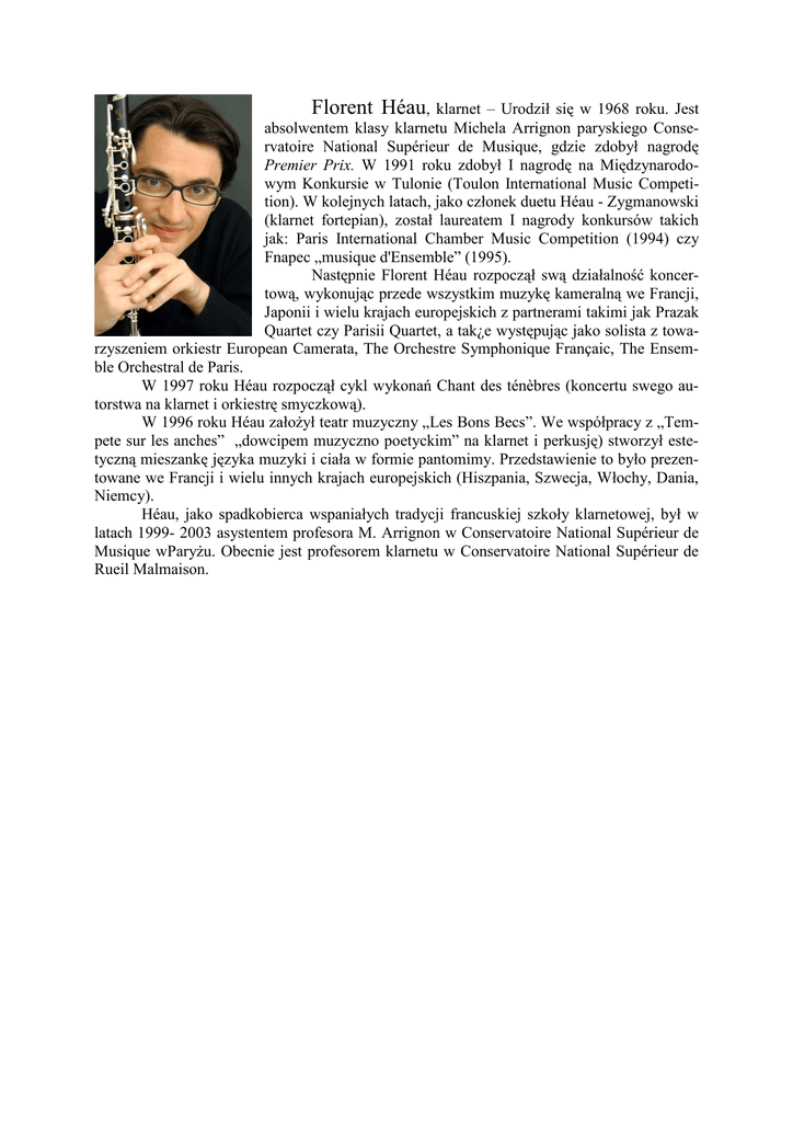 Florent Héau, klarnet – Urodził się w 1968 roku. Jest absolwentem klasy klarnetu Michela Arrignon paryskiego Conservatoire National Supérieur de Musique, gdzie zdobył nagrodę Premier Prix. W 1991 roku zdobył I nagrodę na Międzynarodowym Konkursie w Tulonie (Toulon International Music Competition). W kolejnych latach, jako członek duetu Héau - Zygmanowski (klarnet fortepian), został laureatem I nagrody konkursów takich jak: Paris International Chamber Music Competition (1994) czy Fnapec „musique d'Ensemble” (1995). Następnie Florent Héau rozpoczął swą działalność koncertową, wykonując przede wszystkim muzykę kameralną we Francji, Japonii i wielu krajach europejskich z partnerami takimi jak Prazak Quartet czy Parisii Quartet, a tak¿e występując jako solista z towarzyszeniem orkiestr European Camerata, The Orchestre Symphonique Françaic, The Ensemble Orchestral de Paris. W 1997 roku Héau rozpoczął cykl wykonań Chant des ténèbres (koncertu swego autorstwa na klarnet i orkiestrę smyczkową). W 1996 roku Héau założył teatr muzyczny „Les Bons Becs”. We współpracy z „Tempete sur les anches” „dowcipem muzyczno poetyckim” na klarnet i perkusję) stworzył estetyczną mieszankę języka muzyki i ciała w formie pantomimy. Przedstawienie to było prezentowane we Francji i wielu innych krajach europejskich (Hiszpania, Szwecja, Włochy, Dania, Niemcy). Héau, jako spadkobierca wspaniałych tradycji francuskiej szkoły klarnetowej, był w latach 1999- 2003 asystentem profesora M. Arrignon w Conservatoire National Supérieur de Musique wParyżu. Obecnie jest profesorem klarnetu w Conservatoire National Supérieur de Rueil Malmaison.