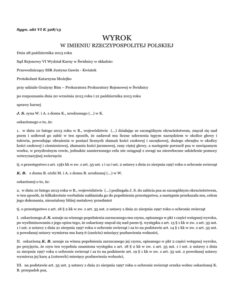 Sygn. akt VI K 328/13 WYROK W IMIENIU RZECZYPOSPOLITEJ POLSKIEJ Dnia 28 października 2013 roku Sąd Rejonowy VI Wydział Karny w Świdnicy w składzie: Przewodniczący SSR Justyna Gawin - Kwiatek Protokolant Katarzyna Możejko przy udziale Grażyny Bim – Prokuratora Prokuratury Rejonowej w Świdnicy po rozpoznaniu dnia 20 września 2013 roku i 21 października 2013 roku sprawy karnej J. S. syna W. i A. z domu K., urodzonego (...) w K. oskarżonego o to, że: 1. w dniu 10 lutego 2013 roku w B., województwie (...) działając ze szczególnym okrucieństwem, znęcał się nad psem i usiłował go zabić w ten sposób, że zadawał mu liczne uderzenia tępym narzędziem w okolice głowy i tułowia, powodując obrażenia w postaci licznych złamań kości czołowej i szczękowej, dużego obrzęku w okolicy kości czołowej i ciemieniowej, złamania kości jarzmowej, rany ciętej głowy, a następnie porzucił psa w zawiązanym worku, w przydrożnym rowie, jednakże zamierzonego celu nie osiągnął z uwagi na niezwłoczne udzielenie pomocy weterynaryjnej zwierzęciu tj. o przestępstwo z art. 13§1 kk w zw. z art. 35 ust. 1 i 1a i ust. 2 ustawy z dnia 21 sierpnia 1997 roku o ochronie zwierząt K. B. z domu B. córki M. i A. z domu B. urodzonej (...) w W. oskarżonej o to, że: 2. w dniu 10 lutego 2013 roku w B., województwie (...) podżegała J. S. do zabicia psa ze szczególnym okrucieństwem, w ten sposób, że kilkakrotnie werbalnie nakłaniała go do popełnienia przestępstwa, a następnie przekazała mu, celem jego dokonania, nieustalony bliżej metalowy przedmiot tj. o przestępstwo z art. 18 § 2 kk w zw. z art. 35 ust. 2 ustawy z dnia 21 sierpnia 1997 roku o ochronie zwierząt I. oskarżonego J. S. uznaje za winnego popełnienia zarzucanego mu czynu, opisanego w pkt 1 części wstępnej wyroku, po wyeliminowaniu z jego opisu tego, że oskarżony znęcał się nad psem tj. występku z art. 13 § 1 kk w zw. z art. 35 ust. 1 i ust. 2 ustawy z dnia 21 sierpnia 1997 roku o ochronie zwierząt i za to na podstawie art. 14 § 1 kk w zw. z art. 35 ust. 2 powołanej ustawy wymierza mu karę 6 (sześciu) miesięcy pozbawienia wolności, II. oskarżoną K. B. uznaje za winna popełnienia zarzucanego jej czynu, opisanego w pkt 2 części wstępnej wyroku, po przyjęciu, że czyn ten wypełnia znamiona występku z art. 18 § 2 kk w zw. z art. 35 ust. 1 i ust. 2 ustawy z dnia 21 sierpnia 1997 roku o ochronie zwierząt i za to na podstawie art. 19 § 1 kk w zw. z art. 35 ust. 2 powołanej ustawy wymierza jej karę 4 (czterech) miesięcy pozbawienia wolności, III. na podstawie art. 35 ust. 3 ustawy z dnia 21 sierpnia 1997 roku o ochronie zwierząt orzeka wobec oskarżonej K. B. przepadek psa, IV. na podstawie art. 35 ust. 3a ustawy z dnia 21 sierpnia 1997 roku o ochronie zwierząt orzeka wobec oskarżonego J. S. środek karny zakazu posiadania zwierząt na okres 5 lat, V. na podstawie art. 35 ust. 3a ustawy z dnia 21 sierpnia 1997 roku o ochronie zwierząt orzeka wobec oskarżonej K. B. środek karny zakazu posiadania zwierząt na okres 5 lat, VI. na podstawie art. 35 ust. 5 ustawy z dnia 21 sierpnia 1997 roku o ochronie zwierząt orzeka od oskarżonego J. S. na rzecz Towarzystwa (...) Oddział we W. nawiązkę w kwocie 2500 zł (dwa tysiące pięćset złotych), VII. na podstawie art. 35 ust. 5 ustawy z dnia 21 sierpnia 1997 roku o ochronie zwierząt orzeka od oskarżonej K. B. na rzecz Towarzystwa (...) Oddział we W. nawiązkę w kwocie 2500 zł (dwa tysiące pięćset złotych), VIII. na podstawie art. 63 § 1 kk na poczet wymierzonej w punkcie I wyroku kary pozbawienia wolności zalicza okres zatrzymania oskarżonego od dnia 22 lutego 2013 roku do dnia 24 lutego 2013 roku, IX. na podstawie art. 63 § 1 kk na poczet wymierzonej w punkcie II wyroku kary pozbawienia wolności zalicza okres zatrzymania oskarżonej w dniu 22 lutego 2013 roku, X. zwalnia oskarżonych od uiszczania opłat i od ponoszenia wydatków powstałych od chwili wszczęcia postępowania zaliczając te wydatki na rachunek Skarbu Państwa. Sygn. akt VI K 328/13 UZASADNIENIE W toku przeprowadzonego na rozprawie postępowania dowodowego Sąd ustalił następujący stan faktyczny: Oskarżona K. B. miała dwa psy, które trzymała w kojcach na swojej posesji, położonej w B. przy ul. (...). Jeden z tych psów, wabiący się N.był u oskarżonej co najmniej 5 lat. Oskarżona uznała jednak, że nie stać je na utrzymanie dwóch psów i postanowiła pozbyć się Nero. Wielokrotnie prosiła więc sąsiada oskarżonego J. S., aby zabił tego psa. Oskarżony nie chciał spełnić prośby K. B. i odmawiał zabicia zwierzęcia. W dniu 10 lutego 2013 roku K. B. ponownie wróciła się do oskarżonego z prośbą o zabicie psa, powiedziała, że musi psa się pozbyć bo „nie będzie darmo jeść” (k. 36). Za zabicie psa oferowała oskarżonemu butelkę alkoholu. J. S. był nietrzeźwy i przystał na propozycję oskarżonej. Oskarżona dała J. S. metalowy drąg, a następnie przyprowadziła uwiązanego na sznurku Nero. Oskarżony klika razy uderzył psa otrzymanym od oskarżonej przedmiotem. Bił go po głowie i tułowiu. Będąc przeświadczonym, że pies nie żyje razem z oskarżoną wsadził go do worka i pies został wyniesiony poza teren wsi. Oskarżony otrzymał od oskarżonej obiecaną butelkę alkoholu. Dowód: • wyjaśnienia oskarżonego J. S. k. 35 odw. – 36, 56 164 odw., • zeznania świadków: M. C. (1) k. 8 odw., 82, 166- 166 odw., M. C. (2) k. 84, 166 odw. – 167, J. K. k. 77, 167 – 167 odw., E. P. k. 167 odw. – 168, P. T. k. 80, 176 odw.- 177 • nagrania k. 162 Pies został znaleziony przez przypadkowych przechodniów, którzy powiadomili Towarzystwo (...) ( (...)) we W.. Pracownik tego towarzystwa M. C. przyjechał do B. i zabrał zwierzę. Psu udzielono niezwłocznie pomocy medycznej w przychodni weterynaryjnej V. we W.. Pies w dniu 11 lutego 2013 roku utrzymywany był w stanie sedacji, podawano mu leki pr