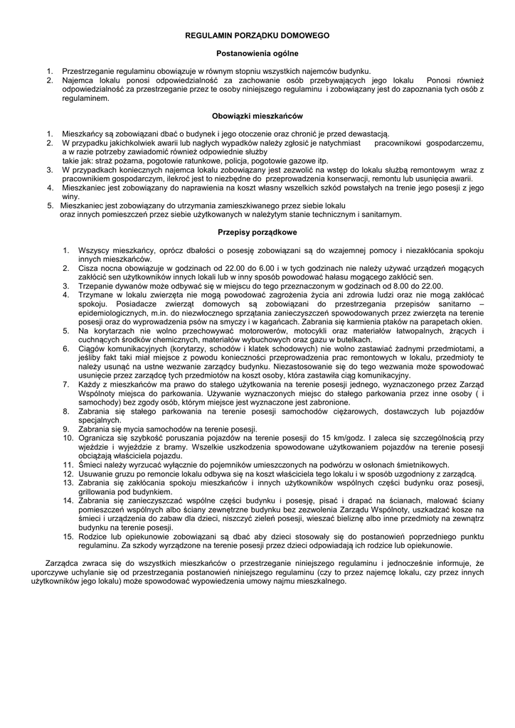 REGULAMIN PORZĄDKU DOMOWEGO Postanowienia ogólne 1. 2. Przestrzeganie regulaminu obowiązuje w równym stopniu wszystkich najemców budynku. Najemca lokalu ponosi odpowiedzialność za zachowanie osób przebywających jego lokalu Ponosi również odpowiedzialność za przestrzeganie przez te osoby niniejszego regulaminu i zobowiązany jest do zapoznania tych osób z regulaminem. Obowiązki mieszkańców 1. 2. Mieszkańcy są zobowiązani dbać o budynek i jego otoczenie oraz chronić je przed dewastacją. W przypadku jakichkolwiek awarii lub nagłych wypadków należy zgłosić je natychmiast pracownikowi gospodarczemu, a w razie potrzeby zawiadomić również odpowiednie służby takie jak: straż pożarna, pogotowie ratunkowe, policja, pogotowie gazowe itp. 3. W przypadkach koniecznych najemca lokalu zobowiązany jest zezwolić na wstęp do lokalu służbą remontowym wraz z pracownikiem gospodarczym, ilekroć jest to niezbędne do przeprowadzenia konserwacji, remontu lub usunięcia awarii. 4. Mieszkaniec jest zobowiązany do naprawienia na koszt własny wszelkich szkód powstałych na trenie jego posesji z jego winy. 5. Mieszkaniec jest zobowiązany do utrzymania zamieszkiwanego przez siebie lokalu oraz innych pomieszczeń przez siebie użytkowanych w należytym stanie technicznym i sanitarnym. Przepisy porządkowe 1. 2. 3. 4. 5. 6. 7. 8. 9. 10. 11. 12. 13. 14. 15. Wszyscy mieszkańcy, oprócz dbałości o posesję zobowiązani są do wzajemnej pomocy i niezakłócania spokoju innych mieszkańców. Cisza nocna obowiązuje w godzinach od 22.00 do 6.00 i w tych godzinach nie należy używać urządzeń mogących zakłócić sen użytkowników innych lokali lub w inny sposób powodować hałasu mogącego zakłócić sen. Trzepanie dywanów może odbywać się w miejscu do tego przeznaczonym w godzinach od 8.00 do 22.00. Trzymane w lokalu zwierzęta nie mogą powodować zagrożenia życia ani zdrowia ludzi oraz nie mogą zakłócać spokoju. Posiadacze zwierząt domowych są zobowiązani do przestrzegania przepisów sanitarno – epidemiologicznych, m.in. do niezwłocznego sprzątania zanieczyszczeń spowodowanych przez zwierzęta na terenie posesji oraz do wyprowadzenia psów na smyczy i w kagańcach. Zabrania się karmienia ptaków na parapetach okien. Na korytarzach nie wolno przechowywać motorowerów, motocykli oraz materiałów łatwopalnych, żrących i cuchnących środków chemicznych, materiałów wybuchowych oraz gazu w butelkach. Ciągów komunikacyjnych (korytarzy, schodów i klatek schodowych) nie wolno zastawiać żadnymi przedmiotami, a jeśliby fakt taki miał miejsce z powodu konieczności przeprowadzenia prac remontowych w lokalu, przedmioty te należy usunąć na ustne wezwanie zarządcy budynku. Niezastosowanie się do tego wezwania może spowodować usunięcie przez zarządcę tych przedmiotów na koszt osoby, która zastawiła ciąg komunikacyjny. Każdy z mieszkańców ma prawo do stałego użytkowania na terenie posesji jednego, wyznaczonego przez Zarząd Wspólnoty miejsca do parkowania. Używanie wyznaczonych miejsc do stałego parkowania przez inne osoby ( i samochody) bez zgody osób, którym miejsce jest wyznaczone jest zabronione. Zabrania się stałego parkowania na terenie posesji samochodów ciężarowych, dostawczych lub pojazdów specjalnych. Zabrania się mycia samochodów na terenie posesji. Ogranicza się szybkość poruszania pojazdów na terenie posesji do 15 km/godz. I zaleca się szczególnością przy wjeździe i wyjeździe z bramy. Wszelkie uszkodzenia spowodowane użytkowaniem pojazdów na terenie posesji obciążają właściciela pojazdu. Śmieci należy wyrzucać wyłącznie do pojemników umieszczonych na podwórzu w osłonach śmietnikowych. Usuwanie gruzu po remoncie lokalu odbywa się na koszt właściciela tego lokalu i w sposób uzgodniony z zarządcą. Zabrania się zakłócania spokoju mieszkańców i innych użytkowników wspólnych części budynku oraz posesji, grillowania pod budynkiem. Zabrania się zanieczyszczać wspólne części budynku i posesję, pisać i drapać na ścianach, malować ściany pomieszczeń wspólnych albo ściany zewnętrzne budynku bez zezwolenia Zarządu Wspólnoty, uszkadzać kosze na śmieci i urządzenia do zabaw dla dzieci, niszczyć zieleń posesji, wieszać bieliznę albo inne przedmioty na zewnątrz budynku na terenie posesji. Rodzice lub opiekunowie zobowiązani są dbać aby dzieci stosowały się do postanowień poprzedniego punktu regulaminu. Za szkody wyrządzone na terenie posesji przez dzieci odpowiadają ich rodzice lub opiekunowie. Zarządca zwraca się do wszystkich mieszkańców o przestrzeganie niniejszego regulaminu i jednocześnie informuje, że uporczywe uchylanie się od przestrzegania postanowień niniejszego regulaminu (czy to przez najemcę lokalu, czy przez innych użytkowników jego lokalu) może spowodować wypowiedzenia umowy najmu mieszkalnego.
