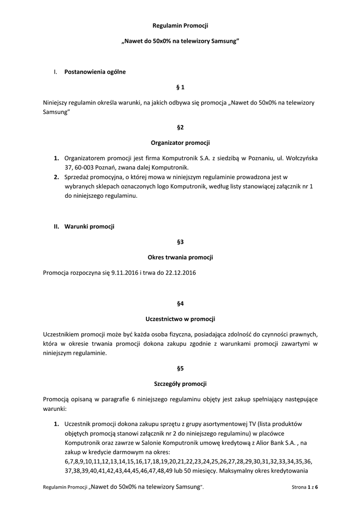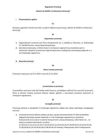 Regulamin Promocji „Nawet do 50x0% na telewizory Samsung” I. Postanowienia ogólne §1 Niniejszy regulamin określa warunki, na jakich odbywa się promocja „Nawet do 50x0% na telewizory Samsung” §2 Organizator promocji 1. Organizatorem promocji jest firma Komputronik S.A. z siedzibą w Poznaniu, ul. Wołczyńska 37, 60-003 Poznań, zwana dalej Komputronik. 2. Sprzedaż promocyjna, o której mowa w niniejszym regulaminie prowadzona jest w wybranych sklepach oznaczonych logo Komputronik, według listy stanowiącej załącznik nr 1 do niniejszego regulaminu. II. Warunki promocji §3 Okres trwania promocji Promocja rozpoczyna się 9.11.2016 i trwa do 22.12.2016 §4 Uczestnictwo w promocji Uczestnikiem promocji może być każda osoba fizyczna, posiadająca zdolność do czynności prawnych, która w okresie trwania promocji dokona zakupu zgodnie z warunkami promocji zawartymi w niniejszym regulaminie. §5 Szczegóły promocji Promocją opisaną w paragrafie 6 niniejszego regulaminu objęty jest zakup spełniający następujące warunki: 1. Uczestnik promocji dokona zakupu sprzętu z grupy asortymentowej TV (lista produktów objętych promocją stanowi załącznik nr 2 do niniejszego regulaminu) w placówce Komputronik oraz zawrze w Salonie Komputronik umowę kredytową z Alior Bank S.A. , na zakup w kredycie darmowym na okres: 6,7,8,9,10,11,12,13,14,15,16,17,18,19,20,21,22,23,24,25,26,27,28,29,30,31,32,33,34,35,36, 37,38,39,40,41,42,43,44,45,46,47,48,49 lub 50 miesięcy. Maksymalny okres kredytowania Regulamin Promocji „Nawet do 50x0% na telewizory Samsung”. Strona 1 z 6 przypisany jest do poszczególnego produktu oraz wskazany w załączniku nr 2 do niniejszego regulaminu. §6 Bonus promocyjny Bonus promocyjny polega na: 1. Odstąpieniu od naliczenia kosztów kapitału kredytu konsumenckiego w wysokości uzależnionej od wartości kapitału oraz okresu kredytowania w ramach kredytu promocyjnego zawartego na okres 6,7,8,9,10,11,12,13,14,15,16,17,18,19,20,21,22,23,24,25,26,27,28,29,30,31,32,33,34, 35,36,37,38,39,40,41,42,43,44,45,46,47,48,49 lub 50 miesięcy. §7 Tryb składania i rozpatrywania reklamacji 1. Uczestnicy promocji mogą składać reklamacje dotyczące przebiegu promocji w ciągu 30 dni od daty jej zakończenia. 2. Reklamacje sporządzone na piśmie powinny zostać dostarczone do siedziby Organizatora na adres wskazany w §2 z dopiskiem „Nawet do 50x0% na telewizory Samsung” 3. Termin rozpatrzenia reklamacji wynosi do 14 dni roboczych od daty wpływu pisma reklamacyjnego. §8 Postanowienia końcowe 1. Treść niniejszego regulaminu znajduje się: a. w siedzibie Komputronik b. w Salonie Komputronik wskazanym w załączniku nr 1 niniejszego regulaminu. 2. Niniejszy regulamin jest jedynym dokumentem określającym szczegółowe zasady promocji. 3. W sprawach nieuregulowanych niniejszym regulaminem zastosowanie mają: a. Regulamin udzielania kredytów ratalnych Alior Bank, ul. Łopuszańska 38d, 02-232 Warszawa 4. Załącznik nr 1 zawierający listę lokalizacji objętych promocją stanowi integralną część niniejszego regulaminu. 5. Załącznik nr 2 zawierający wykaz produktów objętych promocją „Nawet do 50x0% na telewizory Samsung” stanowi integralną część niniejszego regulaminu. 6. Promocja nie łączy się z innymi ofertami promocyjnymi, chyba że Organizator promocji postanowi inaczej. Regulamin Promocji „Nawet do 50x0% na telewizory Samsung”. Strona 2 z 6 Załącznik nr 1. Wykaz placówek objętych promocją „Nawet do 50x0% na telewizory Samsung”. LP 1 2 3 4 5 6 7 Miejscowość Bełchatów Biała Podlaska Białystok Białystok Bielsk Podlaski Bielsko-Biała Bolesławiec Adres ul. Piłsudskiego 15, 97-400 Bełchatów ul. Moniuszki 12, 21-500 Biała Podlaska ul. Antoniukowska 56 lok.26A/8, 15-845 Białystok ul. Kawaleryjska 4/2, 15-324 Białystok ul. Mickiewicza 58/11, 17-100 Bielsk Podlaski ul. Leszczyńska 20, 43-300 Bielsko-Biała ul. Łokietka 9 lokal 1A Bydgoszcz (Zielone ul. Wojska Polskiego 1, C.H. Zielone Arkady Arkady) Chełm ul. Popiełuszki 11, 22-100 Chełm Chojnice ul. Jana Pawła II 2D, 89-600 Chojnice Chrzanów ul. Trzebińska 40, 32-500 Chrzanów Czarnków ul. Kościuszki 53, 64-700 Czarnków Częstochowa ul. Wojska Polskiego 207, 42-202 Częstochowa Dzierżoniów ul. Bohaterów Getta 10, 58-200 Dzierżoniów Elbląg ul. Rybacka 32a, 82-300 Elbląg Garwolin ul. Długa 1, 08-400 Garwolin Gdańsk ul. Złota Karczma 26, 80-286 Gdańsk Gdańsk al. Grunwaldzka 141, 80-264 Gdańsk Gdynia ul. 10 lutego 16, 81-364 Gdynia Gliwice ul. Lipowa 1, 44-102 Gliwice Gniezno ul. Warszawska 7, 62-200 Gniezno Gorlice ul. Biecka 1, 38-300 Gorlice Gorzów Wlkp. al. Konstytucji 3 maja 102, 66-400 Gorzów Wlkp. Grójec ul. Bankowa 8a 05-600 Grójec Grudziądz ul. Włodka 11, 86-300 Grudziądz C.H. Unia Park Iława ul. Kopernika 5B, 14-200 Iława Jarosław ul. 3-go Maja 33a, 37-500 Jarosław Jastrzębie Zdrój ul. Piłsudskiego 25, 44-335 Jastrzębie Zdrój Jaworzno ul. Grunwaldzka 119, 43-600 Jaworzno Jelenia Góra ul. 1 Maja 70, 58-500 Jelenia Góra Kalisz ul. Podmiejska 54, 62-800 Kalisz Katowice ul. Chorzowska 107, 40-101 Katowice Kielce ul. Sienkiewicza 11, 25-350 Kielce Komorniki (Outlet) ul. Krzysztofa Kolumba 8, 62-052 Komorniki Konin ul. Chopina 23d lokal 3,62-510 Konin Kościan ul. Szczepanowskiego 23, 64-000 Kościan Kraków ul. Kamieńskiego 11, 30-644 Kraków Krosno ul. Czajkowskiego 94, 38-400 Krosno Lubin ul. Rynek 28, 59-300 Lubin Lublin ul. Lipowa 13, 20-024 Lublin Lublin ul. Orkana 4 20-504 Lublin Lwówek ul. Rynek 31, 64-310 Lwówek Regulamin Promocji „Nawet do 50x0% na telewizory Samsung”. 8 9 10 11 12 13 14 15 16 17 18 19 20 21 22 23 24 25 26 27 28 29 30 31 32 33 34 35 36 37 38 39 40 41 42 Strona 3 z 6 43 44 45 46 47 48 49 50 51 52 53 54 55 56 57 58 59 60 61 62 63 64 65 66 67 68 69 70 71 72 73 74 75 76 77 78 79 80 81 82 83 84 85 86 87 88 Łódź Łuków Mielec Międzychód Nowe Miasto Lubawskie Nowy Sącz Nowy Targ Olecko Ol