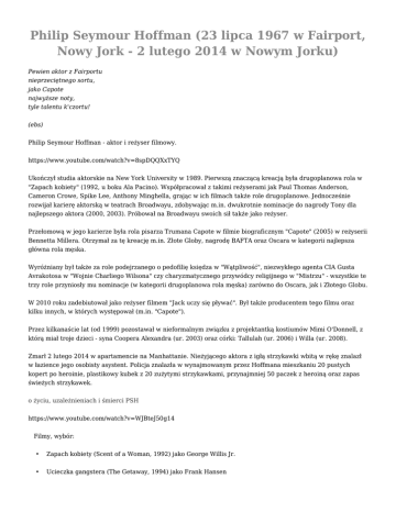 Philip Seymour Hoffman (23 lipca 1967 w Fairport, Nowy Jork - 2 lutego 2014 w Nowym Jorku) Pewien aktor z Fairportu nieprzeciętnego sortu, jako Capote najwyższe noty, tyle talentu k'czortu! (ebs) Philip Seymour Hoffman - aktor i reżyser filmowy. https://www.youtube.com/watch?v=8spDQQXxTYQ Ukończył studia aktorskie na New York University w 1989. Pierwszą znaczącą kreacją była drugoplanowa rola w "Zapach kobiety" (1992, u boku Ala Pacino). Współpracował z takimi reżyserami jak Paul Thomas Anderson, Cameron Crowe, Spike Lee, Anthony Minghella, grając w ich filmach także role drugoplanowe. Jednocześnie rozwijał karierę aktorską w teatrach Broadwayu, zdobywając m.in. dwukrotnie nominacje do nagrody Tony dla najlepszego aktora (2000, 2003). Próbował na Broadwayu swoich sił także jako reżyser. Przełomową w jego karierze była rola pisarza Trumana Capote w filmie biograficznym "Capote" (2005) w reżyserii Bennetta Millera. Otrzymał za tę kreację m.in. Złote Globy, nagrodę BAFTA oraz Oscara w kategorii najlepsza główna rola męska. Wyróżniany był także za role podejrzanego o pedofilię księdza w "Wątpliwość", niezwykłego agenta CIA Gusta Avrakotosa w "Wojnie Charliego Wilsona" czy charyzmatycznego przywódcy religijnego w "Mistrzu" - wszystkie te trzy role przyniosły mu nominacje (w kategorii drugoplanowa rola męska) zarówno do Oscara, jak i Złotego Globu. W 2010 roku zadebiutował jako reżyser filmem "Jack uczy się pływać". Był także producentem tego filmu oraz kilku innych, w których występował (m.in. "Capote"). Przez kilkanaście lat (od 1999) pozostawał w nieformalnym związku z projektantką kostiumów Mimi O'Donnell, z którą miał troje dzieci - syna Coopera Alexandra (ur. 2003) oraz córki: Tallulah (ur. 2006) i Willa (ur. 2008). Zmarł 2 lutego 2014 w apartamencie na Manhattanie. Nieżyjącego aktora z igłą strzykawki wbitą w rękę znalazł w łazience jego osobisty asystent. Policja znalazła w wynajmowanym przez Hoffmana mieszkaniu 20 pustych kopert po heroinie, plastikowy kubek z 20 zużytymi strzykawkami, przynajmniej 50 paczek z heroiną oraz zapas świeżych strzykawek. o życiu, uzależnieniach i śmierci PSH https://www.youtube.com/watch?v=WJBteJ50g14 Filmy, wybór: • Zapach kobiety (Scent of a Woman, 1992) jako George Willis Jr. • Ucieczka gangstera (The Getaway, 1994) jako Frank Hansen • Twister (1996) jako Dusty • Big Lebowski (The Big Lebowski, 1998) jako Brandt • Magnolia (1999) jako Phil Parma • Utalentowany pan Ripley (The Talented Mr. Ripley, 1999) jako Freddie Miles • 25. godzina (25th Hour, 2002) jako Jakob Elinsky • Hazardzista (Owning Mahowny, 2003) jako Dan Mahowny • Nadchodzi Polly (Along Came Polly, 2004) jako Sandy Lyle • Capote (2005) jako Truman Capote • Nim diabeł dowie się, że nie żyjesz (Before the devil knows you're dead, 2007) jako Andy Hanson • Wojna Charliego Wilsona (2007) jako Gust Avrakotos • Wątpliwość (2008) jako Ojciec Brendan Flynn • Idy marcowe (The Ides of March, 2011) jako Paul Zara • Mistrz (The Master, 2012) jako Lancaster Dodd • A Late Quartet (2012) jako Robert https://www.youtube.com/watch?v=lbi3Q-ZkPJ8 • Igrzyska śmierci: W pierścieniu ognia (The Hunger Games: Catching Fire, 2013) jako Plutarch Heavensbee • Bardzo poszukiwany człowiek (A Most Wanted Man, 2014) jako Günther Bachmann • God's Pocket (2014) jako Mickey Scarpato • Igrzyska śmierci: Kosogłos (The Hunger Games: Mockingjay, 2014/2015) jako Plutarch Heavensbee