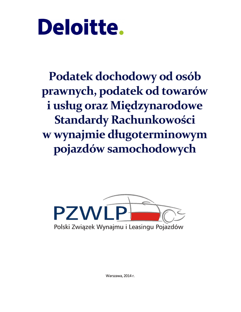 Podatek dochodowy od osób prawnych, podatek od towarów i usług oraz Międzynarodowe Standardy Rachunkowości w wynajmie długoterminowym pojazdów samochodowych Warszawa, 2014 r. Szanowni Państwo, Oddajemy w Państwa ręce zaktualizowane opracowanie dotyczące zagadnień podatkowych oraz rachunkowych związanych z wykorzystywaniem pojazdów samochodowych w prowadzonej działalności gospodarczej. W praktyce, najbardziej popularną formą wynajmu długoterminowego pojazdów jest leasing operacyjny, o którym mowa w art. 17b ust. 1 ustawy o podatku dochodowym od osób prawnych. Dlatego też, niniejsze opracowanie skupia się przede wszystkim na zagadnieniach związanych z tą właśnie formą leasingu. Celem niniejszego opracowania jest ujednolicenie i przybliżenie terminów pojawiających się w procesie rozliczania dla celów podatkowych oraz rachunkowych długoterminowego najmu pojazdów, w szczególności leasingu. W opracowaniu odnosimy się do zagadnień na gruncie ustawy o podatku dochodowym od osób prawnych (dalej „ustawa o PDOP”), ustawy o podatku od towarów i usług (dalej „ustawa o VAT”), Międzynarodowych Standardów Rachunkowości (dalej „MSR”) oraz ustawy o rachunkowości (dalej „UoR”). Podstawową zaletą niniejszego dokumentu jest to, że jego treść została uzgodniona przez członków Polskiego Związku Wynajmu i Leasingu Pojazdów z doradcą podatkowym1, przez co nabiera on cech wspólnego stanowiska w odniesieniu do zagadnień podatkowych związanych z leasingiem. Ufając, że niniejsze opracowanie będzie dla Państwa pomocne w codziennej pracy, chcielibyśmy podkreślić, że przedstawiony Państwu dokument nie może być traktowany jako formalne stanowisko organów podatkowych oraz nie ma mocy wiążącej dla Państwa doradców lub audytora. Niniejsze opracowanie ma charakter wyłącznie informacyjny, a korzystanie z niego nie powoduje powstania stosunku prawnego, ani faktycznego pomiędzy Polskim Związkiem Wynajmu i Leasingu Pojazdów, doradcą podatkowym Związku a osobami korzystającymi z niniejszego dokumentu. Niniejsze opracowanie odnosi się do stanu prawnego na dzień 30 czerwca 2014 r. 1 Doradcą podatkowym Związku jest Deloitte Doradztwo Podatkowe Sp. z o.o. I. KWESTIE DOTYCZĄCE UMÓW LEASINGU NA GRUNCIE PODATKU DOCHODOWEGO OD OSÓB PRAWNYCH 1. DEFINICJA SAMOCHODU OSOBOWEGO • Zgodnie z art. 4a ust. 9a ustawy o PDOP, za samochód osobowy uznaje się – co do zasady – „pojazd samochodowy w rozumieniu przepisów o ruchu drogowym, o dopuszczalnej masie całkowitej nieprzekraczającej 3,5 tony, konstrukcyjnie przeznaczony do przewozu nie więcej niż 9 osób łącznie z kierowcą”. • Jednocześnie, ustawa o PDOP przewiduje pewne wyjątki od wskazanej powyżej zasady ogólnej, w świetle których pewne typy pojazdów pomimo spełnienia przytoczonej powyżej definicji, nie będą traktowane dla celów PDOP jako samochody osobowe. • Wyjątki takie obejmują m.in. pojazdy samochodowe, których konstrukcja świadczy o przystosowaniu do przewozu ładunków, niektóre pojazdy specjalne, pojazdy klasyfikowane na podstawie przepisów prawa o ruchu drogowym do podrodzaju: wielozadaniowy, van, przy czym spełnienie wymagań pozwalających na niezaliczenie tego typu pojazdów do samochodów osobowych dla celów PDOP, powinno zostać stwierdzone – co do zasady – na podstawie dodatkowego badania technicznego przeprowadzonego przez okręgową stację kontroli pojazdów, potwierdzonego zaświadczeniem wydanym przez tę stację oraz dowodu rejestracyjnego pojazdu, zawierającego właściwą adnotację o spełnieniu tych wymagań (w niektórych przypadkach spełnienie takich wymagań stwierdza się na podstawie dokumentów wydanych zgodnie z przepisami o ruchu drogowym). • Pojazdy te, podobnie jak inne pojazdy samochodowe o dopuszczalnej masie całkowitej przekraczającej 3,5 tony, konstrukcyjnie przeznaczone do przewozu więcej niż 9 osób łącznie z kierowcą będą zaklasyfikowane dla celów PDOP jako samochody ciężarowe. • Powyższe rozgraniczenie na samochody osobowe oraz samochody ciężarowe jest o tyle istotne, iż ustawa o PDOP przewiduje pewne ograniczenia w zakresie prawa do zaliczenia do kosztów uzyskania przychodów określonych wydatków związanych z używaniem samochodów osobowych, podczas gdy wydatki związane z używaniem samochodów ciężarowych – co do zasady – mogą zostać w całości zaliczone do kosztów uzyskania przychodów (o ile jednak spełniona zostanie ogólna przesłanka zaliczenia ich do kosztów uzyskania przychodów, o której mowa w art. 15 ust. 1 ustawy o PDOP). • Dlatego też, istotnym dla ustalenia konsekwencji podatkowych leasingu, czy też najmu pojazdu samochodowego jest ustalenie, czy stanowi on samochód osobowy, czy też ciężarowy na gruncie ustawy o PDOP. 2. DEFINICJA LEASINGU • Zawarta w art. 17a pkt 1 ustawy o PDOP definicja „umowy leasingu” ma bardzo szeroki zakres przedmiotowy i obejmuje zarówno umowy leasingu nazwane w art. 709 1 Kodeksu Cywilnego, jak i „każdą inną umowę, na mocy której jedna ze stron, zwana dalej „finansującym”, oddaje do odpłatnego używania albo używania i pobierania pożytków na warunkach określonych w ustawie drugiej stronie, zwanej dalej "korzystającym", podlegające amortyzacji środki trwałe lub wartości niematerialne i prawne, a także grunty oraz prawo wieczystego użytkowania gruntów”. • Elementem rozstrzygającym, czy dana umowa stanowi „umowę leasingu” na gruncie PDOP jest ustalenie czy umowa ta spełnia warunki uznania jej za tzw. umowę leasingu operacyjnego (dalej „Leasing operacyjny”), o której mowa w art. 17b ust. 1 ustawy o PDOP lub tzw. umowę leasingu finansowego, o której mowa w art. 17f ust. 1 ustawy o PDOP. • W przeciwnym wypadku, tj. gdy dana umowa nie spełnia warunków uznania jej za jedną z dwóch wskazanych powyżej kategorii umów leasingu, umowa taka będzie traktowana na gru