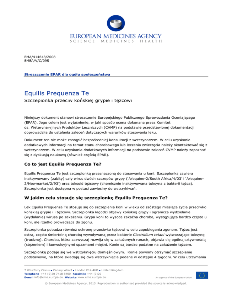 EMA/414643/2008 EMEA/V/C/095 Streszczenie EPAR dla ogółu społeczeństwa Equilis Prequenza Te Szczepionka przeciw końskiej grypie i tężcowi Niniejszy dokument stanowi streszczenie Europejskiego Publicznego Sprawozdania Oceniającego (EPAR). Jego celem jest wyjaśnienie, w jaki sposób ocena dokonana przez Komitet ds. Weterynaryjnych Produktów Leczniczych (CVMP) na podstawie przedstawionej dokumentacji doprowadziła do ustalenia zaleceń dotyczących warunków stosowania leku. Dokument ten nie może zastąpić bezpośredniej konsultacji z weterynarzem. W celu uzyskania dodatkowych informacji na temat stanu chorobowego lub leczenia zwierzęcia należy skontaktować się z weterynarzem. W celu uzyskania dodatkowych informacji na podstawie zaleceń CVMP należy zapoznać się z dyskusją naukową (również częścią EPAR). Co to jest Equilis Prequenza Te? Equilis Prequenza Te jest szczepionką przeznaczoną do stosowania u koni. Szczepionka zawiera inaktywowany (zabity) cały wirus dwóch szczepów grypy (‘A/equine-2/South Africa/4/03’ i ‘A/equine2/Newmarket/2/93’) oraz toksoid tężcowy (chemicznie inaktywowana toksyna z bakterii tężca). Szczepionka jest dostępna w postaci zawiesiny do wstrzykiwań. W jakim celu stosuje się szczepionkę Equilis Prequenza Te? Lek Equilis Prequenza Te stosuje się do szczepienia koni w wieku od szóstego miesiąca życia przeciwko końskiej grypie i i tężcowi. Szczepionka łagodzi objawy końskiej grypy i ogranicza wydzielanie (wydalanie) wirusa po zakażeniu. Grypa koni to wysoce zakaźna choroba, występująca bardzo często u koni, ale rzadko prowadząca do zgonu. Szczepionka pobudza również ochronę przeciwko tężcowi w celu zapobiegania zgonom. Tężec jest ostrą, często śmiertelną chorobą wywoływaną przez bakterie Clostridium tetani wytwarzające toksynę (truciznę). Choroba, która zazwyczaj rozwija się w zakażonych ranach, objawia się ogólną sztywnością (stężeniem) i konwulsyjnymi spazmami mięśni. Konie są bardzo podatne na zakażenie tężcem. Szczepionkę podaje się we wstrzyknięciu domięśniowym. Konie powinny otrzymać szczepienie podstawowe, na które składają się dwa wstrzyknięcia podane w odstępie 4 tygodni. W celu utrzymania 7 Westferry Circus ● Canary Wharf ● London E14 4HB ● United Kingdom Telephone +44 (0)20 7418 8400 Facsimile +44 (0)20 E-mail [email protected] Website www.ema.europa.eu An agency of the European Union © European Medicines Agency, 2013. Reproduction is authorised provided the source is acknowledged. odporności konie powinny zostać ponownie zaszczepione. Pełny schemat szczepienia znajduje się w ulotce dla pacjenta. Jak działa szczepionka Equilis Prequenza Te? Szczepionka Equilis Prequenza Te zawiera inaktywowane szczepy całego wirusa grypy, przeciwko którym wskazane jest szczepienie. Te wirusy końskiej grypy zostały inaktywowane, tak by nie mogły wywoływać choroby. Szczepionka zawiera również oczyszczony toksoid tężca. Toksoid jest toksyną przetworzoną w taki sposób, aby usunąć jej właściwości toksyczne, ale by nadal została rozpoznawana przez układ odpornościowy. Działanie szczepionek polega na uczeniu układu odpornościowego, w jaki sposób bronić się przed chorobami. Po podaniu szczepionki koniowi układ odpornościowy rozpoznaje wirusa i toksoid jako obce ciała i wytwarza przeciwko nim przeciwciała. W przyszłości, gdy układ odpornościowy zostanie narażony na działanie tych szczepów wirusów lub niezmodyfikowanych toksyn, będzie mógł szybciej wytwarzać przeciwciała. Przeciwciała pomogą w ochronie przed końską grypą i tężcem. Wirusy zawarte w obecnym składzie Equilis Prequenza Te są hodowane w komórkach ssaków, w odróżnieniu od tych zawartych we wstępnym składzie preparatu, hodowanych w jajach kurzych. Szczepionka zawiera również adiuwant w celu wzmocnienia odpowiedzi immunologicznej. Jak badano lek Equilis Prequenza Te? Bezpieczeństwo wstępnego składu szczepionki Equilis Prequenza Te badano w kilku badaniach w warunkach laboratoryjnych i terenowych na dużej liczbie koni powyżej drugiego miesiąca życia. Skuteczność szczepionki Equilis Prequenza Te wstępnie badano w kilku badaniach w warunkach laboratoryjnych i terenowych. Z przyczyn etycznych nie przeprowadzano doświadczeń z narażeniem na zakażenie tężcem. Głównym kryterium oceny skuteczności szczepionki Equilis Prequenza Te przeciwko końskiej grypie był było wytworzenie ochronnego poziomu przeciwciał przeciwko antygenom grypy. W badaniach porównano także objawy kliniczne i siewstwo wirusa w szczepionych grupach koni i grupach kontrolnych (konie nieszczepione i szczepione konkurencyjną szczepionką). W przypadku tężca głównym kryterium oceny skuteczności było wytwarzanie ochronnego poziomu przeciwciał przeciwko toksoidowi tężca. Skuteczność obecnego składu szczepionki oceniono w dodatkowych badaniach laboratoryjnych. Jakie korzyści ze stosowania leku Equilis Prequenza Te zaobserwowano w badaniach? W badaniach wykazano, że produkt Equilis Prequenza Te jest skuteczną szczepionką przeciwko końskiej grypie do stosowania u koni w wieku od 6 miesiąca życia w celu zmniejszenia nasilenia objawów klinicznych i siewstwa wirusa po zakażeniu oraz przeciwko tężcowi w celu zapobiegania zgonom. Konie wytworzyły ochronny poziom przeciwciał w dwa tygodnie po szczepieniu podstawowym. Ochrona utrzymywała się 5 miesięcy po szczepieniu podstawowym i 12 miesięcy po pierwszym szczepieniu przypominającym w przypadku grypy koni oraz 17 miesięcy po szczepieniu podstawowym i 24 miesiące po pierwszym szczepieniu przypominającym w przypadku tężca. Szczepionka Equine Prequenza Te w obecnym składzie wykazała podobne wyniki do tych we wstępnych badaniach. Equilis Prequenza Te EMA/414643/2008 Strona 2/3 Jakie ryzyko wiąże się ze stosowaniem szczepionki Equilis Prequenza Te? W miejscu wstrzyknięcia może wystąpić tęg