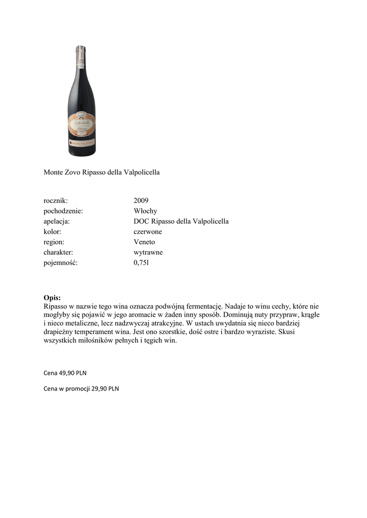 Monte Zovo Ripasso della Valpolicella rocznik: pochodzenie: apelacja: kolor: region: charakter: pojemność: 2009 Włochy DOC Ripasso della Valpolicella czerwone Veneto wytrawne 0,75l Opis: Ripasso w nazwie tego wina oznacza podwójną fermentację. Nadaje to winu cechy, które nie mogłyby się pojawić w jego aromacie w żaden inny sposób. Dominują nuty przypraw, krągłe i nieco metaliczne, lecz nadzwyczaj atrakcyjne. W ustach uwydatnia się nieco bardziej drapieżny temperament wina. Jest ono szorstkie, dość ostre i bardzo wyraziste. Skusi wszystkich miłośników pełnych i tęgich win. Cena 49,90 PLN Cena w promocji 29,90 PLN Chateau Paret rocznik: pochodzenie: apelacja: kolor: region: szczep: charakter: pojemność: 2009 Francja AOC Bordeaux czerwone Bordeaux Cabernet Franc, Cabernet Sauvignon wytrawne 0,75 Opis: Apelacja Castillon Cotes de Bordeaux leży w pobliżu St. Emilion i w dużej mierze korzysta z podobnych warunków klimatycznych, co znamienity sąsiad. Wino stworzone z 85% Merlot, 10% Cabernet Sauvignon i 5% Cabernet Franc jest pełne bogatego owocowego aromatu, z przewagą truskawki i maliny. W ustach wino jest gładkie i dosyć pełne, ponownie bogate w smak dojrzałego owocu. Posmak jest harmonijny i w miarę długi. Bardzo dobry kompan większości czerwonych mięs. Doskonałe do: wieprzowina, wołowina, sery, dziczyzna Cena 39,90 PLN Cena w promocji 22,90 PLN Gavioli Prosecco rocznik: pochodzenie: apelacja: kolor: region: szczep: charakter: pojemność: NV Włochy DOP Prosecco musujące Veneto Prosecco wytrawne 0,75 Opis: Dobre, zwarte Prosecco. Ma zdrowy, krzepki aromat przywodzący na myśl chleb na zakwasie i mokry krzemień - to nuty tak typowe dla tego gatunku wina. W smaku lekka mineralność, skórka cytrusów i doskonała równowaga. Bardzo satysfakcjonujące! Cena 39,90 PLN Cena w promocji 22,90 PLN La Font Louisiane - Gigondas la Cave rocznik: pochodzenie: apelacja: kolor: region: szczep: charakter: pojemność: 2010 Francja AOC Cotes du Rhone czerwone Rhone grenache wytrawne 0,75l Opis: Zaskakująca cena za wino z 80% Grenache. Ciepły i słoneczny zapach, z soczystym i wyjątkowo miękkim smaku. Nuty lukrecji i suszonych śliwek. W posmaku ciepłe, lekko pieprzne, dające satysfakcję. Cena 39,90 PLN Cena w promocji 22,90 PLN Campo Lindo Reserva rocznik: pochodzenie: apelacja: kolor: region: charakter: pojemność: 2006 Hiszpania Denominacio d'Origen Pla De Bages czerwone Katalonia wytrawne 0,75 Opis: Reserva ta jest starszym kuzynem Crianzy. Tu również zastosowano mieszankę Tempranillo i Syrah, jednak w tym wypadku starzenie trwało aż 14 miesięcy. Nadało ono winu więcej aromatów waniliowych, które przykryły dominujące w młodszym winie smaki dojrzałych owoców. Pozostała jednak krągłość i gibkość, która czyni to wino uniwersalnym w zastosowaniach kulinarnych. Cena 34,90 PLN Cena w promocji 19,90 PLN Casa de las Especias Crianza rocznik: pochodzenie: apelacja: kolor: region: szczep: charakter: pojemność: starzenie: 2006 Hiszpania DO Yecla czerwone La Mancha, Rueda i regionalne Monastrell, Cabernet Sauvignon, Syrah wytrawne 750 ml 10 m. w dębie Opis: Crianza jest flagowym produktem tej winnicy. Monastrell, Cabernet Sauvigon oraz Syrah dojrzewają przez 10 miesięcy w beczkach z dębu amerykańskiego i francuskiego. Wino jest nadzwyczaj krzepkie i będzie świetną propozycją dla wszystkich, którzy lubią zdecydowane, tytoniowo-czekoladowe smaki typowe dla słonecznych win Hiszpanii. Zarówno aromat, jak i smak dominuje czarna porzeczka, przyprawiona zielonym pieprzem. Całość jest nadzwyczaj skoncentrowana, a garbnikowa końcówka przywodzi na myśl rozgrzaną słońcem ziemię. Cena 49,90 PLN Cena w promocji 19,90 PLN Courela - Cortes de Cima rocznik: pochodzenie: apelacja: kolor: charakter: pojemność: 2010 Portugalia wino stołowe czerwone wytrawne 750 ml Opis: Courela to podstawowe wino czerwone powstające w Cortes de Cima. Jak przystało jednak na winnicę będącą chlubą Alentejo, jest to produkt wysokiej jakości. Tworzone w większości z Aragonez (55%), z dodatkiem Syrah (35%) oraz Touriga Nacional (10%) wino odznacza się głęboką wiśniowo-fioletową barwą i dojrzałym aromatem owoców leśnych, malin i wiśni. Jego największym atutem jest świeżość; jest ono też od razu gotowe do picia, nie wymaga bowiem dekantacji. Zadowoli wszystkich lubiących szczere, niezmanipulowane i odzwierciedlające charakter siedliska wina. Cena 29,90 PLN Cena w promocji 13,90 PLN