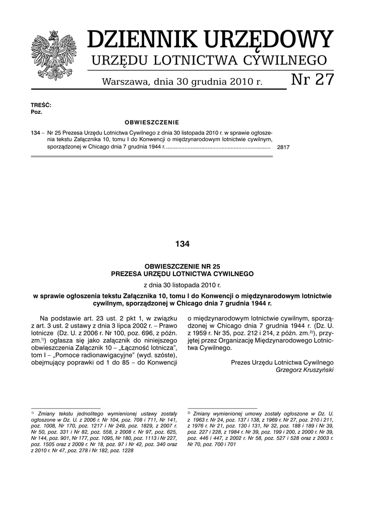 134 – Nr 25 Prezesa Urzędu Lotnictwa Cywilnego z dnia 30 listopada 2010 r. w sprawie ogłoszenia tekstu Załącznika 10, tomu I do Konwencji o międzynarodowym lotnictwie cywilnym,