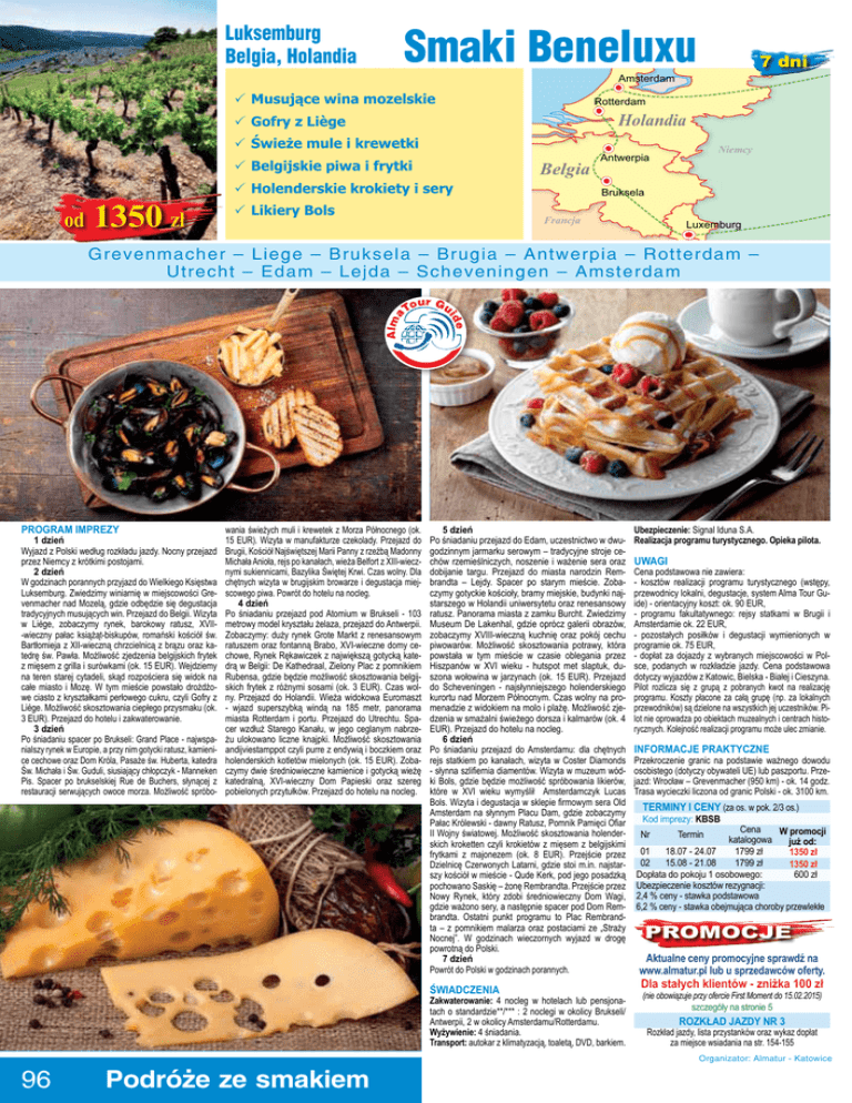Luksemburg Belgia, Holandia Smaki Beneluxu 7 dni Amsterdam PMusujące wina mozelskie Rotterdam Holandia PGofry z Liège PŚwieże mule i krewetki PBelgijskie piwa i frytki od 1350 zł PHolenderskie krokiety i sery PLikiery Bols Belgia Niemcy Antwerpia Bruksela Francja Luxemburg Grevenmacher – Liege – Bruksela – Brugia – Antwerpia – Rotterdam – Utrecht – Edam – Lejda – Scheveningen – Amsterdam Paryż Switzerland Trebic Czechy Program imprezy 1 dzień Wyjazd z Polski według rozkładu jazdy. Nocny przejazd przez Niemcy z krótkimi postojami. 2 dzień W godzinach porannych przyjazd do Wielkiego Księstwa Luksemburg. Zwiedzimy winiarnię w miejscowości Grevenmacher nad Mozelą, gdzie odbędzie się degustacja tradycyjnych musujących win. Przejazd do Belgii. Wizyta w Liège, zobaczymy rynek, barokowy ratusz, XVII-wieczny pałac książąt-biskupów, romański kościół św. Bartłomieja z XII-wieczną chrzcielnicą z brązu oraz katedrę św. Pawła. Możliwość zjedzenia belgijskich frytek z mięsem z grilla i surówkami (ok. 15 EUR). Wejdziemy na teren starej cytadeli, skąd rozpościera się widok na całe miasto i Mozę. W tym mieście powstało drożdżowe ciasto z kryształkami perłowego cukru, czyli Gofry z Liège. Możliwość skosztowania ciepłego przysmaku (ok. 3 EUR). Przejazd do hotelu i zakwaterowanie. 3 dzień Po śniadaniu spacer po Brukseli: Grand Place - najwspanialszy rynek w Europie, a przy nim gotycki ratusz, kamienice cechowe oraz Dom Króla, Pasaże św. Huberta, katedra Św. Michała i Św. Guduli, siusiający chłopczyk - Manneken Pis. Spacer po brukselskiej Rue de Buchers, słynącej z restauracji serwujących owoce morza. Możliwość spróbo- wania świeżych muli i krewetek z Morza Północnego (ok. 15 EUR). Wizyta w manufakturze czekolady. Przejazd do Brugii, Kościół Najświętszej Marii Panny z rzeźbą Madonny Michała Anioła, rejs po kanałach, wieża Belfort z XIII-wiecznymi sukiennicami, Bazylika Świętej Krwi. Czas wolny. Dla chętnych wizyta w brugijskim browarze i degustacja miejscowego piwa. Powrót do hotelu na nocleg. 4 dzień Po śniadaniu przejazd pod Atomium w Brukseli - 103 metrowy model kryształu żelaza, przejazd do Antwerpii. Zobaczymy: duży rynek Grote Markt z renesansowym ratuszem oraz fontanną Brabo, XVI-wieczne domy cechowe, Rynek Rękawiczek z największą gotycką katedrą w Belgii: De Kathedraal, Zielony Plac z pomnikiem Rubensa, gdzie będzie możliwość skosztowania belgijskich frytek z różnymi sosami (ok. 3 EUR). Czas wolny. Przejazd do Holandii. Wieża widokowa Euromaszt - wjazd superszybką windą na 185 metr, panorama miasta Rotterdam i portu. Przejazd do Utrechtu. Spacer wzdłuż Starego Kanału, w jego ceglanym nabrzeżu ulokowano liczne knajpki. Możliwość skosztowania andijviestamppot czyli purre z endywią i boczkiem oraz holenderskich kotletów mielonych (ok. 15 EUR). Zobaczymy dwie średniowieczne kamienice i gotycką wieżę katedralną, XVI-wieczny Dom Papieski oraz szereg pobielonych przytułków. Przejazd do hotelu na nocleg. 5 dzień Po śniadaniu przejazd do Edam, uczestnictwo w dwugodzinnym jarmarku serowym – tradycyjne stroje cechów rzemieślniczych, noszenie i ważenie sera oraz dobijanie targu. Przejazd do miasta narodzin Rembrandta – Lejdy. Spacer po starym mieście. Zobaczymy gotyckie kościoły, bramy miejskie, budynki najstarszego w Holandii uniwersytetu oraz renesansowy ratusz. Panorama miasta z zamku Burcht. Zwiedzimy Museum De Lakenhal, gdzie oprócz galerii obrazów, zobaczymy XVIII-wieczną kuchnię oraz pokój cechu piwowarów. Możliwość skosztowania potrawy, która powstała w tym mieście w czasie oblegania przez Hiszpanów w XVI wieku - hutspot met slaptuk, duszona wołowina w jarzynach (ok. 15 EUR). Przejazd do Scheveningen - najsłynniejszego holenderskiego kurortu nad Morzem Północnym. Czas wolny na promenadzie z widokiem na molo i plażę. Możliwość zjedzenia w smażalni świeżego dorsza i kalmarów (ok. 4 EUR). Przejazd do hotelu na nocleg. 6 dzień Po śniadaniu przejazd do Amsterdamu: dla chętnych rejs statkiem po kanałach, wizyta w Coster Diamonds - słynna szlifiernia diamentów. Wizyta w muzeum wódki Bols, gdzie będzie możliwość spróbowania likierów, które w XVI wieku wymyślił Amsterdamczyk Lucas Bols. Wizyta i degustacja w sklepie firmowym sera Old Amsterdam na słynnym Placu Dam, gdzie zobaczymy Pałac Królewski - dawny Ratusz, Pomnik Pamięci Ofiar II Wojny światowej. Możliwość skosztowania holenderskich kroketten czyli krokietów z mięsem z belgijskimi frytkami z majonezem (ok. 8 EUR). Przejście przez Dzielnicę Czerwonych Latarni, gdzie stoi m.in. najstarszy kościół w mieście - Qude Kerk, pod jego posadzką pochowano Saskię – żonę Rembrandta. Przejście przez Nowy Rynek, który zdobi średniowieczny Dom Wagi, gdzie ważono sery, a następnie spacer pod Dom Rembrandta. Ostatni punkt programu to Plac Rembrandta – z pomnikiem malarza oraz postaciami ze „Straży Nocnej”. W godzinach wieczornych wyjazd w drogę powrotną do Polski. 7 dzień Powrót do Polski w godzinach porannych. Świadczenia Zakwaterowanie: 4 nocleg w hotelach lub pensjonatach o standardzie**/*** : 2 noclegi w okolicy Brukseli/ Antwerpii, 2 w okolicy Amsterdamu/Rotterdamu. Wyżywienie: 4 śniadania. Transport: autokar z klimatyzacją, toaletą, DVD, barkiem. Polska Ubezpieczenie: Signal Iduna S.A. Realizacja programu turystycznego. Opieka pilota. Uwagi Cena podstawowa nie zawiera: - kosztów realizacji programu turystycznego (wstępy, przewodnicy lokalni, degustacje, system Alma Tour Guide) - orientacyjny koszt: ok. 90 EUR, - programu fakultatywnego: rejsy statkami w Brugii i Amsterdamie ok. 22 EUR, - pozostałych posiłków i degustacji wymienionych w programie ok. 75 EUR, - dopłat za dojazdy z wybranych miejscowości w Polsce, podanych w rozkładzie jazdy. Cena podstawowa dotyczy wyjazdów z Katowic, Bielska - Białej i Cieszyna. Pilot r