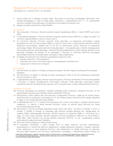 Regulamin Promocji „Konto ważne rok w Orange na Kartę” obowiązuje od 17 grudnia 2015r. do odwołania 1. „Konto ważne rok w Orange na Kartę” (dalej: „Promocja”) to promocja umożliwiająca Abonentom sieci Orange korzystającym z ofert na kartę (dalej: „Abonenci”), z zastrzeżeniem pkt 11 i 15, przedłużenie ważności swojego konta głównego na połączenia wychodzące do jednego roku. 2. Usługa nie dotyczy Abonentów oferty Zetafon. jak korzystać? 3. Aby skorzystać z Promocji, Abonent powinien wysłać bezpłatnego SMS-a o treści START pod numer 8002. 4. O prawidłowej rejestracji w Promocji Abonent zostanie poinformowany SMS-em w ciągu 24 godzin od momentu wysłania SMS-a o którym mowa w pkt 3. 5. W momencie aktywacji Promocji ważność konta głównego na połączenia wychodzące zostaje przedłużona do roku od dnia wysłania SMS-a o którym mowa w pkt 2 i jednocześnie ważność konta na połączenia przychodzące ustalana jest na 30 dni od zakończenia okresu ważności na połączenia wychodzące (dalej: „Promocyjna ważność konta głównego”). W przypadku gdy w trakcie obowiązywania Promocyjnej ważności konta głównego, Abonent dokona doładowania w wyniku którego ważność konta głównego okazałaby się dłuższa niż ta wynikająca z Promocji, to wówczas Abonenta obowiązuje korzystniejsza ważność konta głównego wynikająca z tego doładowania. 6. W każdej chwili Abonent ma możliwość sprawdzenia ważności konta: poprzez krótki kod *124*# [zadzwoń] dzwoniąc pod numer *500 (koszt zgodny z obowiązującym cennikiem) lub logując się na stronie www.orange.pl PREP/PDF74/0813, Strona 1 z 3 Ile to kosztuje: 7. Dla Abonentów ze stażem w Orange na Kartę wynoszącym 93 albo więcej dni aktywacja Promocji jest bezpłatna. 8. Dla Abonentów ze stażem w Orange na Kartę wynoszącym mniej niż 93 dni każdorazowa aktywacja Promocji kosztuje 3 złote. 9. Z zastrzeżeniem pkt 8 powyżej, Abonent może skorzystać z Promocji wielokrotnie. Ponowne skorzystanie z Promocji w trakcie obowiązywania Promocyjnej ważności konta głównego spowoduje kolejne wydłużenie ważności konta głównego zgodnie z pkt 5 powyżej licząc od daty kolejnej aktywacji Promocji. dodatkowe informacje 10. Promocja obowiązuje do odwołania. Operator zastrzega sobie możliwość odwołania Promocji, co nie będzie jednak naruszać praw nabytych przed odwołaniem Promocji. 11. Skorzystanie z oferty Zetafon jest równoznaczne z wyłączeniem Promocji i wiąże się ze zmianą okresu ważności konta na połączenia wychodzące na 31 dni. Zmiana okresu ważności konta nastąpi najpóźniej w ciągu 31 dni od daty aktywacji oferty Zetafon. 12. Z zastrzeżeniem pkt 13 i 14 poniżej, Promocja łączy się z innymi, promocjami i usługami promocyjnymi dostępnym i w ofercie, z której Abonent korzysta, chyba, że warunki danej promocji lub usługi promocyjnej stanowią inaczej. 13. Skorzystanie z Promocji wymaga wyłączenia usług: Numer bez limitu, Za darmo w Orange, 0 zł/min w Orange, 0 zł/SMS w Orange. W przypadku gdy Abonent posiada aktywną ww. usługę/usługi, po wysłaniu SMS-a aktywującego Promocję, Abonent otrzyma od Operatora SMS-a z informacją, że w ciągu 15 minut może anulować zlecenie włączenia Promocji bezpłatnym SMS-em na numer 8002 o treści REZ. Jeżeli Abonent nie anuluje zlecenia włączenia Promocji, to ww. usługa/usługi zostaną automatycznie wyłączone przez Operatora. 14. Promocja nie jest dostępna w ofercie Ekstra Numer. 15. W przypadku korzystania z oferty Orange Free na kartę, ważność bonusów internetowych przyznawanych w ramach tej oferty po doładowaniu, zostaje przedłużona zgodnie z okresem ważności konta ustawionym w chwili aktywacji Promocji, jeśli doładowania te zostały dokonane po aktywacji Promocji (jeżeli ważność tych bonusów internetowych wynikająca z doładowania byłaby dłuższa niż Orange Polska Spółka Akcyjna z siedzibą w Warszawie, adres: 02-326 Warszawa Al. Jerozolimskie 160 zarejestrowana w Sądzie Rejonowym dla m. st. Warszawy XII Wydział Gospodarczy – Krajowego Rejestru Sądowego pod numerem KRS 0000010681, o kapitale zakładowym 3.937.072.437,00 PLN, (NIP 526-02-50-995) Regulamin Promocji „Konto ważne rok w Orange na Kartę” obowiązuje od 17 grudnia 2015r. do odwołania 16. 17. PREP/PDF74/0813, Strona 2 z 3 18. 19. ważność konta głównego wynikającego z Promocji to wówczas obowiązuje korzystniejsza dla Abonenta ważność bonusów wynikająca z doładowania). Promocja jest dostępna w roamingu. Migracje między ofertami w ramach oferty Orange na kartę nie mają wpływu na Promocję, z zastrzeżeniem postanowień punktu 11 niniejszego regulaminu. Regulamin jest dostępny w salonach Orange i salonach partner Orange oraz na stronie www.orange.pl. W pozostałym zakresie stosuje się obowiązujący Abonenta Regulamin świadczenia usług telekomunikacyjnych oraz regulamin oferty z której korzysta Abonent. Orange Polska Spółka Akcyjna z siedzibą w Warszawie, adres: 02-326 Warszawa Al. Jerozolimskie 160 zarejestrowana w Sądzie Rejonowym dla m. st. Warszawy XII Wydział Gospodarczy – Krajowego Rejestru Sądowego pod numerem KRS 0000010681, o kapitale zakładowym 3.937.072.437,00 PLN, (NIP 526-02-50-995) Regulamin Promocji „Konto ważne rok w Orange na Kartę” obowiązuje od 17 grudnia 2015r. do odwołania PREP/PDF74/0813, Strona 3 z 3 20. „Mobilna Sieć Orange – ruchoma publiczna sieć telekomunikacyjna wykorzystująca między innymi takie standardy jak GSM 900/1800 lub UMTS, obsługiwana przez Orange Polska Spółkę Akcyjną z siedzibą i adresem w Warszawie (02-326) przy Al. Jerozolimskich 160, wpisaną do Rejestru Przedsiębiorców prowadzonego przez Sąd Rejonowy dla m.st. Warszawy, XII Wydział Gospodarczy Krajowego Rejestru Sądowego, pod numerem 0000010681; REGON 012100784, NIP 526-02-50-995. Orange Polska S.A. zwana jest w niniejszym regulami