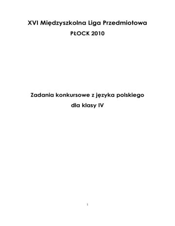 XVI Międzyszkolna Liga Przedmiotowa PŁOCK 2010 Zadania konkursowe z języka polskiego dla klasy IV 1 KOD UCZNIA Witamy Cię na XVI Międzyszkolnej Lidze Przedmiotowej. Przed Tobą zadania konkursowe z języka polskiego dla klasy IV. Instrukcja 1. Przeczytaj uważnie teksty i polecenia. 2. W zadaniach, w których są podane cztery odpowiedzi: A, B, C, D, wybierz tylko jedną i zaznacz znakiem X. 3. Jeżeli się pomylisz, błędną odpowiedź otocz kółkiem i zaznacz inną. 4. Rozwiązania zadań, w których należy samodzielnie sformułować odpowiedź, zapisz czytelnie w wyznaczonych miejscach. Na wykonanie zadań masz 90 minut. Życzymy powodzenia! 2 O miłości i przyjaźni Tekst I (…) I wtedy właśnie mała Gerda weszła przez wielkie wrota do pałacu; wiały wówczas ostre wichry, ale dziewczynka odmówiła wieczorną modlitwę i wtedy wiatry ułożyły się, jak gdyby chciały spać, a dziewczynka weszła do wielkiej pustej, zimnej Sali. Zobaczyła Kaya, poznała go, rzuciła mu się na szyję, objęła go mocno i wołała: - Kay, drogi, mały Kay! Nareszcie Cię odnalazłam! Ale on siedział zupełnie cicho, sztywny i zimny. Wtedy zapłakała mała Gerda gorącymi łzami, które spłynęły na jego pierś, dostały się aż do jego serca, roztopiły kawałki lodu i wchłonęły okruszynę szkła; Kay spojrzał na nią, a ona zaśpiewała mu pieśń: Róża przekwita i minie, Chodź pokłońmy się Dziecinie. Wtedy Kay wybuchnął płaczem i odłamek szkła wypadł mu z oka, poznał Gerdę i zawołał radośnie: - Gerdo, kochana, mała Gerdo! Gdzieś była tak długo? I gdzie ja byłem? - Rozejrzał się wokoło – Jakże tu zimno! Jak pusto i rozlegle! I przytulił się mocno do Gerdy, a ona śmiała się i płakała z radości. (…) Jan Christian Andersen, Królowa Śniegu, fragm.,[w:] Baśnie, tom 1, PIW, Warszawa 1977. Zadanie 1. (0-1) Jak zareagował Kay, gdy Gerda weszła do pałacu? A. Ucieszył się na jej widok. B. Rzucił się przyjaciółce na szyję. C. Zapytał, jak dziewczynka weszła do pałacu. D. Pozostał zimny i nieczuły na jej obecność. Zadanie 2. (0-1) Co sprawiło, że Kay rozpoznał Gerdę? A. Objęcie Kaya przez Gerdę. B. Płacz Gerdy i zaśpiewanie piosenki. 3 C. Pocałunek Gerdy w policzek Kaya. D. Czułe słowa szeptane przez Gerdę. Zadanie 3. (0-1) Które słowa opisują komnaty pałacu? A. Udekorowane i wielkie. B. Niewielkie i przytulne. C. Kolorowe i ogromne. D. Puste i zimne. Zadanie 4. (0-1) Wypisz z tekstu porównanie. Zadanie 5. (0-3) Wypisz z tekstu po jednym przykładzie a) zdania oznajmującego b) wypowiedzenia wykrzyknikowego c) zdania pytającego Zadanie 6. (0-1) W zdaniu I wtedy właśnie mała Gerda weszła przez wielkie wrota do pałacu podmiotem jest wyraz A. Gerda. B. wtedy. C. pałacu. D. wrota. Zadanie 7. (0-1) W poniższym zdaniu podkreśl orzeczenie. 4 Ale on siedział zupełnie cicho, sztywny i zimny. Przypomnij sobie treść całego opowiadania Królowa Śniegu i rozwiąż poniższe zadania. Zadanie 8. (0-1) Kay stał się nagle niegrzecznym chłopcem, ponieważ A. B. C. D. ukłuł się kolcem zaczarowanej róży. wpadł mu do oka odłamek diabelskiego lustra. wypił napój zatruty przez czarownicę. wpadł mu do oka płatek śniegu zaczarowany przez złą królową. Zadanie 9. (0-1) W jaki sposób Kay znalazł się w pałacu Królowej Śniegu? A. Podczas śnieżnej zadymki Kay zgubił drogę do domu i trafił do zamku Królowej Śniegu. B. Królowa Śniegu w mroźną noc wyniosła śpiącego Kaya z jego pokoju i na saniach zawiozła do pałacu. C. W czasie zabawy na dworze Kay przywiązał swoje sanki do sań Królowej Śniegu, która zawiozła go do pałacu. D. Gdy Kay w śnieżną noc wyruszył na poszukiwanie pałacu Królowej Śniegu, odnalazły go śnieżne elfy i zaprowadziły do swej pani. Zadanie 10. (0-1) Co sprawiło, że Kay stał się nieczuły na zimno i obojętny na uczucia miłości i przyjaźni? A. Pocałunki Królowej Śniegu. B. Przejmujący mróz. C. Czary złych wróżek. D. Ukłucie w serce soplem lodu. Zadanie 11. (0-1) Kay mógł odejść z pałacu Królowej Śniegu dzięki A. czarom dobrej wróżki. B. miłości przyjaciółki Gerdy. C. dobremu sercu Królowej. 5 D. swej zaradności i pomysłowości. Zadanie 12. (0-2) Podkreśl cechy baśni. występowanie postaci fantastycznych ● opowieści o bogach i bohaterach ● szczęśliwe zakończenie ● występowanie postaci historycznych ● czas i miejsce akcji dokładnie określone ● czas i miejsce akcji niedokładnie określone ● występowanie przedmiotów magicznych ● raz zwycięża dobro, a innym razem zło Tekst II Tej nocy Pinokio zamiast pracować do dziesiątej, pracował do samej północy i zamiast ośmiu koszyczków z łyka zrobił szesnaście. Potem położył się i zasnął. A we śnie ujrzał Wróżkę piękną i uśmiechniętą, która ucałowawszy go, rzekła: „Dzielny z ciebie chłopiec! W nagrodę za twoje dobre serce wybaczam ci wszystkie twoje wybryki, jakie popełniłeś do dnia dzisiejszego. Chłopcy, którzy z takim oddaniem wspierają swoich rodziców w nędzy i pielęgnują ich w chorobach, zawsze zasługują na wielką pochwałę i na wielką miłość, nawet, jeżeli nie mogą uchodzić za wzór posłuszeństwa i dobrego zachowania. W przyszłości kieruj się rozsądkiem, a będziesz szczęśliwy”. W tym momencie sen się skończył i Pinokio obudził się z szeroko otwartymi oczami. A teraz wyobraźcie sobie jego zdziwienie, kiedy obudziwszy się spostrzegł, że już nie był drewnianym pajacem, ale chłopcem, takim jak wszyscy inni. Carlo Collodi, Pinokio, fragm., Nasza Księgarnia, Warszawa 1988. Zadanie 13. (0-1) Z Tekstu II wypisz zdanie będące życiową wskazówką. Zadanie 14. (0-3) Napisz w kilku zdaniach, kim był i skąd wziął się Pinokio. 6 Zadanie 15. (0-2) Odwołaj się do treści całego utworu Pinokio i podaj: a) dwóch bohaterów fantastycznych b) dwóch bohaterów realistycznych Tekst III