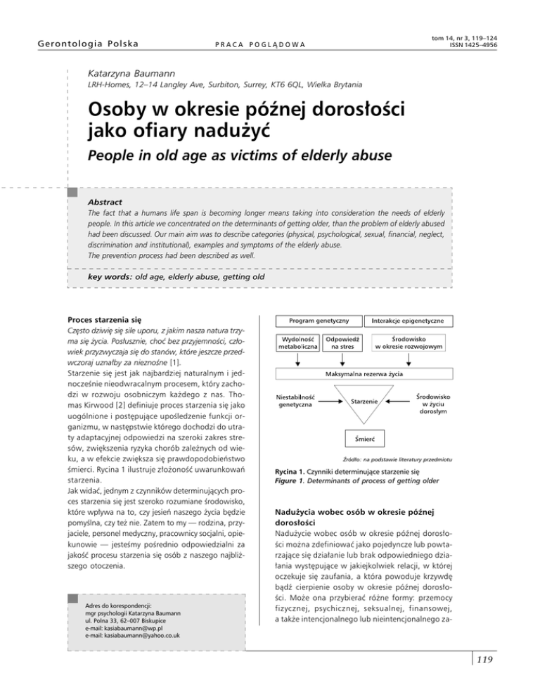 Gerontologia Polska tom 14, nr 3, 119–124 ISSN 1425–4956 PRACA POGLĄDOWA Katarzyna Baumann LRH-Homes, 12–14 Langley Ave, Surbiton, Surrey, KT6 6QL, Wielka Brytania Osoby w okresie późnej dorosłości jako ofiary nadużyć People in old age as victims of elderly abuse Abstract The fact that a humans life span is becoming longer means taking into consideration the needs of elderly people. In this article we concentrated on the determinants of getting older, than the problem of elderly abused had been discussed. Our main aim was to describe categories (physical, psychological, sexual, financial, neglect, discrimination and institutional), examples and symptoms of the elderly abuse. The prevention process had been described as well. key words: old age, elderly abuse, getting old Proces starzenia się Często dziwię się sile uporu, z jakim nasza natura trzyma się życia. Posłusznie, choć bez przyjemności, człowiek przyzwyczaja się do stanów, które jeszcze przedwczoraj uznałby za nieznośne [1]. Starzenie się jest jak najbardziej naturalnym i jednocześnie nieodwracalnym procesem, który zachodzi w rozwoju osobniczym każdego z nas. Thomas Kirwood [2] definiuje proces starzenia się jako uogólnione i postępujące upośledzenie funkcji organizmu, w następstwie którego dochodzi do utraty adaptacyjnej odpowiedzi na szeroki zakres stresów, zwiększenia ryzyka chorób zależnych od wieku, a w efekcie zwiększa się prawdopodobieństwo śmierci. Rycina 1 ilustruje złożoność uwarunkowań starzenia. Jak widać, jednym z czynników determinujących proces starzenia się jest szeroko rozumiane środowisko, które wpływa na to, czy jesień naszego życia będzie pomyślna, czy też nie. Zatem to my — rodzina, przyjaciele, personel medyczny, pracownicy socjalni, opiekunowie — jesteśmy pośrednio odpowiedzialni za jakość procesu starzenia się osób z naszego najbliższego otoczenia. Adres do korespondencji: mgr psychologii Katarzyna Baumann ul. Polna 33, 62–007 Biskupice e-mail: [email protected] e-mail: [email protected] Źródło: na podstawie literatury przedmiotu Rycina 1. Czynniki determinujące starzenie się Figure 1. Determinants of process of getting older Nadużycia wobec osób w okresie późnej dorosłości Nadużycie wobec osób w okresie późnej dorosłości można zdefiniować jako pojedyncze lub powtarzające się działanie lub brak odpowiedniego działania występujące w jakiejkolwiek relacji, w której oczekuje się zaufania, a która powoduje krzywdę bądź cierpienie osoby w okresie późnej dorosłości. Może ona przybierać różne formy: przemocy fizycznej, psychicznej, seksualnej, finansowej, a także intencjonalnego lub nieintencjonalnego za- 119 Gerontologia Polska 2006, tom 14, nr 3 niedbania (definicja podana za The Toronto Declaration on the Global Prevention of Elder Abuse, Toronto 2002)(patrz: www.who.int/hpr/ageing). Aby w pełni zrozumieć zjawisko nadużycia wobec osób w okresie późnej dorosłości, należy uwzględnić: kulturowy kontekst jego występowania, różnice związane z postrzeganiem ról damsko-męskich w danej społeczności oraz grupy osób w okresie późnej dorosłości, które w szczególny sposób narażone są na przemoc — na przykład osoby w bardzo podeszłym wieku, osoby upośledzone fizycznie i/lub psychicznie, kobiety lub osoby ubogie [3]. We wspomnianej deklaracji zwraca się uwagę na kilka istotnych zagadnień związanych ze zjawiskiem przemocy wobec osób w okresie późnej dorosłości [3]: • Brak reakcji w przypadku rozpoznania przemocy wobec osób w okresie późnej dorosłości jest często spowodowany brakiem odpowiednich narzędzi prawnych. • Zapobieganie przemocy wobec osób starszych wymaga zaangażowania wielu środowisk społecznych. • Pracownicy służby zdrowia pierwszego kontaktu odgrywają zasadniczą rolę w reagowaniu na przemoc wobec osób starszych — choć, paradoksalnie, to oni często nie rozpoznają tych przypadków. • Edukacja i rozpowszechnianie informacji za pośrednictwem mediów mają istotne znaczenie w przeciwdziałaniu przemocy wobec osób w okresie późnej dorosłości — dotyczy to zarówno edukacji profesjonalistów, jak i całego społeczeństwa (przełamywanie tabu i obalanie stereotypów odnoszących się do osób w okresie późnej dorosłości). • Przemoc wobec osób w okresie późnej dorosłości jest problemem uniwersalnym. W badaniach wykazuje się, że występuje ona zarówno w krajach uprzemysłowionych, jak i rozwijających się. • Sprawca przemocy jest najczęściej znany ofierze — najwięcej przypadków przemocy ma miejsce w środowisku rodzinnym. Osoby starsze często doświadczają przemocy także ze strony przedstawicieli służb, które są zobowiązane się nimi opiekować. Rodzaje nadużyć W literaturze przedmiotu [4] wyróżnia się siedem głównych kategorii nadużyć wobec osób w okresie późnej dorosłości: fizyczne, psychologiczne, seksualne, finansowe, zaniedbania, dyskryminacja, instytucjonalne. 120 www.gp.viamedica.pl W tabeli 1 w ustrukturalizowany sposób wymieniono i opisano rodzaje nadużyć oraz ich widoczne objawy. Brytyjskie statystyki [8] podają, że każdego roku zwiększa się liczba doniesień dotyczących wykorzystywania osób w okresie późnej dorosłości, zwłaszcza tych, które na stałe przebywają w domach spokojnej starości czy też w domach opieki społecznej. Natomiast amerykańska organizacja Physicians for a Violence-Free Society w latach 1996–2004 odnotowała w Stanach Zjednoczonych 150-procentowy wzrost liczby przypadków nadużyć wobec osób w okresie późnej dorosłości [8]. W ogólnokrajowych badaniach przeprowadzonych w 1996 roku w Stanach Zjednoczonych, wykazano, że rocznie ponad 550 tysięcy osób w wieku 60 lat lub starszych jest ofiarami różnego rodzaju nadużyć. Specjaliści szacują, że prawie 4 razy więcej incydentów nadużyć, zaniedbania lub samozaniedbania nie 