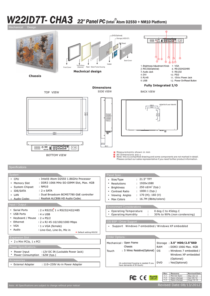 W22ID7T- CHA3 Mechanical 22" Panel PC (Intel R Atom D2550 + NM10 Platform) Design 6 Storage (HDD/CF) SBC Board 1 3 Back Cover Front Cover Touch/Glass (Optional) 7 4 2 5 Inverter Mechnical design Chassis Fully Integrated I/O Dimensions SIDE VIEW BACK VIEW *** BOTTOM VIEW 12 9 11 1. Brightness Adjustment Knob 7. VGA 2. RS-232(Optional) 8. RS-232/422/485 3. Audio Jack 9. RS-232 4. DVI 10. PS/2 5. RJ-45 11. 12VDC Power Jack 6. USB 12. Power On/Reset Button Panel Metal Frame Housing TOP VIEW 10 8 Measurements shown in mm All Dimensions are ± Note: this is a simplified drawing and some components are not marked in detail. Please contact our sales representative if you need further product information. Specifications System : Panel Spec : CPU : Intel® Atom D2550 1.86GHz Processor Size/Type : 21.5” TFT Memory Slot : DDR3 1066 MHz SO-DIMM Slot, Max. 4GB Resolutions : 1920x1080 System Chipset : NM10 Brightness 2 : 250 cd/m (typ.) IDE/SATA : 2 x SATA Contrast Ratio : 1000:1 (typ.) LAN : Dual Broadcom BCM57780 GbE controller Viewing Angles : 170 (H); 160 (V) Audio Codec : Realtek ALC886 HD Audio Codec Max Colors : 16.7M (8bits/colors) Input / Output : Environment Considerations : Serial Ports : 2 x RS232, 1 x RS232/422/485 USB Ports : 4 x USB Operating Temperature Operating Humidity : : 0 deg.C to 45deg.C 30% to 90% (non condensing) Keyboard / Mouse : 2 x PS/2 Ethernet VGA Audio OS BSP / Driver Support : : 2 x RJ 45-10/100/1000 Mbps : 1 x VGA (female) : Line-Out, Line-In, Mic in Support Windows 7 embedded / Windows XP embedded Default setting:RS232 Order Options : Expansion Slot : 2 x Mini PCIe, 1 x PCI Mechanical : Open Frame Chassis Power Specifications : : 12V DC IN (Lockable Power Jack) Power Input Power Consumption : 62W (typ.) Touch : DDR3 1066 Max. 4GB RAM : 5 Wires Resistive(Optional) OS : Windows 7 embedded / Windows XP embedded (Optional) Accessori es : Externa l Adapter Storage : 3.5" HDD/2.5”SSD : 110~230V Ac-in Power Adapter (A customized housing is needed if you have demands of IR touch) : Yes(Optional) DVD Rev. 1.1 1.2 1.3 Note: All Specifications are subject to change without prior notice! Reasons Revise Spec Spec change Spec change Revised Date Mar-05-12 Apr-09-12 Aug-13-12 Revised Date:08/13/2012