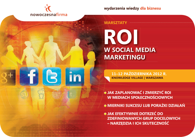 wydarzenia wiedzy dla biznesu WARSZTATY ROI W SOCIAL MEDIA MARKETINGU 11–12 PAŹDZIERNIKA 2012 R. KNOWLEDGE VILLAGE | WARSZAWA JAK ZAPLANOWAĆ I ZMIERZYĆ ROI W MEDIACH SPOŁECZNOŚCIOWYCH MIERNIKI SUKCESU LUB PORAŻKI DZIAŁAŃ JAK EFEKTYWNIE DOTRZEĆ DO ZDEFINIOWANYCH GRUP DOCELOWYCH – NARZĘDZIA I ICH SKUTECZNOŚĆ Szanowni Państwo, Dzięki ROI możemy monitorować inwestycję w reklamę w porównaniu do zysków jakie one przynoszą i wybierać te reklamy, które dają nam większe korzyści biznesowe. Serdecznie zapraszamy na warsztaty „ROI w social media marketingu”, podczas których dowiedzą się Państwo jakich efektów z inwestycji można spodziewać się w przyszłości. Inwestując pieniądze w kampanię reklamową, oczekujemy zwykle odzyskania tej kwoty oraz osiągnięcia dużych zysków. Zaproszeni Eksperci z Praktycy.com, Polkomtela, UPS, NewsPoint oraz Socializer podzielą się swoją wiedzą na temat rozwiązań ułatwiających pomiar działań marketingowych, powiedzą o wyzwaniach oraz jakie są najczęstsze problemy związane z mierzeniem komunikacji i jak sobie z nimi radzić. PODCZAS PRAKTYCZNYCH WARSZTATÓW DOWIESZ SIĘ M.IN.: KONTAKT jak efektywnie dotrzeć do zdefiniowanych grup docelowych jak dobierać wskaźniki efektywności przy planowaniu działań social media marketingowych w jaki sposób mierzyć nowe trendy i mody w marketingu mediów społecznościowych jak skonstruować własny miernik, jak wybrać istotne dane i dobrać odpowiednie działania jak dobrać najbardziej wydajne narzędzia social media dla naszego produktu bądź usługi MARCIN PIOTROWSKI | SPRZEDAŻ UCZESTNICTW [email protected] | tel. +48 /22/ 314 14 16 ALDONA MLONEK | MENEDŻER PROJEKTÓW [email protected] | tel. +48 /22/ 314 14 02 www.wydarzenia.nf.pl Warsztaty będą doskonałą okazją do dyskusji poświęconej problematyce pomiaru efektywności działań marketingowych, z którą borykają się Państwo w codziennej pracy. Specjaliści powiedzą jak postępować, czego unikać oraz jak wykorzystywać media społecznościowe, aby uzyskać zamierzony efekt. ROI w social media marketingu 11–12 PAŹDZIERNIKA 2012 R. KNOWLEDGE VILLAGE | WARSZAWA 11 PAŹDZIERNIKA 2012 | KNOWLEDGE VILLAGE | WARSZAWA 9.30 – 10.00 REJESTRACJA, PORANNA KAWA I ROZPOCZĘCIE WARSZTATÓW Praktyczne aspekty marketingu w social media CASE STUDIES DELL, BURBERRY, OLD SPICE, NAKED PIZZA, JIMMY CHOO, NANTES.PL 10.00 – 12.00 Piotr Krawiec – Dyrektor Zarządzający, Praktycy.com • • • 12.00 – 12.15 Mierniki sukcesu lub porażki działań social media marketingowych Nowe trendy i mody w marketingu mediów społecznościowych – jak je mierzyć Przykłady udanych działań wizerunkowych i sprzedażowych realizowanych w Polsce i na świecie, przy wykorzystaniu social media PRZERWA NA KAWĘ Społecznościowy zawrót głowy: jak rozmawiać i słuchać z wyselekcjonowaną grupą? 12.15 – 14.00 14.00 – 15.00 Tomasz Broda – E–marketing Manager, Polkomtel • • Jak efektywnie dotrzeć do zdefiniowanych grup docelowych w social media marketingu – narzędzia i ich skuteczność Analiza informacji zwrotnych – jak wybrać istotne dane i dobrać odpowiednie działania LUNCH Jak zaplanować i zmierzyć ROI w mediach społecznościowych? 15.00 – 16.30 16.30 Grzegorz Urban – Metamarketing.eu • • Jak dobierać wskaźniki efektywności przy planowaniu działań social media marketingowych Kluczowe zasady doboru narzędzi analitycznych w zależności od założonych celów ZAKOŃCZENIE PIERWSZEGO DNIA WARSZTATÓW ROI w social media marketingu 11–12 PAŹDZIERNIKA 2012 R. KNOWLEDGE VILLAGE | WARSZAWA 12 PAŹDZIERNIKA 2012 | KNOWLEDGE VILLAGE | WARSZAWA 9.30 – 10.00 REJESTRACJA, PORANNA KAWA I ROZPOCZĘCIE WARSZTATÓW Zasady skutecznego pomiaru działań social media marketingowych – narzędzia pomiaru, metody badawcze i mierniki 10.00 – 11.30 11.30 – 11.45 Anna Miotk – Dyrektor rozwoju biznesu, NewsPoint • • • Za pomocą jakich narzędzi można mierzyć efekty działań w social media Czy metoda badawcza ma wpływ na narzędzie? Jak skonstruować własny miernik? PRZERWA NA KAWĘ Wyzwania i problemy związane z mierzeniem komunikacji w Internecie – próba standardów Anna Miotk – Dyrektor rozwoju biznesu, NewsPoint 11.45 – 13.00 • • • Wyzwania mierzenia komunikacji w social media Najbardziej dyskusyjne kwestie – czy Facebook mierzy, to, co mówi, że mierzy? Do czego może służyć Klout? Czy da się zmierzyć wpływ w internecie? A co z ROI? Czy istnieją standardy mierzenia komunikacji? Próby podejmowane przez Internet Advertising Bureau Polska czy Association for Measurement and Evaluation of Communication 13.00 – 13.45 LUNCH Dobór najbardziej efektywnych narzędzi social media dla naszego produktu/usługi 13.45 – 15.00 Łukasz Dębski – Strategy Manager, Socializer • • • 15.00 – 15.15 Dostępne narzędzia miernicze – kluczowe funkcjonalności w działaniach social media marketingowych Najważniejsze serwisy social media w Polsce – możliwości mierzenia skuteczności działań – PRAKTYCZNE PRZYKŁADY ĆWICZENIA DLA UCZESTNIKÓW – analiza wybranych nazw marek, a także związanych z nimi słów kluczowych PRZERWA NA KAWĘ Mierzenie efektów działań na Facebooku – jak robią to najlepsi 15.15 – 16.30 16.30 Łukasz Dębski – Strategy Manager, Socializer • • Skuteczna analiza bezpośrednich działań na Facebooku za pomocą statystyk dostępnych w serwisie Analiza pośrednich działań na Facebooku i innych serwisach społecznościowych – PRZYKŁADY SUCCESS STORIES ZAKOŃCZENIE WARSZTATÓW I WRĘCZENIE CERTYFIKATÓW ROI w social media marketingu 11–12 PAŹDZIERNIKA 2012 R. KNOWLEDGE VILLAGE | WARSZAWA Tomasz Broda – E–marketing Manager, Polkomtel Od ponad 5 lat prowadzi działania związane z szeroko pojętym e–Marketingiem dla marki Plus. Stworzył wiele długofalowych projektów Internetowych, które wykorzystywały