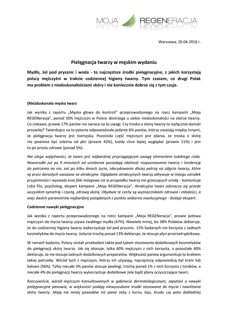 Warszawa, 20.04.2016 r. Pielęgnacja twarzy w męskim wydaniu Mydło, żel pod prysznic i woda - to najczęstsze środki pielęgnacyjne, z jakich korzystają polscy mężczyźni w trakcie codziennej higieny twarzy. Tym czasem, co drugi Polak ma problem z niedoskonałościami skóry i nie koniecznie dobrze się z tym czuje. (Nie)doskonała męska twarz Jak wynika z raportu „Męska głowa do kontroli” przeprowadzonego na rzecz kampanii „Moja REGENeracja”, ponad 50% mężczyzn w Polsce dostrzega u siebie niedoskonałości na skórze twarzy. Co ciekawe, prawie 17% panów nie zwraca na to uwagi. Czy troska o skórę twarzy to wyłącznie damski przywilej? Twierdząco na to pytanie odpowiedziało jedynie 6% panów, którzy uważają między innymi, że pielęgnacja twarzy jest niemęska. Pozostała część mężczyzn jest zdania, że troska o skórę nie powinna być zależna od płci (prawie 42%), każdy chce lepiej wyglądać (prawie 11%) i jest to po prostu zdrowe (ponad 5%). Nie ulega wątpliwości, że twarz jest najbardziej przyciągającym uwagę elementem ludzkiego ciała. Noworodki już po 9 minutach od urodzenia posiadają zdolność rozpoznawania twarzy i tendencję do patrzenia na nie, zaś po kilku dniach życia, zdecydowanie dłużej patrzą na zdjęcia twarzy, które są przez dorosłych uważane za atrakcyjne. Oglądanie atrakcyjnych twarzy aktywuje w mózgu ośrodek przyjemności i wyzwala inne fale mózgowe niż w przypadku twarzy nie grzeszących urodą - komentuje Lidia Flis, psycholog, ekspert kampanii „Moja REGENeracja”. Atrakcyjna twarz odznacza się przede wszystkim symetrią i czystą, zdrową skórą. Obydwie te cechy są wyznacznikami zdrowia i młodości, a więc dwóch parametrów najbardziej pożądanych z punktu widzenia ewolucyjnego - dodaje ekspert. Codzienne nawyki pielęgnacyjne Jak wynika z raportu przeprowadzonego na rzecz kampanii „Moja REGENeracja”, prawie połowa mężczyzn do mycia twarzy używa zwykłego mydła (47%). Niewiele mniej, bo 38% Polaków deklaruje, że do codziennej higieny twarzy wykorzystuje żel pod prysznic. 15% badanych nie korzysta z żadnych kosmetyków do mycia twarzy. Jedynie trochę ponad 13% deklaruje, że stosuje płyn przeciwtrądzikowy. W ramach badania, Polacy zostali przebadani także pod kątem stosowania dodatkowych kosmetyków do pielęgnacji skóry twarzy. Jak się okazuje, tylko 60% mężczyzn z nich korzysta, a pozostałe 40% deklaruje, że nie stosuje żadnych dodatkowych preparatów. Większość panów argumentuje to brakiem takiej potrzeby. Wśród tych z mężczyzn, którzy ich używają, najczęstszą odpowiedzią był krem lub balsam (56%). Tylko niecałe 3% panów stosuje peelingi, trochę ponad 1% z nich korzysta z toników, a niecałe 4% do pielęgnacji twarzy wykorzystuje dodatkowe żele bądź płyny oczyszczające twarz. Rzeczywiście, wśród mężczyzn konsultowanych w gabinecie dermatologicznym, zapytani o nawyki pielęgnacyjne panowie, w większości podają niewyszukane środki stosowane do mycia i nawilżania skóry twarzy. Mają nie mniej powodów niż panie żeby z kurzu, łoju, brudu czy potu dokładniej oczyszczać twarz a biorąc pod uwagę wysuszające i odtłuszczające działanie mydeł i żeli do mycia, widzę konieczność kampanii edukacyjnej i wskazanie potrzeby nawilżania i ochrony skóry skierowanej do panów - komentuje dr Anita Tarajkowska - Olejnik, specjalista dermatolog, ekspert kampanii „Moja REGENeracja”. Męska twarz ma swoje prawa Czy istnieją jakieś różnie pomiędzy skórą twarzy u kobiet i mężczyzn? Okazuje się, że tak i to dosyć spore. Męska skóra jest zdecydowanie grubsza, a dzięki temu mniej wrażliwa - zarówno na oddziaływanie czynników zewnętrznych jak i kosmetyków. Dzięki większej elastyczności jest mniej podatna na proces starzenia, przez co panowie często później zauważają u siebie pierwsze zmarszczki. Jeśli jednak już się pojawią - są znacznie głębsze i trwalsze niż u kobiet. W przypadku większości mężczyzn za jakość ich skóry z biegiem lat odpowiadają także ich codzienne nawyki - niestosowanie preparatów pielęgnacyjnych, nieodpowiednia dieta czy nieużywanie kremów z filtrem. Istotną rolę odgrywają także codzienne nawyki związane z goleniem skóry twarzy, niestosowanie odpowiednich do indywidualnie zróżnicowanych typów cery balsamów pielęgnacyjnych i pianek do golenia czy wreszcie golenie „pod włos” powodujące mikrourazy okołomieszkowe. To wszystko sprawia, że męska skóra twarzy jest narażona na niedoskonałości i często szybsze, niż można by założyć, starzenie. Myślę, że nieprzekonanie panów do koniecznych codziennych nawyków pielęgnacyjnych, by dłużej zachować młody wygląd i zdrową skórę, z czasem zmieni się na bardziej poprawne. Wśród dorosłych pacjentów z grupy wiekowej między 20 a 30 lat obserwuję pomału większe zainteresowanie dermokosmetykami, profilaktyką przeciwnowotworową związaną z używaniem kremów z filtrem, preparatami chroniącymi przed zapaleniem okołomieszkowym w zakresie zarostu czy pielęgnującymi włosy i skórę owłosioną głowy. Zauważam także w codziennej praktyce dermatologa zwiększenie świadomości prozdrowotnej wśród nastoletnich młodzieńców z trądzikiem, którzy niekiedy bardziej nalegają na wizytę u lekarza z powodu problemów z cerą niż ich rodzice, a stosowania koniecznych peelingów, leków miejscowych czy kremów nawilżających nie traktują już jako „babskiego pacykowania się...” - komentuje dr Anita Tarajkowska - Olejnik, specjalista dermatolog, ekspert kampanii „Moja REGENeracja”. Badanie zostało zrealizowane w dniach 03-09.02.2016 r., na ogólnopolskiej, reprezentatywnej próbie 1003 mężczyzn, w wieku 20-50 lat. Więcej informacji na temat kampanii znajduje się na stronie www.mojaregeneracja.pl O kampanii Kampania „Moja REGENeracja” jest ogólnopolską kampanią edukacyjn