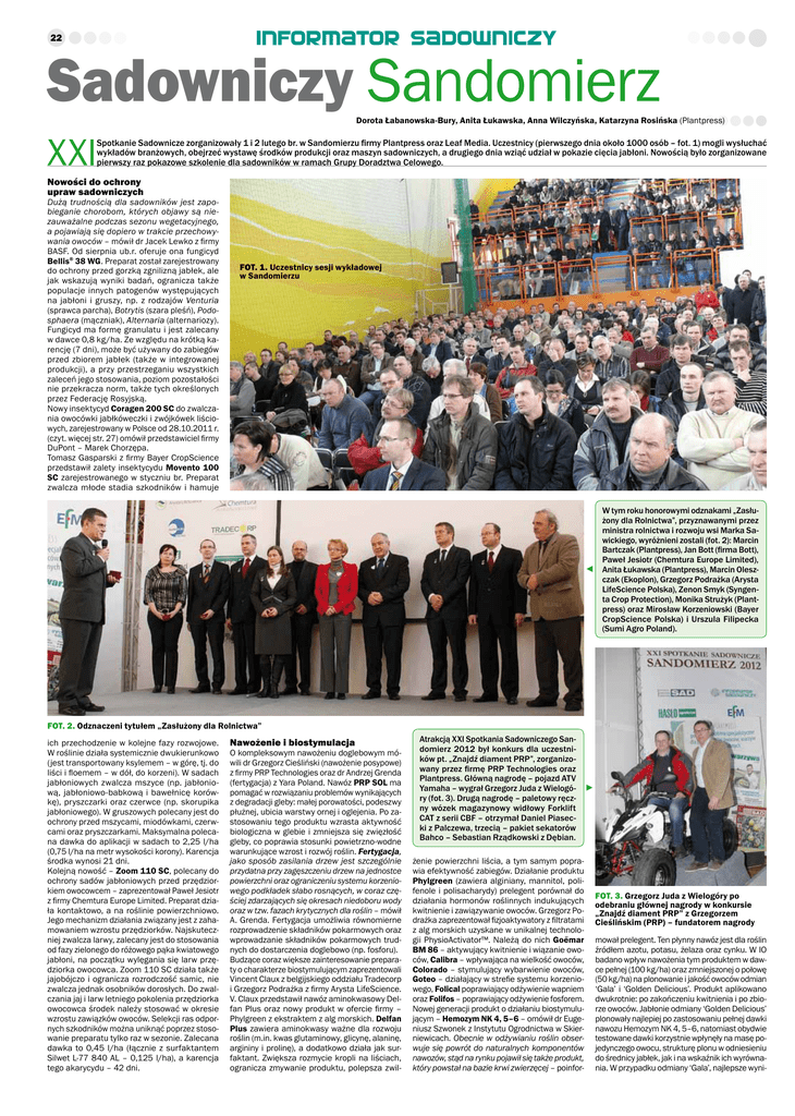 22 Sadowniczy Sandomierz Dorota Łabanowska-Bury, Anita Łukawska, Anna Wilczyńska, Katarzyna Rosińska (Plantpress) XXI Spotkanie Sadownicze zorganizowały 1 i 2 lutego br. w Sandomierzu firmy Plantpress oraz Leaf Media. Uczestnicy (pierwszego dnia około 1000 osób – fot. 1) mogli wysłuchać wykładów branżowych, obejrzeć wystawę środków produkcji oraz maszyn sadowniczych, a drugiego dnia wziąć udział w pokazie cięcia jabłoni. Nowością było zorganizowane pierwszy raz pokazowe szkolenie dla sadowników w ramach Grupy Doradztwa Celowego. Nowości do ochrony upraw sadowniczych Dużą trudnością dla sadowników jest zapobieganie chorobom, których objawy są niezauważalne podczas sezonu wegetacyjnego, a pojawiają się dopiero w trakcie przechowywania owoców – mówił dr Jacek Lewko z firmy BASF. Od sierpnia ub.r. oferuje ona fungicyd Bellis® 38 WG. Preparat został zarejestrowany do ochrony przed gorzką zgnilizną jabłek, ale jak wskazują wyniki badań, ogranicza także populacje innych patogenów występujących na jabłoni i gruszy, np. z rodzajów Venturia (sprawca parcha), Botrytis (szara pleśń), Podosphaera (mączniak), Alternaria (alternariozy). Fungicyd ma formę granulatu i jest zalecany w dawce 0,8 kg/ha. Ze względu na krótką karencję (7 dni), może być używany do zabiegów przed zbiorem jabłek (także w integrowanej produkcji), a przy przestrzeganiu wszystkich zaleceń jego stosowania, poziom pozostałości nie przekracza norm, także tych określonych przez Federację Rosyjską. Nowy insektycyd Coragen 200 SC do zwalczania owocówki jabłkóweczki i zwójkówek liściowych, zarejestrowany w Polsce od 28.10.2011 r. (czyt. więcej str. 27) omówił przedstawiciel firmy DuPont – Marek Chorzępa. Tomasz Gasparski z firmy Bayer CropScience przedstawił zalety insektycydu Movento 100 SC zarejestrowanego w styczniu br. Preparat zwalcza młode stadia szkodników i hamuje FOT. 1. Uczestnicy sesji wykładowej w Sandomierzu W tym roku honorowymi odznakami „Zasłużony dla Rolnictwa”, przyznawanymi przez ministra rolnictwa i rozwoju wsi Marka Sawickiego, wyróżnieni zostali (fot. 2): Marcin Bartczak (Plantpress), Jan Bott (firma Bott), Paweł Jesiotr (Chemtura Europe Limited), ◄ Anita Łukawska (Plantpress), Marcin Oleszczak (Ekoplon), Grzegorz Podrażka (Arysta LifeScience Polska), Zenon Smyk (Syngenta Crop Protection), Monika Strużyk (Plantpress) oraz Mirosław Korzeniowski (Bayer CropScience Polska) i Urszula Filipecka (Sumi Agro Poland). FOT. 2. Odznaczeni tytułem „Zasłużony dla Rolnictwa” ich przechodzenie w kolejne fazy rozwojowe. W roślinie działa systemicznie dwukierunkowo (jest transportowany ksylemem – w górę, tj. do liści i floemem – w dół, do korzeni). W sadach jabłoniowych zwalcza mszyce (np. jabłoniową, jabłoniowo-babkową i bawełnicę korówkę), pryszczarki oraz czerwce (np. skorupika jabłoniowego). W gruszowych polecany jest do ochrony przed mszycami, miodówkami, czerwcami oraz pryszczarkami. Maksymalna polecana dawka do aplikacji w sadach to 2,25 l/ha (0,75 l/ha na metr wysokości korony). Karencja środka wynosi 21 dni. Kolejną nowość – Zoom 110 SC, polecany do ochrony sadów jabłoniowych przed przędziorkiem owocowcem – zaprezentował Paweł Jesiotr z firmy Chemtura Europe Limited. Preparat działa kontaktowo, a na roślinie powierzchniowo. Jego mechanizm działania związany jest z zahamowaniem wzrostu przędziorków. Najskuteczniej zwalcza larwy, zalecany jest do stosowania od fazy zielonego do różowego pąka kwiatowego jabłoni, na początku wylęgania się larw przędziorka owocowca. Zoom 110 SC działa także jajobójczo i ogranicza rozrodczość samic, nie zwalcza jednak osobników dorosłych. Do zwalczania jaj i larw letniego pokolenia przędziorka owocowca środek należy stosować w okresie wzrostu zawiązków owoców. Selekcji ras odpornych szkodników można uniknąć poprzez stosowanie preparatu tylko raz w sezonie. Zalecana dawka to 0,45 l/ha (łącznie z surfaktantem Silwet L-77 840 AL – 0,125 l/ha), a karencja tego akarycydu – 42 dni. Nawożenie i biostymulacja O kompleksowym nawożeniu doglebowym mówili dr Grzegorz Cieśliński (nawożenie posypowe) z firmy PRP Technologies oraz dr Andrzej Grenda (fertygacja) z Yara Poland. Nawóz PRP SOL ma pomagać w rozwiązaniu problemów wynikających z degradacji gleby: małej porowatości, podeszwy płużnej, ubicia warstwy ornej i oglejenia. Po zastosowaniu tego produktu wzrasta aktywność biologiczna w glebie i zmniejsza się zwięzłość gleby, co poprawia stosunki powietrzno-wodne warunkujące wzrost i rozwój roślin. Fertygacja, jako sposób zasilania drzew jest szczególnie przydatna przy zagęszczeniu drzew na jednostce powierzchni oraz ograniczeniu systemu korzeniowego podkładek słabo rosnących, w coraz częściej zdarzających się okresach niedoboru wody oraz w tzw. fazach krytycznych dla roślin – mówił A. Grenda. Fertygacja umożliwia równomierne rozprowadzenie składników pokarmowych oraz wprowadzanie składników pokarmowych trudnych do dostarczenia doglebowo (np. fosforu). Budzące coraz większe zainteresowanie preparaty o charakterze biostymulującym zaprezentowali Vincent Claux z belgijskiego oddziału Tradecorp i Grzegorz Podrażka z firmy Arysta LifeScience. V. Claux przedstawił nawóz aminokwasowy Delfan Plus oraz nowy produkt w ofercie firmy – Phylgreen z ekstraktem z alg morskich. Delfan Plus zawiera aminokwasy ważne dla rozwoju roślin (m.in. kwas glutaminowy, glicynę, alaninę, argininy i prolinę), a dodatkowo działa jak surfaktant. Zwiększa rozmycie kropli na liściach, ogranicza zmywanie produktu, polepsza zwil- Atrakcją XXI Spotkania Sadowniczego Sandomierz 2012 był konkurs dla uczestników pt. „Znajdź diament PRP”, zorganizowany przez firmę PRP Technologies oraz Plantpress. Główną nagrodę – pojazd ATV Yamaha – wygrał Grzegorz Juda z Wielogóry (fot. 3). Drugą nag