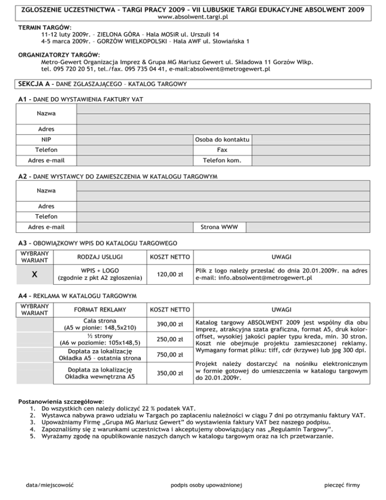 ZGŁOSZENIE UCZESTNICTWA - TARGI PRACY 2009 - VII LUBUSKIE TARGI EDUKACYJNE ABSOLWENT 2009 www.absolwent.targi.pl TERMIN TARGÓW: 11-12 luty 2009r. – ZIELONA GÓRA – Hala MOSiR ul. Urszuli 14 4-5 marca 2009r. – GORZÓW WIELKOPOLSKI – Hala AWF ul. Słowiańska 1 ORGANIZATORZY TARGÓW: Metro-Gewert Organizacja Imprez & Grupa MG Mariusz Gewert ul. Składowa 11 Gorzów Wlkp. tel. 095 720 20 51, tel./fax. 095 735 04 41, e-mail:[email protected] SEKCJA A – DANE ZGŁASZAJĄCEGO – KATALOG TARGOWY A1 - DANE DO WYSTAWIENIA FAKTURY VAT Nazwa Adres NIP Osoba do kontaktu Telefon Fax Adres e-mail Telefon kom. A2 - DANE WYSTAWCY DO ZAMIESZCZENIA W KATALOGU TARGOWYM Nazwa Adres Telefon Adres e-mail Strona WWW A3 – OBOWIĄZKOWY WPIS DO KATALOGU TARGOWEGO WYBRANY WARIANT RODZAJ USŁUGI KOSZT NETTO UWAGI X WPIS + LOGO (zgodnie z pkt A2 zgłoszenia) 120,00 zł Plik z logo naleŜy przesłać do dnia 20.01.2009r. na adres e-mail: [email protected] KOSZT NETTO UWAGI 390,00 zł Katalog targowy ABSOLWENT 2009 jest wspólny dla obu imprez, atrakcyjna szata graficzna, format A5, druk koloroffset, wysokiej jakości papier typu kreda, min. 30 stron. Koszt nie obejmuje projektu zamieszczonej reklamy. Wymagany format pliku: tiff, cdr (krzywe) lub jpg 300 dpi. A4 – REKLAMA W KATALOGU TARGOWYM WYBRANY WARIANT FORMAT REKLAMY Cała strona (A5 w pionie: 148,5x210) ½ strony (A6 w poziomie: 105x148,5) Dopłata za lokalizację Okładka A5 – ostatnia strona Dopłata za lokalizację Okładka wewnętrzna A5 250,00 zł 750,00 zł 350,00 zł Projekt naleŜy dostarczyć na nośniku elektronicznym w formie gotowej do umieszczenia w katalogu targowym do 20.01.2009r. Postanowienia szczegółowe: 1. Do wszystkich cen naleŜy doliczyć 22 % podatek VAT. 2. Wystawca nabywa prawo udziału w Targach po zapłaceniu naleŜności w ciągu 7 dni po otrzymaniu faktury VAT. 3. UpowaŜniamy Firmę „Grupa MG Mariusz Gewert” do wystawienia faktury VAT bez naszego podpisu. 4. Zapoznaliśmy się z warunkami uczestnictwa i akceptujemy obowiązujący nas „Regulamin Targowy”. 5. WyraŜamy zgodę na opublikowanie naszych danych w katalogu targowym oraz na ich przetwarzanie. data/miejscowość podpis osoby upowaŜnionej pieczęć firmy ZGŁOSZENIE UCZESTNICTWA - TARGI PRACY 2009 - VII LUBUSKIE TARGI EDUKACYJNE ABSOLWENT 2009 www.absolwent.targi.pl SEKCJA B – ZGŁOSZENIE UCZESTNICTWA – ZIELONA GÓRA – 11-12 luty 2009r. – Hala MOSIR ul. Urszuli 14 ZIELONA GÓRA - WYBRANY WARIANT B1 – STOISKO W ZABUDOWIE TARGOWEJ POWIERZCHNIA STOISKA KOSZT NETTO 4,00 m2 z wyposaŜeniem 6,00 m2 z wyposaŜeniem 149,00 zł 8,00 m2 z wyposaŜeniem 9,00 m2 z wyposaŜeniem Napis na fryzie ZIELONA GÓRA - WYBRANY WARIANT 30,00 zł szt. WYPOSAśENIE STOISKA za 1 m2 wykładzina dywanowa, gniazdo 230V B3 – TYP STOISKA WYBRANY WARIANT TYP STOISKA KOSZT NETTO UWAGI za stoisko bez dopłat Dostęp do stoiska z jednego ciągu komunikacyjnego Stoisko naroŜne 250,00 zł Dostęp do stoiska z dwóch ciągów komunikacyjnych Stoisko czołowe 350,00 zł Dostęp do stoiska z trzech ciągów komunikacyjnych Stoisko szeregowe ZIELONA GÓRA - B4 – WYPOSAśENIE DODATKOWE STOISKA RODZAJ WYPOSAśENIA KOSZT NETTO za 1 szt. WYBRANY WARIANT RODZAJ WYPOSAśENIA KOSZT NETTO za 1 szt. Lada systemowa 60,00 zł Krzesło 15,00 zł Stojak na foldery 60,00 zł Stolik okrągły 30,00 zł ZIELONA GÓRA - WYBRANY WARIANT B5 – SPECJALNY FRYZ STOISKA RODZAJ FRYZU KOSZT NETTO Logo na fryzie stoiska 70,00 zł Fryz długi (195 cm x 35 cm) 150,00 zł wg projektu wystawcy Fryz krótki (97 cm x 35 cm) 90,00 zł wg projektu wystawcy ZIELONA GÓRA - WYBRANY WARIANT Treść: KOSZT NETTO 95,00 zł WYBRANY WARIANT ściany w kolorze białym, wykładzina dywanowa, gniazdo 230V, punkt świetlny, stolik, dwa krzesła, lada, wieszak na ubrania, kosz na śmieci ściany w kolorze białym, wykładzina dywanowa, gniazdo 230V, punkt świetlny, stolik, cztery krzesła, dwie lady, wieszak na ubrania, kosz na śmieci B2 – POWIERZCHNIA NIEZABUDOWANA POWIERZCHNIA STOISKA ZIELONA GÓRA - WYPOSAśENIE STOISKA za 1 m2 UWAGI Nadruk na fryzie stoiska wg indywidualnego projektu wystawcy. Gotowy projekt naleŜy przesłać w formie pliku cdr (krzywe) lub tiff na adres e-mail: [email protected] W razie pytań prosimy o kontakt: tel. 0696 008 886 B6 – USŁUGI REKLAMOWE RODZAJ USŁUGI KolportaŜ materiałów reklamowych Emisja reklamy w radio targowym – 10 emisji Emisja reklamy w radio targowym – 20 emisji data/miejscowość KOSZT NETTO UWAGI 290 zł KolportaŜ za pośrednictwem hostess organizatora 150 zł Gotowy spot reklamowy(max 30 sekund) lub tekst maszynopisu (max 60 słów) naleŜy przesłać na płycie CD do dnia 5 lutego 2009r. KaŜda następna dodatkowa emisja – 10 zł netto. 260 zł podpis osoby upowaŜnionej pieczęć firmy ZGŁOSZENIE UCZESTNICTWA - TARGI PRACY 2009 - VII LUBUSKIE TARGI EDUKACYJNE ABSOLWENT 2009 www.absolwent.targi.pl SEKCJA C – ZGŁOSZENIE UCZESTNICTWA – GORZÓW WIELKOPOLSKI – 4-5 marca 2009r. – Hala AWF ul. Słowiańska 1 GORZÓW WIELKOPOLSKI - WYBRANY WARIANT C1 – STOISKO W ZABUDOWIE TARGOWEJ POWIERZCHNIA STOISKA KOSZT NETTO 4,00 m2 z wyposaŜeniem 6,00 m2 z wyposaŜeniem 149,00 zł 8,00 m2 z wyposaŜeniem 9,00 m2 z wyposaŜeniem Napis na fryzie GORZÓW WIELKOPOLSKI - WYBRANY WARIANT WYPOSAśENIE STOISKA za 1 m2 30,00 zł szt. ściany w kolorze białym, wykładzina dywanowa, gniazdo 230V, punkt świetlny, stolik, dwa krzesła, lada, wieszak na ubrania, kosz na śmieci ściany w kolorze białym, wykładzina dywanowa, gniazdo 230V, punkt świetlny, stolik, cztery krzesła, dwie lady, wieszak na ubrania, kosz na śmieci Treść: C2 – POWIERZCHNIA NIEZABUDOWANA POWIERZCHNIA STOISKA KOSZT NETTO WYPOSAśENIE STOISKA za 1 m2 95,00 zł GORZÓW WIELKOPOLSKI - WYBRANY WARIANT C3 – TYP STOISKA TYP STOISKA Stoisko szeregowe Stoisko naroŜne 250,00 zł Dostęp do stoiska z dwóch ciągów komunikacyjnych Stoisko czołowe 350,00 zł Dostęp do stoiska z trzech ciągów