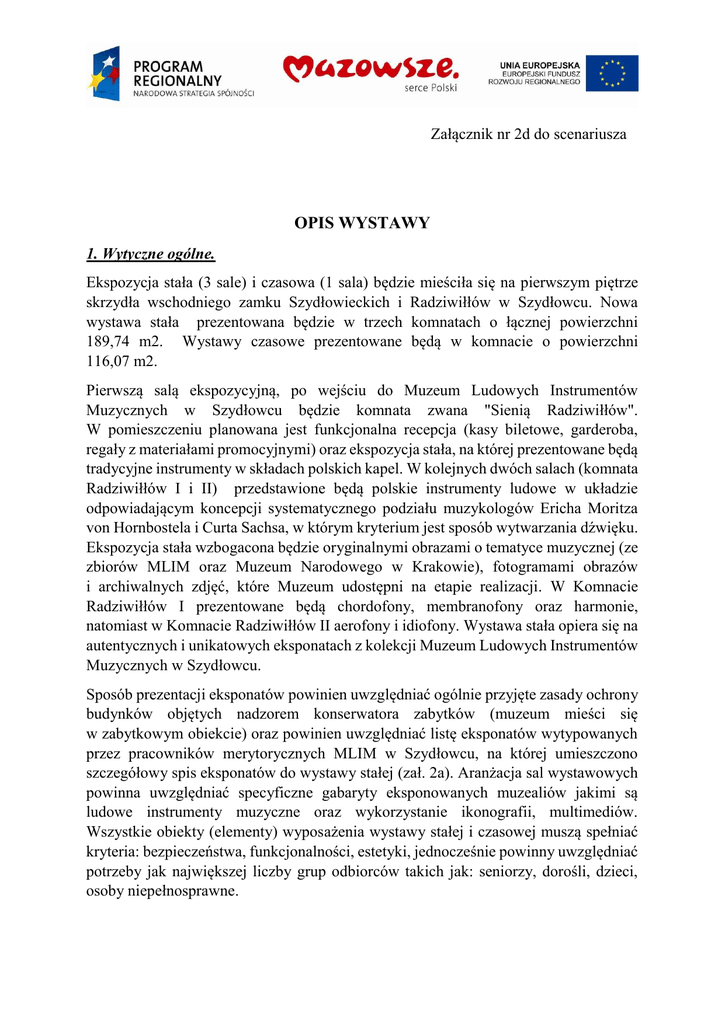 Załącznik nr 2d do scenariusza OPIS WYSTAWY 1. Wytyczne ogólne. Ekspozycja stała (3 sale) i czasowa (1 sala) będzie mieściła się na pierwszym piętrze skrzydła wschodniego zamku Szydłowieckich i Radziwiłłów w Szydłowcu. Nowa wystawa stała prezentowana będzie w trzech komnatach o łącznej powierzchni 189,74 m2. Wystawy czasowe prezentowane będą w komnacie o powierzchni 116,07 m2. Pierwszą salą ekspozycyjną, po wejściu do Muzeum Ludowych Instrumentów Muzycznych w Szydłowcu będzie komnata zwana "Sienią Radziwiłłów". W pomieszczeniu planowana jest funkcjonalna recepcja (kasy biletowe, garderoba, regały z materiałami promocyjnymi) oraz ekspozycja stała, na której prezentowane będą tradycyjne instrumenty w składach polskich kapel. W kolejnych dwóch salach (komnata Radziwiłłów I i II) przedstawione będą polskie instrumenty ludowe w układzie odpowiadającym koncepcji systematycznego podziału muzykologów Ericha Moritza von Hornbostela i Curta Sachsa, w którym kryterium jest sposób wytwarzania dźwięku. Ekspozycja stała wzbogacona będzie oryginalnymi obrazami o tematyce muzycznej (ze zbiorów MLIM oraz Muzeum Narodowego w Krakowie), fotogramami obrazów i archiwalnych zdjęć, które Muzeum udostępni na etapie realizacji. W Komnacie Radziwiłłów I prezentowane będą chordofony, membranofony oraz harmonie, natomiast w Komnacie Radziwiłłów II aerofony i idiofony. Wystawa stała opiera się na autentycznych i unikatowych eksponatach z kolekcji Muzeum Ludowych Instrumentów Muzycznych w Szydłowcu. Sposób prezentacji eksponatów powinien uwzględniać ogólnie przyjęte zasady ochrony budynków objętych nadzorem konserwatora zabytków (muzeum mieści się w zabytkowym obiekcie) oraz powinien uwzględniać listę eksponatów wytypowanych przez pracowników merytorycznych MLIM w Szydłowcu, na której umieszczono szczegółowy spis eksponatów do wystawy stałej (zał. 2a). Aranżacja sal wystawowych powinna uwzględniać specyficzne gabaryty eksponowanych muzealiów jakimi są ludowe instrumenty muzyczne oraz wykorzystanie ikonografii, multimediów. Wszystkie obiekty (elementy) wyposażenia wystawy stałej i czasowej muszą spełniać kryteria: bezpieczeństwa, funkcjonalności, estetyki, jednocześnie powinny uwzględniać potrzeby jak największej liczby grup odbiorców takich jak: seniorzy, dorośli, dzieci, osoby niepełnosprawne. 2. Specyfikacja techniczna wyposażenia sal ekspozycyjnych: Wszystkie gabloty winny być zamykane wyposażone w zintegrowane oświetlenie Sala 1 (powierzchnia 97,92 m2) 1) Stojak pod panel dotykowy 22 cale. Konstrukcja wykonana z metalu/ lub i drewna (spójna z projektem gablot). 2) Recepcja a) Kontuar recepcji (1 sztuka). Konstrukcja wykonana z metalu/ lub i drewna (spójna z projektem gablot). b) Zamykana gablota ( minimum1 sztuka) z pamiątkami do sprzedaży. Konstrukcja wykonana z metalu/ lub i drewna (spójna z projektem gablot). c) Zestaw obiektów służących za garderobę wraz z miejscem przeznaczonym dla zwiedzających do odpoczynku. Konstrukcja wykonana z metalu/ lub i drewna (spójna z projektem gablot). 3) Gabloty 8-12 sztuk (ilość zależna od podziału merytorycznego) a) Gablota stojąca na obiekty, konstrukcja wykonana z metalu/ lub i drewna (do ustalenia na etapie projektu), szklana z zintegrowanym oświetleniem oraz elementem zamknięcia uniemożliwiającym osobom nieupoważnionym jej otwarcie. Sala 2 (powierzchnia 47,32 m2) 1) Stojak pod panel dotykowy 22 cale. Konstrukcja wykonana z metalu/ lub i drewna (spójna z projektem gablot). 2) Gabloty 8-12 sztuk (ilość zależna od podziału merytorycznego) Gabloty stojące na obiekty, konstrukcja wykonana z metalu/ lub i drewna (do ustalenia na etapie projektu), szklana z zintegrowanym oświetleniem oraz elementem zamknięcia uniemożliwiającym osobom nieupoważnionym jej otwarcie. Sala 3 (powierzchnia 44,50 m2) 1) Stojaka pod panel dotykowy 22 cale. Konstrukcja wykonana z metalu/ lub i drewna (spójna z projektem gablot). 2) Gabloty 9-12 sztuk (w zależności od podziału merytorycznego) Gabloty stojące na obiekty, konstrukcja wykonana z metalu/ lub i drewna (do ustalenia na etapie projektu), szklana z zintegrowanym oświetleniem oraz elementem zamknięcia uniemożliwiającym osobom nieupoważnionym jej otwarcie. 3) Stanowisko dla instrumentu wolnostojącego. Konstrukcja wykonana z metalu/ lub i drewna (do ustalenia na etapie projektu) Sala 4 (powierzchnia 116,07 m2) – wystaw czasowych 1) Stojak pod panel dotykowy 22 cale (2 sztuki). Konstrukcja wykonana z metalu/ lub i drewna (spójna z projektem gablot). 2) Gabloty 14-16 sztuk (ilość zależna od podziału merytorycznego) Gabloty stojące na obiekty, konstrukcja wykonana z metalu/ lub i drewna (do ustalenia na etapie projektu), szklana z zintegrowanym oświetleniem oraz elementem zamknięcia uniemożliwiającym osobom nieupoważnionym jej otwarcie. 3) Ścianki modułowe Systemu modułowych ścian ekspozycyjnych, umożliwiających tworzenia układów liniowych oraz okładów pod katem 90 stopni. Konstrukcja wykonana z metalu, aluminium lub drewna (do ustalenia na etapie projektu) z przytwierdzonymi gładkimi, jednorodnymi płytami osłaniającymi. Opcjonalnie wyposażone w zintegrowane oświetlenie. Łączna długość modułów w przedziale 24-32 metry. Wytyczne dotyczące ścian modułowych (szerokość i wysokość może być inna niż poniżej): Wymiary 1 modułu: szerokość: nie niej niż 100 cm – nie więcej niż 200 cm, wysokość: nie mniej niż 230 cm, grubość: od 6 cm do 15 cm. Maksymalna waga ścianki - ok. 50 kg. Konstrukcja z profili metalowych lub aluminiowych. Profile konstrukcyjne obłożenie - płytą mdf. Wnętrze ścianki wypełnione papierową płytą o strukturze plastra miodu pełniącą funkcję usztywniającą - grubość zewnętrznej płyty mdf - nie mniej niż 1 cm. Moduł ścianki wyposażony w system zawieszeń pozwalający na obustronną ekspozycję. Systemo