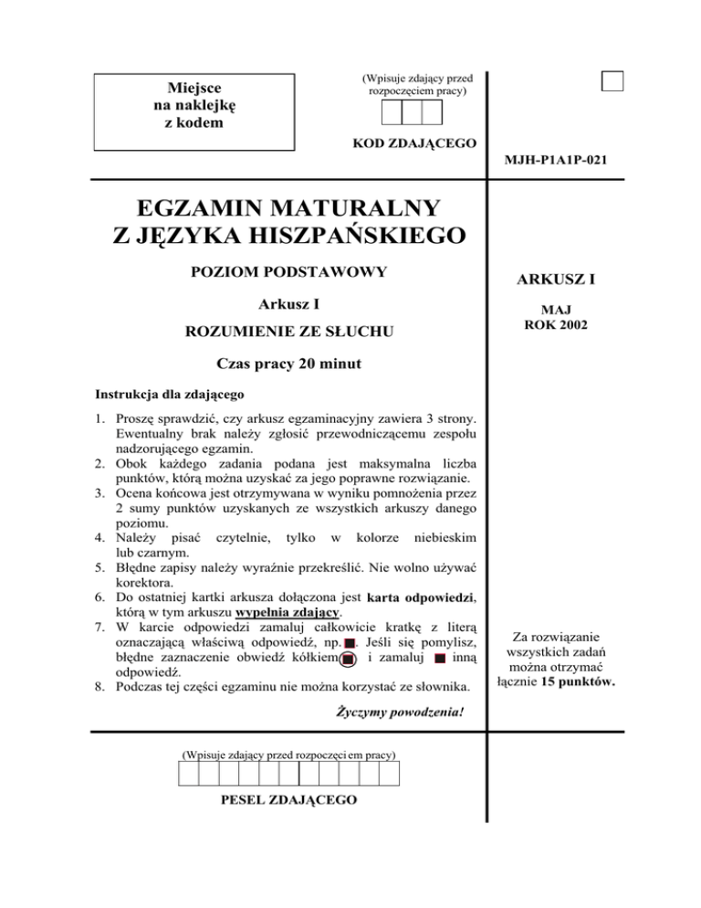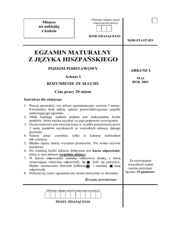 (Wpisuje zdaj¹cy przed rozpoczêciem pracy) Miejsce na naklejkê z kodem KOD ZDAJ¥CEGO MJH-P1A1P-021 EGZAMIN MATURALNY Z JÊZYKA HISZPAÑSKIEGO POZIOM PODSTAWOWY Arkusz I ROZUMIENIE ZE S£UCHU ARKUSZ I MAJ ROK 2002 Czas pracy 20 minut Instrukcja dla zdaj¹cego 1. Proszê sprawdziæ, czy arkusz egzaminacyjny zawiera 3 strony. Ewentualny brak nale¿y zg³osiæ przewodnicz¹cemu zespo³u nadzoruj¹cego egzamin. 2. Obok ka¿dego zadania podana jest maksymalna liczba punktów, któr¹ mo¿na uzyskaæ za jego poprawne rozwi¹zanie. 3. Ocena koñcowa jest otrzymywana w wyniku pomno¿enia przez 2 sumy punktów uzyskanych ze wszystkich arkuszy danego poziomu. 4. Nale¿y pisaæ czytelnie, tylko w kolorze niebieskim lub czarnym. 5. B³êdne zapisy nale¿y wyranie przekreliæ. Nie wolno u¿ywaæ korektora. 6. Do ostatniej kartki arkusza do³¹czona jest karta odpowiedzi, któr¹ w tym arkuszu wype³nia zdaj¹cy. 7. W karcie odpowiedzi zamaluj ca³kowicie kratkê z liter¹ oznaczaj¹c¹ w³aciw¹ odpowied, np. . Jeli siê pomylisz, b³êdne zaznaczenie obwied kó³kiem i zamaluj inn¹ odpowied. 8. Podczas tej czêci egzaminu nie mo¿na korzystaæ ze s³ownika. ¯yczymy powodzenia! (Wpisuje zdaj¹cy przed rozpoczêci em pracy) PESEL ZDAJ¥CEGO Za rozwi¹zanie wszystkich zadañ mo¿na otrzymaæ ³¹cznie 15 punktów. Egzamin maturalny z jêzyka hiszpañskiego Arkusz I 2 ___________________________________________________________________________________ Zadanie 1. (7 pkt) Zapoznaj siê ze zdaniami podanymi poni¿ej. Us³yszysz dwukrotnie fragment wywiadu ze znanym hiszpañskim mistrzem sportu motocyklowego. Na podstawie wys³uchanych informacji zdecyduj, które z podanych zdañ s¹ prawdziwe (Verdadero -V), a które fa³szywe (Falso-F). Zaznacz znakiem X odpowiedni¹ rubrykê w tabeli. Za ka¿de poprawne rozwi¹zanie otrzymasz 1 punkt. V 1.1. Álex Crevillé sigue viviendo en el pueblo donde nació. 1.2. El hermano de Álex también quería ser piloto, pero se perdió por la montaña con su moto. 1.3. En sus ratos libres a Álex le gusta cabalgar por la montaña. 1.4. Su novia Ana es de un carácter muy estable y cuida mucho su salud. 1.5. Para el espíritu de lucha de Álex, ganar y llegar a la meta el primero es lo más importante. 1.6. Los padres de Álex Crevillé le compraron su primera moto, cuando tenía cinco años, porque él mismo se la había pedido. 1.7. La moto de Álex es muy rápida y en las carreras desarrolla una velocidad de hasta 125 km por hora. PRZENIE ROZWI¥ZANIE NA KARTÊ ODPOWIEDZI. F Egzamin maturalny z jêzyka hiszpañskiego Arkusz I 3 ___________________________________________________________________________________ Zadanie 2. (8 pkt) Wys³uchaj dwukrotnie sprawozdania z przeprowadzonego w Hiszpanii sonda¿u. Wród zdañ oznaczonych literami od A. do P. jest 8, których treæ jest zgodna z informacjami podanymi w sprawozdaniu. Wybierz i zaznacz te zdania, wstawiaj¹c przy nich w tabeli znak X. Za ka¿de poprawnie wybrane zdanie otrzymasz 1 punkt. A. B. C. D. La mayoría de los españoles no tiene motivos para quejarse de su situación. Los españoles saben cuidar sus casas y mantener buenas relaciones familiares. Los españoles distribuyen su tiempo entre la vida profesional y personal razonablemente. La situación económica de las mujeres ha mejorado considerablemente. Los españoles tratan bien a la gente de otras razas, religiones y orientaciones políticas. La democracia española es todavía muy joven y le es difícil resolver todos sus F. problemas. Cuando ocurre una desgracia, los españoles prestan su apoyo y colaboración al G. necesitado. A los españoles les gusta gastar dinero en los bares y restaurantes. H. E. I. J. K. L. M. N. En el futuro, los españoles esperan ganar más. Los españoles gozan de buena salud porque disponen de un auténtico ocio. Los españoles saben que hay que conservar y mejorar el entorno natural. Los españoles no han tomado ninguna iniciativa para evitar el deterioro de las aguas. La basura dejada por los turistas cada año, preocupa a los ecologistas españoles. En España ya no solamente el perro puede ser el mejor amigo del hombre. O. El desempleo en España sigue siendo muy elevado y no hay quien pueda cambiarlo. P. Los españoles devuelven a sus mascotas exóticas a la selva. PRZENIE ROZWI¥ZANIE NA KARTÊ ODPOWIEDZI.