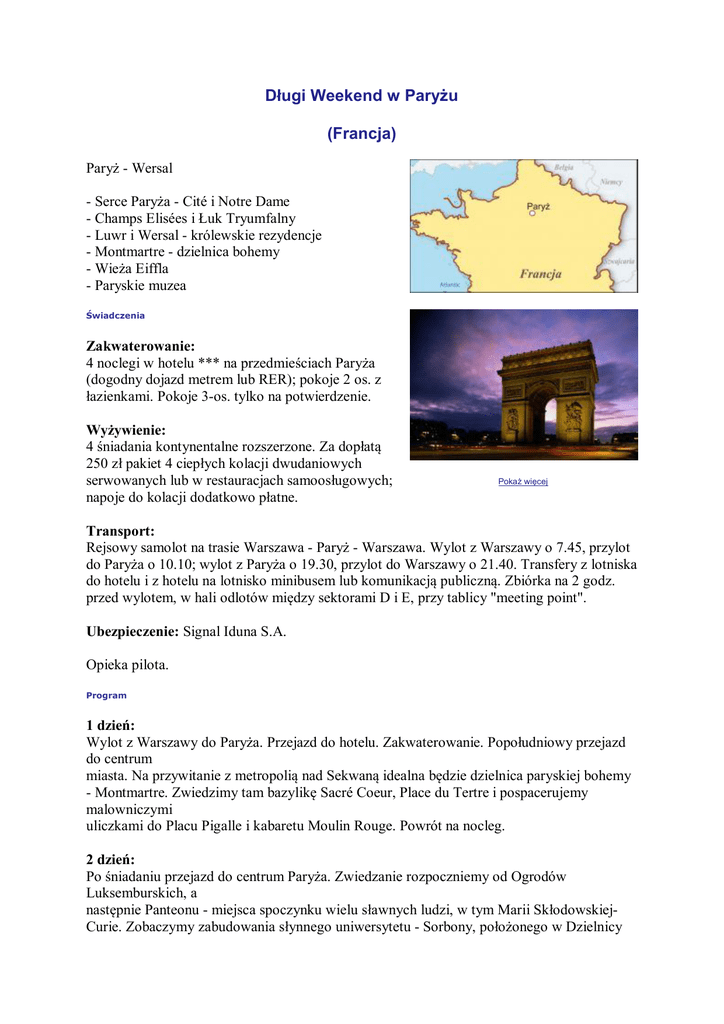 Długi Weekend w Paryżu (Francja) Paryż - Wersal - Serce Paryża - Cité i Notre Dame - Champs Elisées i Łuk Tryumfalny - Luwr i Wersal - królewskie rezydencje - Montmartre - dzielnica bohemy - Wieża Eiffla - Paryskie muzea Świadczenia Zakwaterowanie: 4 noclegi w hotelu *** na przedmieściach Paryża (dogodny dojazd metrem lub RER); pokoje 2 os. z łazienkami. Pokoje 3-os. tylko na potwierdzenie. Wyżywienie: 4 śniadania kontynentalne rozszerzone. Za dopłatą 250 zł pakiet 4 ciepłych kolacji dwudaniowych serwowanych lub w restauracjach samoosługowych; napoje do kolacji dodatkowo płatne. Pokaż więcej Transport: Rejsowy samolot na trasie Warszawa - Paryż - Warszawa. Wylot z Warszawy o 7.45, przylot do Paryża o 10.10; wylot z Paryża o 19.30, przylot do Warszawy o 21.40. Transfery z lotniska do hotelu i z hotelu na lotnisko minibusem lub komunikacją publiczną. Zbiórka na 2 godz. przed wylotem, w hali odlotów między sektorami D i E, przy tablicy "meeting point". Ubezpieczenie: Signal Iduna S.A. Opieka pilota. Program 1 dzień: Wylot z Warszawy do Paryża. Przejazd do hotelu. Zakwaterowanie. Popołudniowy przejazd do centrum miasta. Na przywitanie z metropolią nad Sekwaną idealna będzie dzielnica paryskiej bohemy - Montmartre. Zwiedzimy tam bazylikę Sacré Coeur, Place du Tertre i pospacerujemy malowniczymi uliczkami do Placu Pigalle i kabaretu Moulin Rouge. Powrót na nocleg. 2 dzień: Po śniadaniu przejazd do centrum Paryża. Zwiedzanie rozpoczniemy od Ogrodów Luksemburskich, a następnie Panteonu - miejsca spoczynku wielu sławnych ludzi, w tym Marii SkłodowskiejCurie. Zobaczymy zabudowania słynnego uniwersytetu - Sorbony, położonego w Dzielnicy Łacińskiej, przejdziemy się słynnym handlowym bulwarem Saint-Germain. Przejazd do najstarszej części stolicy Francji - wyspy Cité. Znajduje się tu Katedra Notre Dame, Pałac Sprawiedliwości, Conciergerie - zamek, który przez wieki był więzieniem oraz Sainte Chapelle, słynąca ze wspaniałych witraży. Następnie zobaczymy Hotel de Ville, czyli paryski ratusz, i przejdziemy pod nowoczesne Centrum Pompidou mijając po drodze Plac Chatelet i Wieżę św. Jakuba. Zajrzymy także w okolice Hal Paryskich, miejsca słynnego targowiska i zobaczymy Fontannę Niewiniątek. Na koniec dnia przeniesiemy się na drugi brzeg Sekwany, gdzie w budynku dawnego dworca kolejowego, a dziś Musée d Orsay znajdują się bogate zbiory malarstwa, m.in. impresjonistów. Powrót na nocleg. 3 dzień: Po śniadaniu tego dnia będzie wycieczka poza bramy Paryża. W Wersalu obejrzymy słynny zespół pałacowo-parkowy Ludwika XIV, który był także siedzibą kolejnych królów i uznawany jest za wzorzec barokowej rezydencji. Zwiedzanie bogactwa wnętrz, wraz z pamiątkami licznych wydarzeń historycznych (w tym traktatu z 1919 roku) oraz parku zajmie około pół dnia. Wracając do Paryża poznamy jego współczesne oblicze - dzielnicę La Defense, pełnego stalowo-szklanych wieżowców, będących siedzibami wielkich koncernów z nowoczesnym łukiem Grand Arche. Następnie przejazd pod Łuk Tryumfalny. Stąd przespacerujemy się po Champs Elisées. Na koniec, dla chętnych, wizyta w Luwrze: każdy będzie mógł obejrzeć to, co z tego całego skarbca sztuki, najbardziej go interesuje. Powrót na nocleg. 4 dzień: Po śniadaniu przejazd do centrum. Przejazd do Opery Garnier - zwiedzanie starszej z dwóch paryskich oper, perły XIX-wiecznej architektury, a następnie wizyta w Muzeum Perfum Fragonard. Później przejdziemy przez Plac Vendome z kolumną upamiętniającą zwycięstwo pod Austerlitz, Hotelem Ritz i domem, w którym zmarł Chopin. Kolejne punkty programu to Ogrody Tuileries - dobre miejsce na odpoczynek po tylu wrażeniach i Plac Zgody. Wreszcie, z Wieży Eiffla zobaczymy panoramę znanego już nam miasta. Na koniec, ujrzymy Paryż z perspektywy Sekwany, w czasie rejsu statkiem. Widok oświetlonych bulwarów, mostów, licznych paryskich hôtels, czyli pałaców na pewno utkwi w pamięci. Powrót na nocleg. 5 dzień: Po śniadaniu wykwaterowanie, złożenie bagaży i przejazd do centrum miasta na pożegnalny spacer po Paryżu. Odwiedzimy stary cmentarz Pre-Lachaise, gdzie spoczywają m.in. Fryderyk Chopin, Edith Piaf, Jim Morrison, Oscar Wilde i tysiące innych, znanych ludzi. Powrót po bagaże i przejazd na lotnisko. Wylot do Warszawy. Informacje praktyczne Cena podstawowa nie zawiera: biletów wstępu do zwiedzanych obiektów, rejsu po Sekwanie oraz opłat za komunikację miejską i podmiejską oraz miejscowych przewodników - orientacyjny koszt: ok. 130 EUR. Pilot rozlicza się z grupą z pobranych kwot na cele programowe. Koszty płacone za całą grupę (np. za lokalnych przewodników) są dzielone na wszystkich jej uczestników. Podczas dojazdów do Paryża i zwiedzania grupa porusza się komunikacją publiczną (kolejką RER, metrem). Kolejność realizacji programu może ulec zmianie. Terminy i ceny Nr grupy Hotel *** na przedmieściach Paryża Data Cena PFTP01 30.04 - 04.05 2899 zł 2799 zł Promocja PFTP02 09.07 - 13.07 2649 zł 2549 zł Promocja PFTP03 13.08 - 17.08 2649 zł 2549 zł Promocja PFTP04 10.09 - 14.09 2649 zł 2549 zł Promocja Rezerwuj kalkulator Rezerwuj kalkulator Rezerwuj kalkulator Rezerwuj kalkulator (skrót: HTNPP) 5 dni 5 dni 5 dni 5 dni